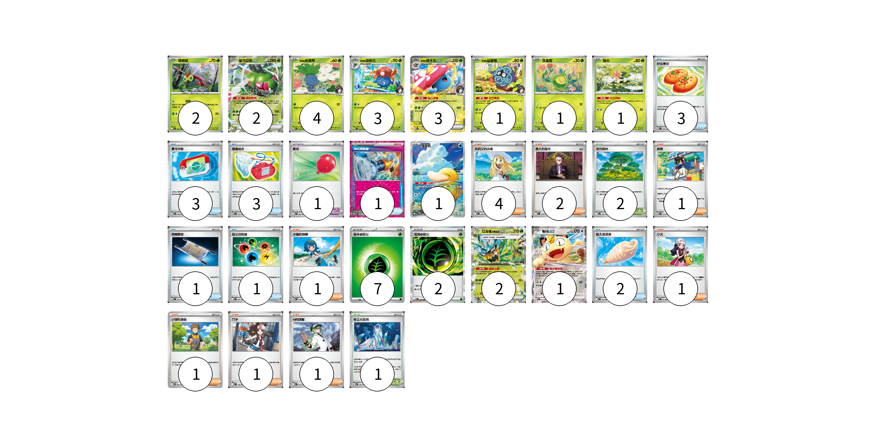 牌組構築方案 以此牌組為基礎新構築牌組 顯示卡面 顯示列表 寶可夢卡(21) 2 2 4 3 3 1 1 1 1 2 1 寶可夢道具(1) 1 物品卡(14) 3 3 3 1 1 1 2 支援者卡(12) 4 2 1 1 1 1 1 1 競技場卡(3) 2 1 能量卡(9) 7 2 寶可夢卡(21) 卡牌名稱 張數 卡牌名稱 張數 蜻蜻蜓 MC 021/742 02 遠古巨蜓ex SV9a 003/063 02 <莉佳的>走路草 MC 001/742 04 <莉佳的>臭臭花 MC 002/742 03 <莉佳的>霸王花ex MC 003/742 03 <莉佳的>蔓藤怪 MC 014/742 01 含羞苞 M2a 011/193 01 謝米 SV9a 006/063 01 可達鴨 M2a 199/193 01 厄鬼椪 碧草面具ex M2a 017/193 02 喵喵ex M3 061/080 01 寶可夢道具(1) 卡牌名稱 張數 卡牌名稱 張數 氣球 MC 688/742 01 物品卡(14) 卡牌名稱 張數 卡牌名稱 張數 好友寶芬 MC 648/742 03 寶可平板 M3 070/080 03 捕蟲組合 MC 667/742 03 頂尖捕捉器 SV8a 148/187 01 夜間擔架 MC 670/742 01 能量回收器 MC 640/742 01 超大冰淇淋 M2 073/080 02 支援者卡(12) 卡牌名稱 張數 卡牌名稱 張數 莉莉艾的決意 MC 729/742 04 老大的指令 MC 724/742 02 烏栗 MC 713/742 01 水蓮的照顧 MC 712/742 01 小光 M2 077/080 01 小剛的發掘 SV9 096/100 01 鬥子 MC 718/742 01 N的謀劃 MC 701/742 01 競技場卡(3) 卡牌名稱 張數 卡牌名稱 張數 活力森林 M2a 182/193 02 零之大空洞 M2a 184/193 01 能量卡(9) 卡牌名稱 張數 卡牌名稱 張數 基本【草】能量 MJ GRA 07 增強【草】能量 M3 078/080 02 以此牌組為基礎新構築牌組 牌組編碼 CaSeRC-IkrvbD-nespHD copy 列印牌組單 牌組編碼已複製 分享至SNS