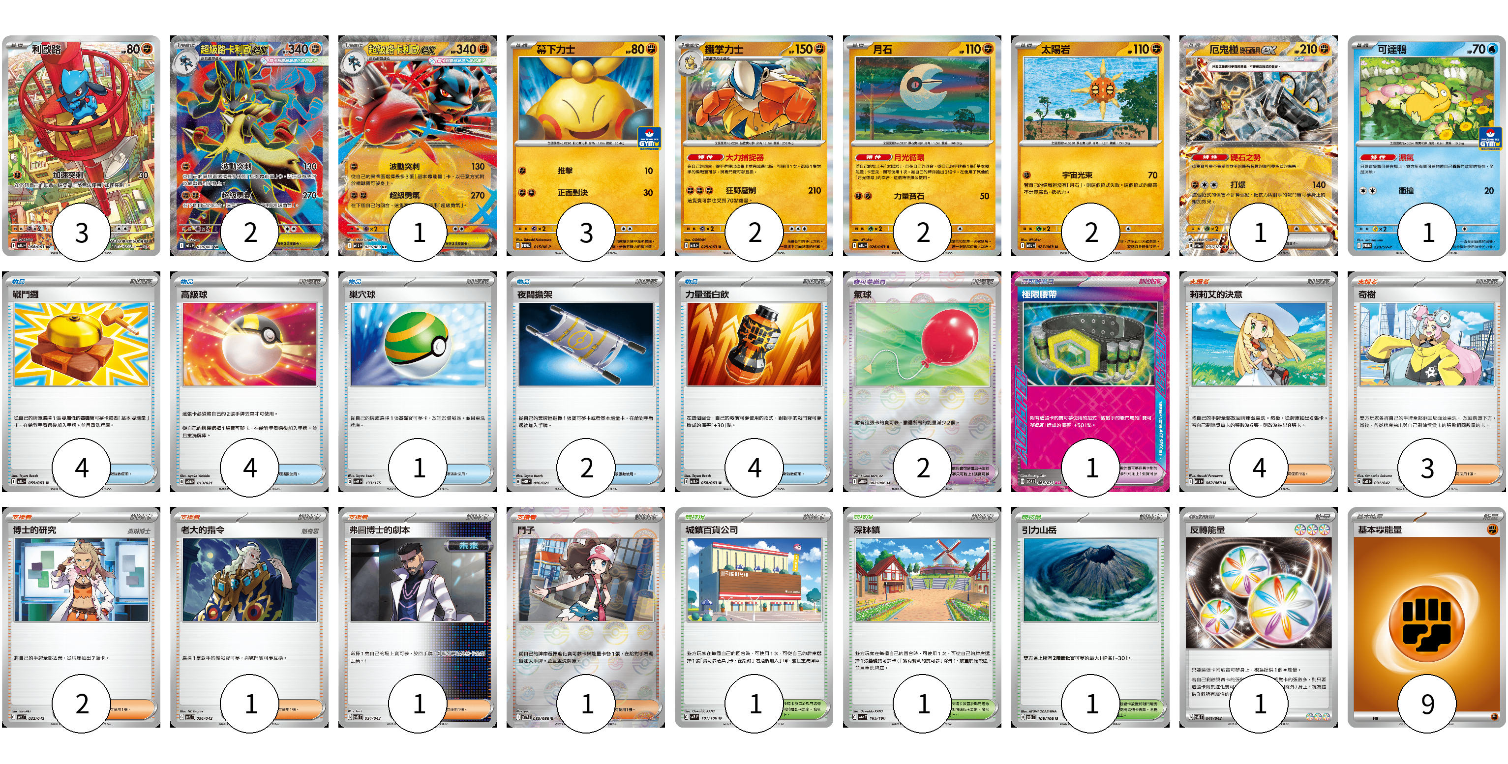 牌組構築方案 以此牌組為基礎新構築牌組 顯示卡面 顯示列表 寶可夢卡(17) 3 2 1 3 2 2 2 1 1 寶可夢道具(3) 2 1 物品卡(15) 4 4 1 2 4 支援者卡(12) 4 3 2 1 1 1 競技場卡(3) 1 1 1 能量卡(10) 1 9 寶可夢卡(17) 卡牌名稱 張數 卡牌名稱 張數 利歐路 M1L 068/063 03 超級路卡利歐ex M1L 078/063 02 超級路卡利歐ex M1L 029/063 01 幕下力士 M-P 015/M-P 03 鐵掌力士 M1L 025/063 02 月石 M1L 026/063 02 太陽岩 M1L 027/063 02 厄鬼椪 礎石面具ex SV8a 091/187 01 可達鴨 SV-P 220/SV-P 01 寶可夢道具(3) 卡牌名稱 張數 卡牌名稱 張數 氣球 SV11B 082/086 02 極限腰帶 SV5K 066/071 01 物品卡(15) 卡牌名稱 張數 卡牌名稱 張數 戰鬥鑼 M1L 059/063 04 高級球 SVOM 013/021 04 巢穴球 SVM 133/175 01 夜間擔架 SVOM 016/021 02 力量蛋白飲 M1L 058/063 04 支援者卡(12) 卡牌名稱 張數 卡牌名稱 張數 莉莉艾的決意 M1L 062/063 04 奇樹 SVK 031/042 03 博士的研究 SVK 032/042 02 老大的指令 SVK 036/042 01 弗圖博士的劇本 SVK 034/042 01 鬥子 SV11W 085/086 01 競技場卡(3) 卡牌名稱 張數 卡牌名稱 張數 城鎮百貨公司 SV3 107/108 01 深缽鎮 SV4a 185/190 01 引力山岳 SV8 106/106 01 能量卡(10) 卡牌名稱 張數 卡牌名稱 張數 反轉能量 SVK 041/042 01 基本【鬥】能量 SVAM FIG 09 以此牌組為基礎新構築牌組 牌組編碼 CaZeIx-opOJau-gXeCbY copy 列印牌組單 牌組編碼已複製 分享至SNS