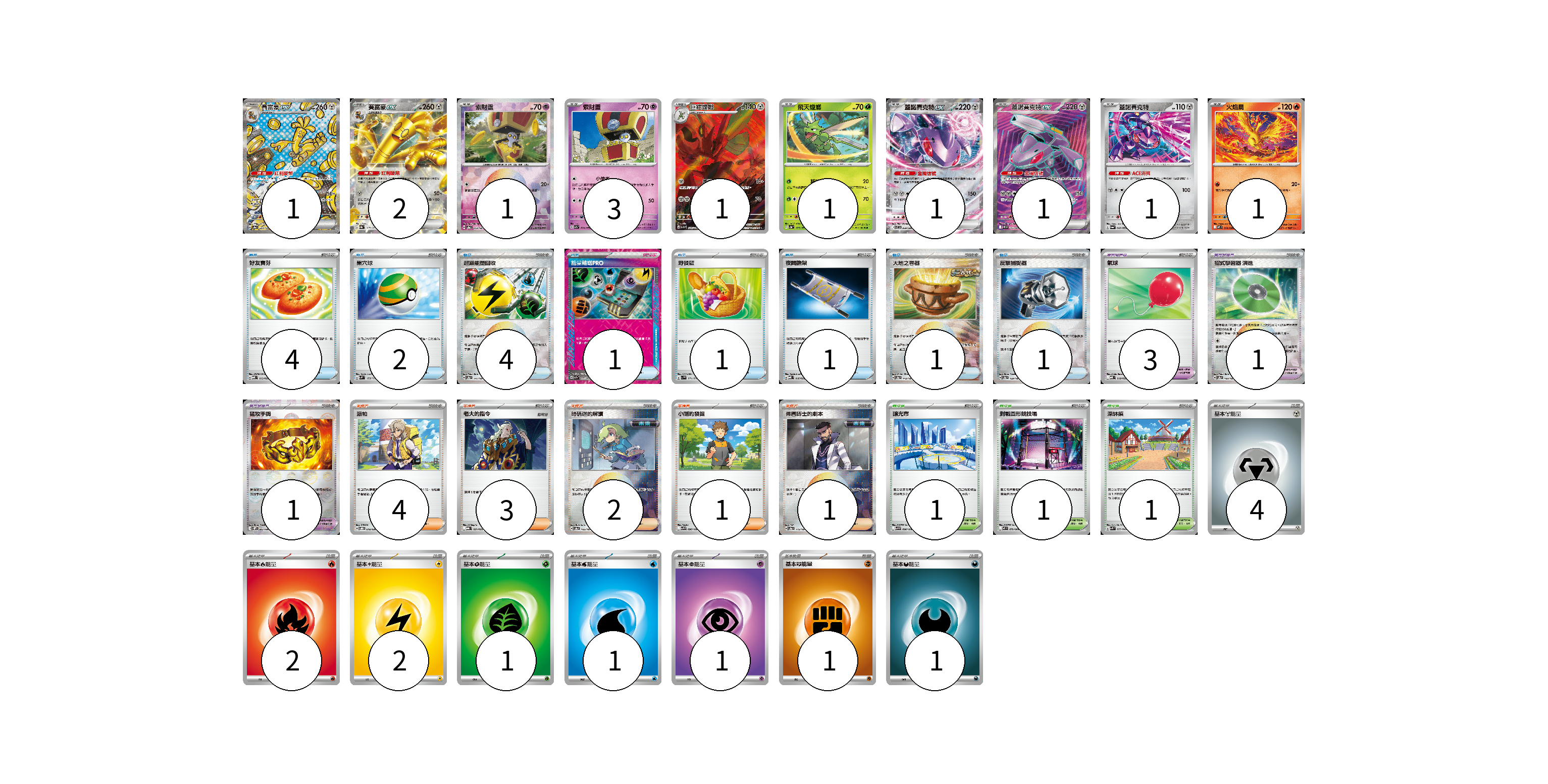 牌組構築方案 以此牌組為基礎新構築牌組 顯示卡面 顯示列表 寶可夢卡(13) 1 2 1 3 1 1 1 1 1 1 寶可夢道具(5) 3 1 1 物品卡(15) 4 2 4 1 1 1 1 1 支援者卡(11) 4 3 2 1 1 競技場卡(3) 1 1 1 能量卡(13) 4 2 2 1 1 1 1 1 寶可夢卡(13) 卡牌名稱 張數 卡牌名稱 張數 賽富豪ex SV8a 220/187 01 賽富豪ex SV8a 117/187 02 索財靈 SV8a 073/187 01 索財靈 SV7a 024/064 03 巨鉗螳螂 SV3 116/108 01 飛天螳螂 SV2a 123/165 01 蓋諾賽克特ex SV11B 069/086 01 蓋諾賽克特ex SV11B 164/086 01 蓋諾賽克特 SV6a 040/064 01 火焰鳥 M2 014/080 01 寶可夢道具(5) 卡牌名稱 張數 卡牌名稱 張數 氣球 MBD 018/022 03 招式學習器 演進 SV8a 160/187 01 猛攻手鐲 SV11W 082/086 01 物品卡(15) 卡牌名稱 張數 卡牌名稱 張數 好友寶芬 MBD 013/022 04 巢穴球 SVM 133/175 02 超級能量回收 SV8a 141/187 04 能量輸送PRO SV7a 052/064 01 野餐籃 SV1V 071/078 01 夜間擔架 MBD 016/022 01 大地之容器 SV8a 143/187 01 反擊捕捉器 SV8a 139/187 01 支援者卡(11) 卡牌名稱 張數 卡牌名稱 張數 派帕 SVOD 018/020 04 老大的指令 MBG 021/022 03 暗碼迷的解讀 SV8a 165/187 02 小剛的發掘 SV9 096/100 01 弗圖博士的劇本 SV8a 175/187 01 競技場卡(3) 卡牌名稱 張數 卡牌名稱 張數 釀光市 SV9 098/100 01 對戰圓形競技場 M2 079/080 01 深缽鎮 SVK 039/042 01 能量卡(13) 卡牌名稱 張數 卡牌名稱 張數 基本鋼能量 sv-p MET 04 基本火能量 sv-p FIR 02 基本雷能量 sv-p LIG 02 基本草能量 sv-p GRA 01 基本水能量 sv-p WAT 01 基本超能量 sv-p PSY 01 基本【鬥】能量 SVAM FIG 01 基本惡能量 sv-p DAR 01 以此牌組為基礎新構築牌組 牌組編碼 CbkvvB-OMQqvM-lBmhNH copy 列印牌組單 牌組編碼已複製 分享至SNS