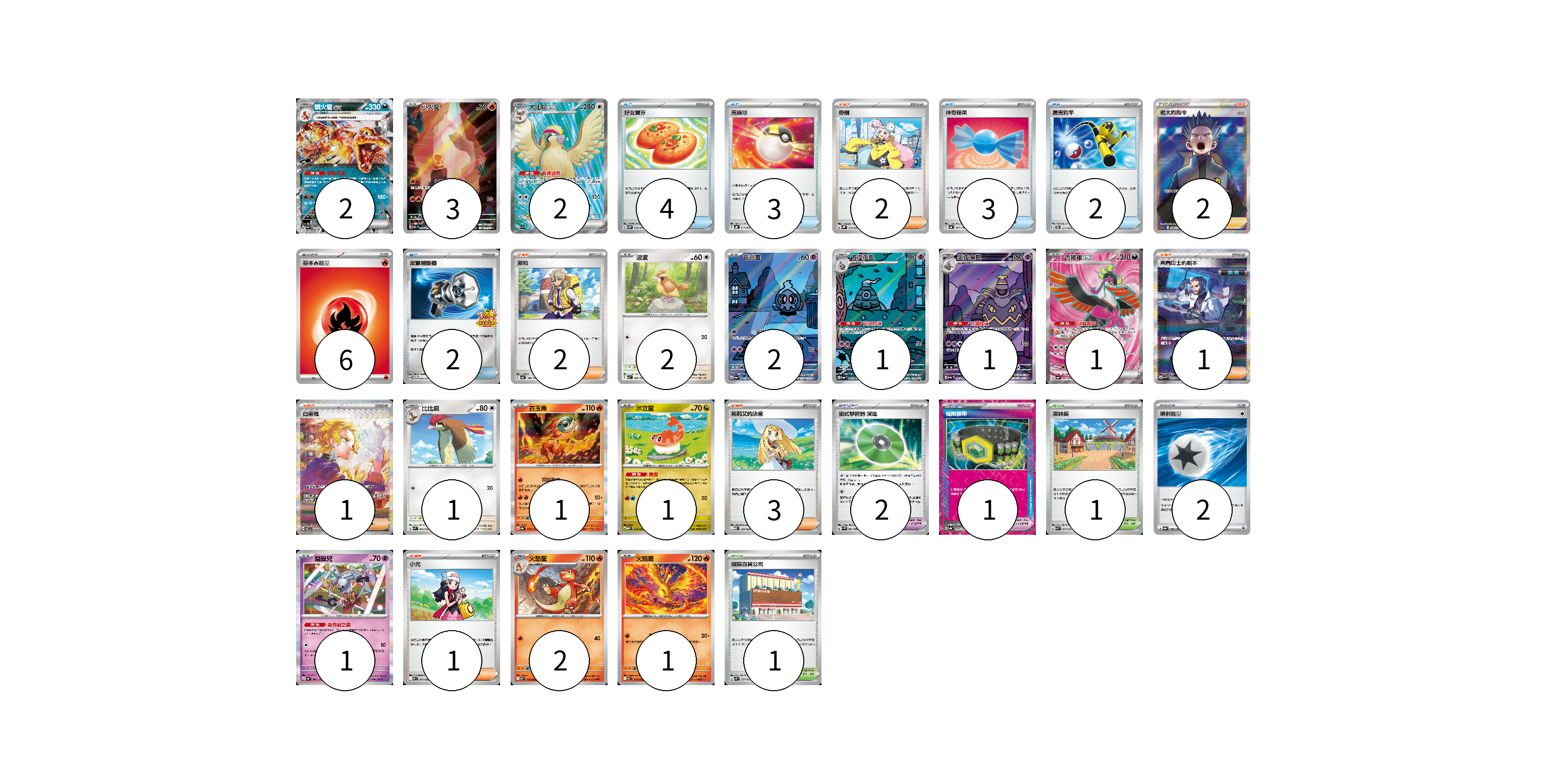 牌組構築方案 以此牌組為基礎新構築牌組 顯示卡面 顯示列表 寶可夢卡(21) 2 3 2 2 2 1 1 1 1 1 1 1 2 1 寶可夢道具(3) 2 1 物品卡(14) 4 3 3 2 2 支援者卡(12) 2 2 2 1 1 3 1 競技場卡(2) 1 1 能量卡(8) 6 2 寶可夢卡(21) 卡牌名稱 張數 卡牌名稱 張數 噴火龍ex SV4a 115/190 02 小火龍 SV2a 168/165 03 大比鳥ex SV3 128/108 02 波波 SV3 087/108 02 夜巡靈 SV6a 068/064 02 彷徨夜靈 SV6a 069/064 01 黑夜魔靈 SV6a 070/064 01 吉雉雞ex SV6a 081/064 01 比比鳥 SVK 004/042 01 古玉魚 SV8a 025/187 01 米立龍 MBD 010/022 01 鑰圈兒 SV4a 087/190 01 火恐龍 M2 012/080 02 火焰鳥 M2 014/080 01 寶可夢道具(3) 卡牌名稱 張數 卡牌名稱 張數 招式學習器 演進 SV4M 063/066 02 極限腰帶 SV8a 159/187 01 物品卡(14) 卡牌名稱 張數 卡牌名稱 張數 好友寶芬 SV5K 063/071 04 高級球 SVHK 013/022 03 神奇糖果 SV4a 163/190 03 厲害釣竿 SVEM 011/020 02 反擊捕捉器 SV-P 083/SV-P 02 支援者卡(12) 卡牌名稱 張數 卡牌名稱 張數 奇樹 SVHK 019/022 02 老大的指令(赤日) S12a 250/172 02 派帕 SV4a 180/190 02 弗圖博士的劇本 SV4M 091/066 01 白蕾雅 SV7 132/102 01 莉莉艾的決意 MBD 021/022 03 小光 M2 077/080 01 競技場卡(2) 卡牌名稱 張數 卡牌名稱 張數 深缽鎮 SVK 039/042 01 城鎮百貨公司 SVK 037/042 01 能量卡(8) 卡牌名稱 張數 卡牌名稱 張數 基本【火】能量 SVHK FIR 06 噴射能量 SV8a 185/187 02 以此牌組為基礎新構築牌組 牌組編碼 CcNfJe-pbHHXT-wdxCNY copy 列印牌組單 牌組編碼已複製 分享至SNS