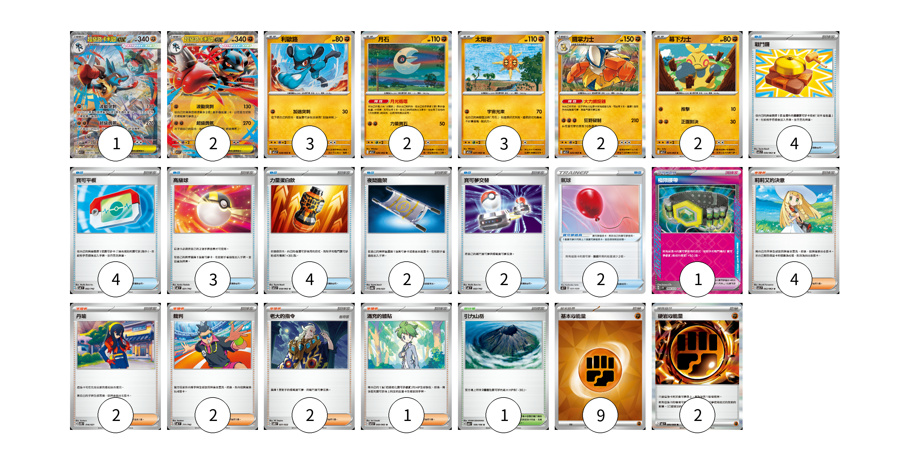 牌組構築方案 以此牌組為基礎新構築牌組 顯示卡面 顯示列表 寶可夢卡(15) 1 2 3 2 3 2 2 寶可夢道具(3) 2 1 物品卡(19) 4 4 3 4 2 2 支援者卡(11) 4 2 2 2 1 競技場卡(1) 1 能量卡(11) 9 2 寶可夢卡(15) 卡牌名稱 張數 卡牌名稱 張數 超級路卡利歐ex M1L 088/063 01 超級路卡利歐ex M1L 029/063 02 利歐路 M1L 028/063 03 月石 M1L 026/063 02 太陽岩 M1L 027/063 03 鐵掌力士 M1L 025/063 02 幕下力士 M1L 024/063 02 寶可夢道具(3) 卡牌名稱 張數 卡牌名稱 張數 氣球 SK 021/030 02 極限腰帶 SV5K 066/071 01 物品卡(19) 卡牌名稱 張數 卡牌名稱 張數 戰鬥鑼 M1L 059/063 04 寶可平板 MC 662/742 04 高級球 MC 651/742 03 力量蛋白飲 M1L 058/063 04 夜間擔架 SVOM 016/021 02 寶可夢交替 MC 663/742 02 支援者卡(11) 卡牌名稱 張數 卡牌名稱 張數 莉莉艾的決意 M1L 062/063 04 丹瑜 SVTR 016/021 02 裁判 MC 711/742 02 老大的指令 MBG 021/022 02 滿充的體貼 M1S 060/063 01 競技場卡(1) 卡牌名稱 張數 卡牌名稱 張數 引力山岳 SV8 106/106 01 能量卡(11) 卡牌名稱 張數 卡牌名稱 張數 基本【鬥】能量 SVM FIG 09 硬岩【鬥】能量 M3 080/080 02 以此牌組為基礎新構築牌組 牌組編碼 CfJpaa-xyAdol-osHCFN copy 列印牌組單 牌組編碼已複製 分享至SNS