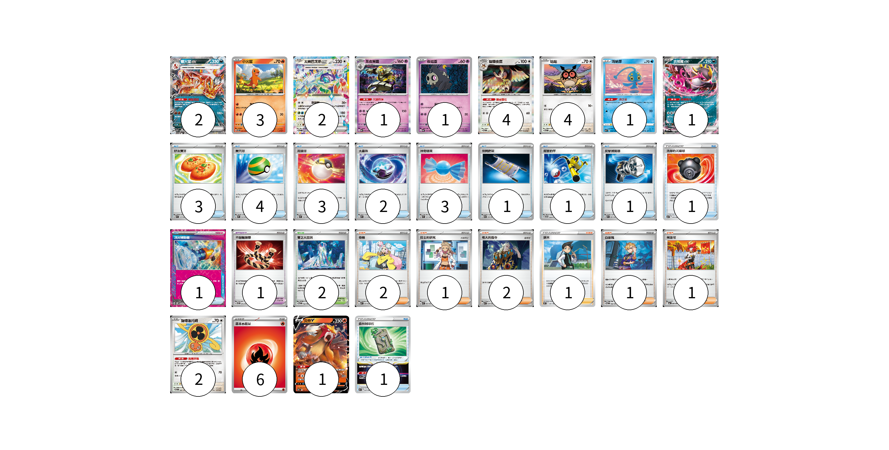 牌組構築方案 以此牌組為基礎新構築牌組 顯示卡面 顯示列表 寶可夢卡(22) 2 3 2 1 1 4 4 1 1 2 1 寶可夢道具(1) 1 物品卡(21) 3 4 3 2 3 1 1 1 1 1 1 支援者卡(8) 2 1 2 1 1 1 競技場卡(2) 2 能量卡(6) 6 寶可夢卡(22) 卡牌名稱 張數 卡牌名稱 張數 噴火龍ex SVTL 006/021 02 小火龍 SVTL 001/021 03 太樂巴戈斯ex SV7 088/102 02 黑夜魔靈 SV6a 020/064 01 夜巡靈 SV6a 018/064 01 貓頭夜鷹 SV7 077/102 04 咕咕 SV7 076/102 04 瑪納霏 SVF 003/038 01 吉雉雞ex SV6a 038/064 01 旋轉洛托姆 SV7 080/102 02 炎帝V SVTL 005/021 01 寶可夢道具(1) 卡牌名稱 張數 卡牌名稱 張數 不服輸頭帶 SVTL 016/021 01 物品卡(21) 卡牌名稱 張數 卡牌名稱 張數 好友寶芬 SVK 015/042 03 巢穴球 SVK 016/042 04 高級球 SVK 018/042 03 太晶珠 SVK 013/042 02 神奇糖果 SVK 019/042 03 夜間擔架 SV6a 056/064 01 厲害釣竿 SVTG 009/019 01 反擊捕捉器 SVK 009/042 01 洗翠的沉重球 SVB 014/028 01 頂尖捕捉器 SV5M 062/071 01 森林封印石 SVF 024/038 01 支援者卡(8) 卡牌名稱 張數 卡牌名稱 張數 奇樹 SVK 031/042 02 博士的研究 SVK 032/042 01 老大的指令 SVK 036/042 02 捩木 S11 097/100 01 白蕾雅 SV7 100/102 01 梅洛可 SV4K 066/066 01 競技場卡(2) 卡牌名稱 張數 卡牌名稱 張數 零之大空洞 SV7 102/102 02 能量卡(6) 卡牌名稱 張數 卡牌名稱 張數 基本【火】能量 SVD FIR 06 以此牌組為基礎新構築牌組 牌組編碼 CfQJhP-ExipRw-BwhiDO copy 列印牌組單 牌組編碼已複製 分享至SNS
