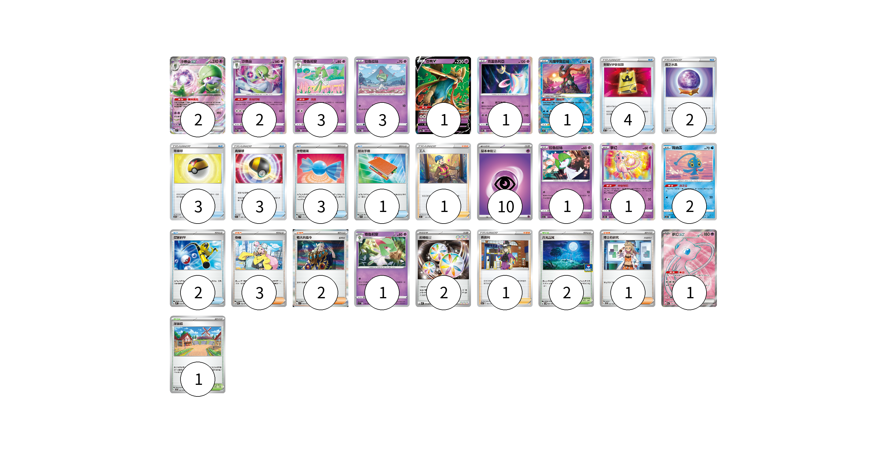 牌組構築方案 以此牌組為基礎新構築牌組 顯示卡面 顯示列表 寶可夢卡(19) 2 2 3 3 1 1 1 1 1 2 1 1 物品卡(18) 4 2 3 3 3 1 2 支援者卡(8) 1 3 2 1 1 競技場卡(3) 2 1 能量卡(12) 10 2 寶可夢卡(19) 卡牌名稱 張數 卡牌名稱 張數 沙奈朵ex SV1S 028/078 02 沙奈朵 S8b 063/184 02 奇魯莉安 S11a 037/068 03 拉魯拉絲 S9a 032/067 03 蒼響V S12a 067/172 01 克雷色利亞 S10D 028/067 01 光輝甲賀忍蛙 S9a 026/067 01 拉魯拉絲 S11a 036/068 01 夢幻 S12a 052/172 01 瑪納霏 S12a 029/172 02 奇魯莉安 SI 176/414 01 夢幻ex SV2a 195/165 01 物品卡(18) 卡牌名稱 張數 卡牌名稱 張數 對戰VIP參加證 S8 091/100 04 霧之水晶 S6K 060/070 02 等級球 S5R 063/070 03 高級球 S9 089/100 03 神奇糖果 SV1V 072/078 03 朋友手冊 SV1S 069/078 01 厲害釣竿 SV2P 066/071 02 支援者卡(8) 卡牌名稱 張數 卡牌名稱 張數 工人 S12 093/098 01 奇樹 SV2D 069/071 03 老大的指令 SV1a 069/073 02 賽寶利 S5a 068/070 01 博士的研究 SVF 030/038 01 競技場卡(3) 卡牌名稱 張數 卡牌名稱 張數 月光丘陵 SV-P 049/SV-P 02 深缽鎮 SVF 036/038 01 能量卡(12) 卡牌名稱 張數 卡牌名稱 張數 基本超能量 sv-p PSY 10 反轉能量 SV2P 071/071 02 以此牌組為基礎新構築牌組 牌組編碼 ChJNLj-QLcveq-KdShYA copy 列印牌組單 牌組編碼已複製 分享至SNS