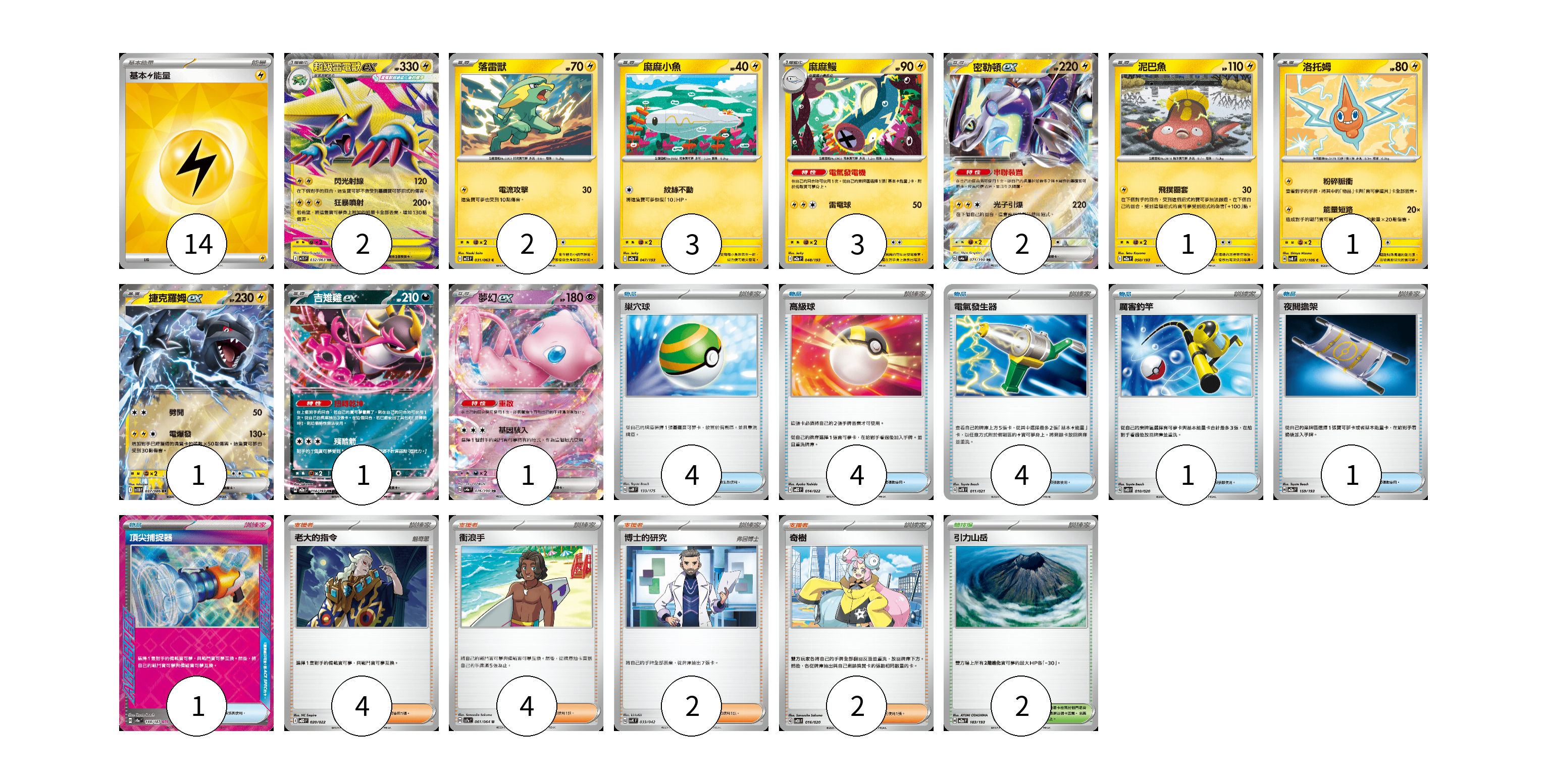 牌組構築方案 以此牌組為基礎新構築牌組 顯示卡面 顯示列表 寶可夢卡(17) 2 2 3 3 2 1 1 1 1 1 物品卡(15) 4 4 4 1 1 1 支援者卡(12) 4 4 2 2 競技場卡(2) 2 能量卡(14) 14 寶可夢卡(17) 卡牌名稱 張數 卡牌名稱 張數 超級雷電獸ex M1S 032/063 02 落雷獸 M1S 031/063 02 麻麻小魚 M2a 047/193 03 麻麻鰻 M2a 048/193 03 密勒頓ex SV4a 071/190 02 泥巴魚 M2a 050/193 01 洛托姆 SV8 037/106 01 捷克羅姆ex SV11B 037/086 01 吉雉雞ex M2a 114/193 01 夢幻ex SV4a 076/190 01 物品卡(15) 卡牌名稱 張數 卡牌名稱 張數 巢穴球 SVM 133/175 04 高級球 MBD 014/022 04 電氣發生器 SVTR 011/021 04 厲害釣竿 SVOD 010/020 01 夜間擔架 M2a 159/193 01 頂尖捕捉器 SV8a 148/187 01 支援者卡(12) 卡牌名稱 張數 卡牌名稱 張數 老大的指令 MBD 020/022 04 衝浪手 SV7a 061/064 04 博士的研究 SVK 033/042 02 奇樹 SVOD 016/020 02 競技場卡(2) 卡牌名稱 張數 卡牌名稱 張數 引力山岳 M2a 183/193 02 能量卡(14) 卡牌名稱 張數 卡牌名稱 張數 基本【雷】能量 SVQP LIG 14 以此牌組為基礎新構築牌組 牌組編碼 ChZLkN-IRYdXf-XWJGaK copy 列印牌組單 牌組編碼已複製 分享至SNS