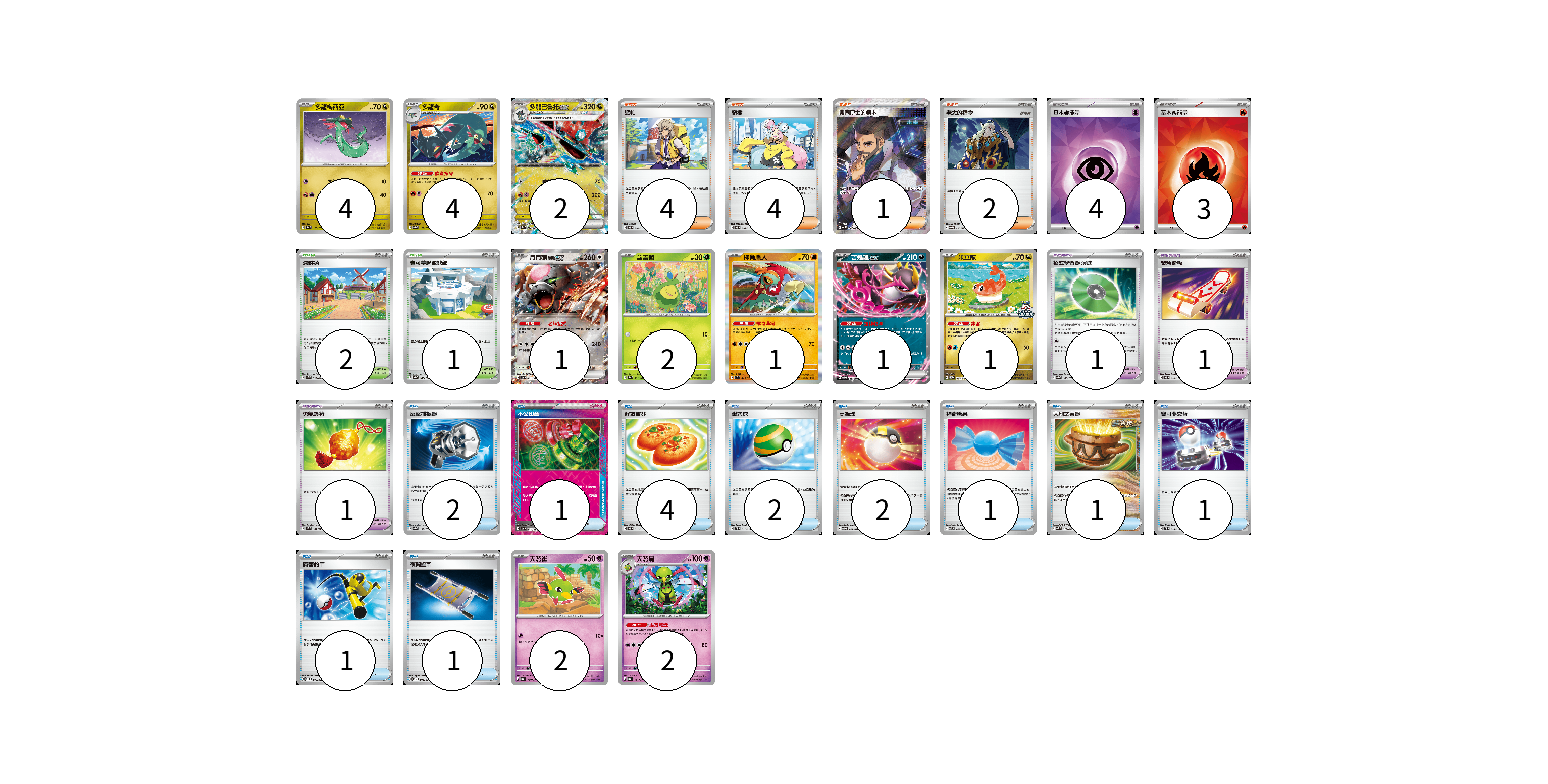 牌組構築方案 以此牌組為基礎新構築牌組 顯示卡面 顯示列表 寶可夢卡(20) 4 4 2 1 2 1 1 1 2 2 寶可夢道具(3) 1 1 1 物品卡(16) 2 1 4 2 2 1 1 1 1 1 支援者卡(11) 4 4 1 2 競技場卡(3) 2 1 能量卡(7) 4 3 寶可夢卡(20) 卡牌名稱 張數 卡牌名稱 張數 多龍梅西亞 SV8a 118/187 04 多龍奇 SV8a 119/187 04 多龍巴魯托ex SV8a 120/187 02 月月熊 赫月 ex SV5a 052/066 01 含羞苞 SV8a 001/187 02 摔角鷹人 SV1S 045/078 01 吉雉雞ex SVOD 004/020 01 米立龍 SV-P 186/SV-P 01 天然雀 SV8a 060/187 02 天然鳥 SV8a 061/187 02 寶可夢道具(3) 卡牌名稱 張數 卡牌名稱 張數 招式學習器 演進 SV8a 160/187 01 緊急滑板 SVOD 015/020 01 勇氣護符 SVM 142/175 01 物品卡(16) 卡牌名稱 張數 卡牌名稱 張數 反擊捕捉器 SV8a 139/187 02 不公印章 SV5a 053/066 01 好友寶芬 SVOD 011/020 04 巢穴球 SVTL 011/021 02 高級球 SVOD 012/020 02 神奇糖果 SVTL 013/021 01 大地之容器 SVK 012/042 01 寶可夢交替 SVTL 015/021 01 厲害釣竿 SVOD 010/020 01 夜間擔架 SVOM 016/021 01 支援者卡(11) 卡牌名稱 張數 卡牌名稱 張數 派帕 SVOD 018/020 04 奇樹 SVOD 016/020 04 弗圖博士的劇本 SV4M 086/066 01 老大的指令 SVOM 020/021 02 競技場卡(3) 卡牌名稱 張數 卡牌名稱 張數 深缽鎮 SVK 039/042 02 寶可夢聯盟總部 SV4a 186/190 01 能量卡(7) 卡牌名稱 張數 卡牌名稱 張數 基本【超】能量 SVOD PSY 04 基本【火】能量 SVK FIR 03 以此牌組為基礎新構築牌組 牌組編碼 CiULBP-yiNVUM-wfensi copy 列印牌組單 牌組編碼已複製 分享至SNS