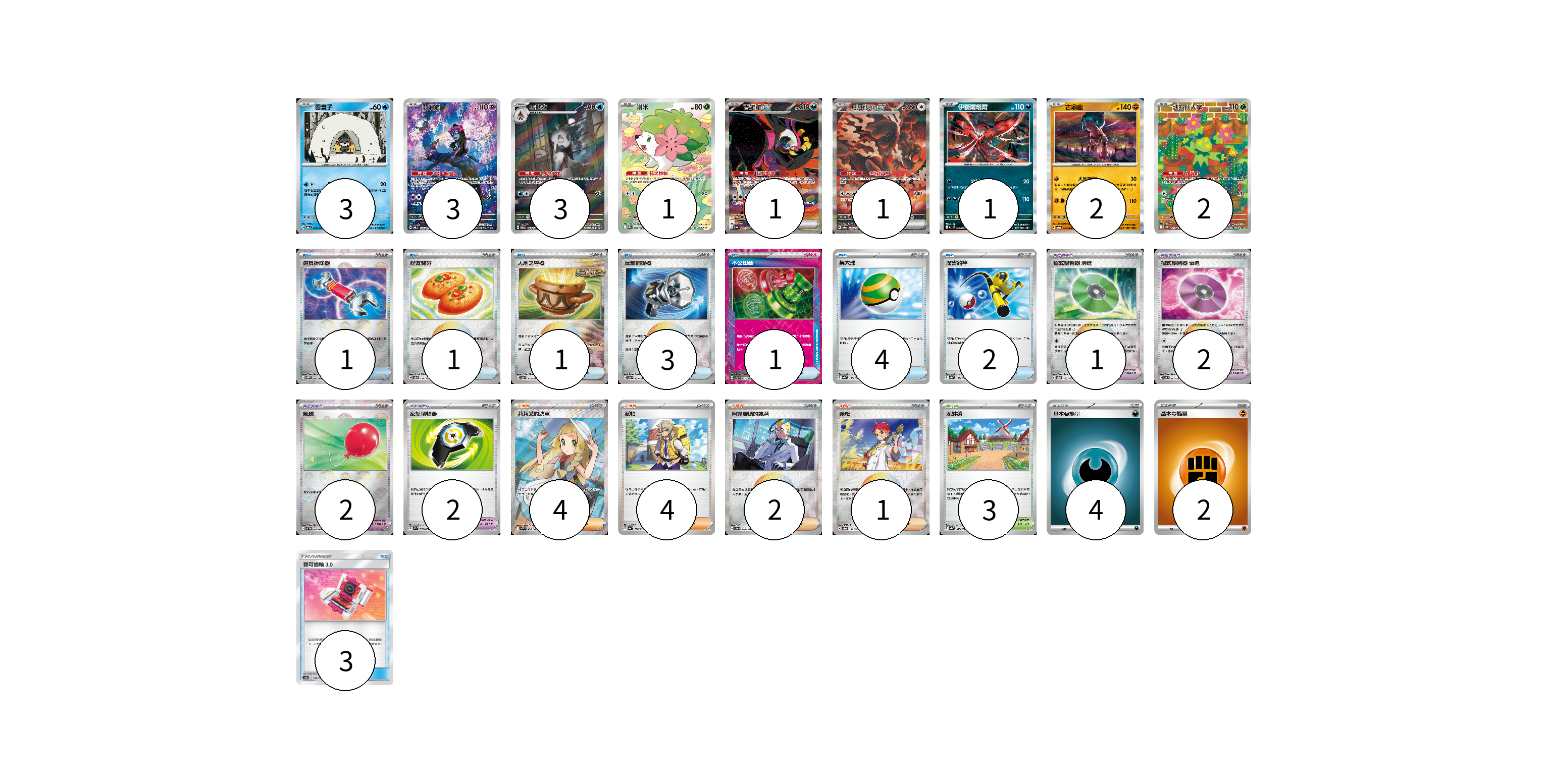 牌組構築方案 以此牌組為基礎新構築牌組 顯示卡面 顯示列表 寶可夢卡(17) 3 3 3 1 1 1 1 2 2 寶可夢道具(7) 1 2 2 2 物品卡(16) 1 1 1 3 1 4 2 3 支援者卡(11) 4 4 2 1 競技場卡(3) 3 能量卡(6) 4 2 寶可夢卡(17) 卡牌名稱 張數 卡牌名稱 張數 雪童子 SV6 031/101 03 願增猿 SV6 107/101 03 雪妖女 SV6 104/101 03 謝米 SV9a 066/063 01 吉雉雞ex SV6a 089/064 01 月月熊 赫月ex SV8a 225/187 01 伊裴爾塔爾 M1L 040/063 01 古鼎鹿 SV5a 047/066 02 沙鈴仙人掌 SV9 101/100 02 寶可夢道具(7) 卡牌名稱 張數 卡牌名稱 張數 招式學習器 演進 SV8a 160/187 01 招式學習器 衰退 SV8a 161/187 02 氣球 SV11B 082/086 02 反擊增幅器 SV7a 059/064 02 物品卡(16) 卡牌名稱 張數 卡牌名稱 張數 道具拆除器 SV11W 080/086 01 好友寶芬 SV8a 147/187 01 大地之容器 SV8a 143/187 01 反擊捕捉器 SV8a 139/187 03 不公印章 SV5a 053/066 01 巢穴球 SV4a 159/190 04 厲害釣竿 SV4a 158/190 02 寶可齒輪3.0 AS6b 190/194 03 支援者卡(11) 卡牌名稱 張數 卡牌名稱 張數 莉莉艾的決意 M1L 086/063 04 派帕 SV4a 180/190 04 阿克羅瑪的執著 SV8a 164/187 02 赤松 SV8a 163/187 01 競技場卡(3) 卡牌名稱 張數 卡牌名稱 張數 深缽鎮 SV4a 185/190 03 能量卡(6) 卡牌名稱 張數 卡牌名稱 張數 基本惡能量 sv-p DAR 04 基本【鬥】能量 SVAM FIG 02 以此牌組為基礎新構築牌組 牌組編碼 CikekU-fngXfK-BEfWrw copy 列印牌組單 牌組編碼已複製 分享至SNS