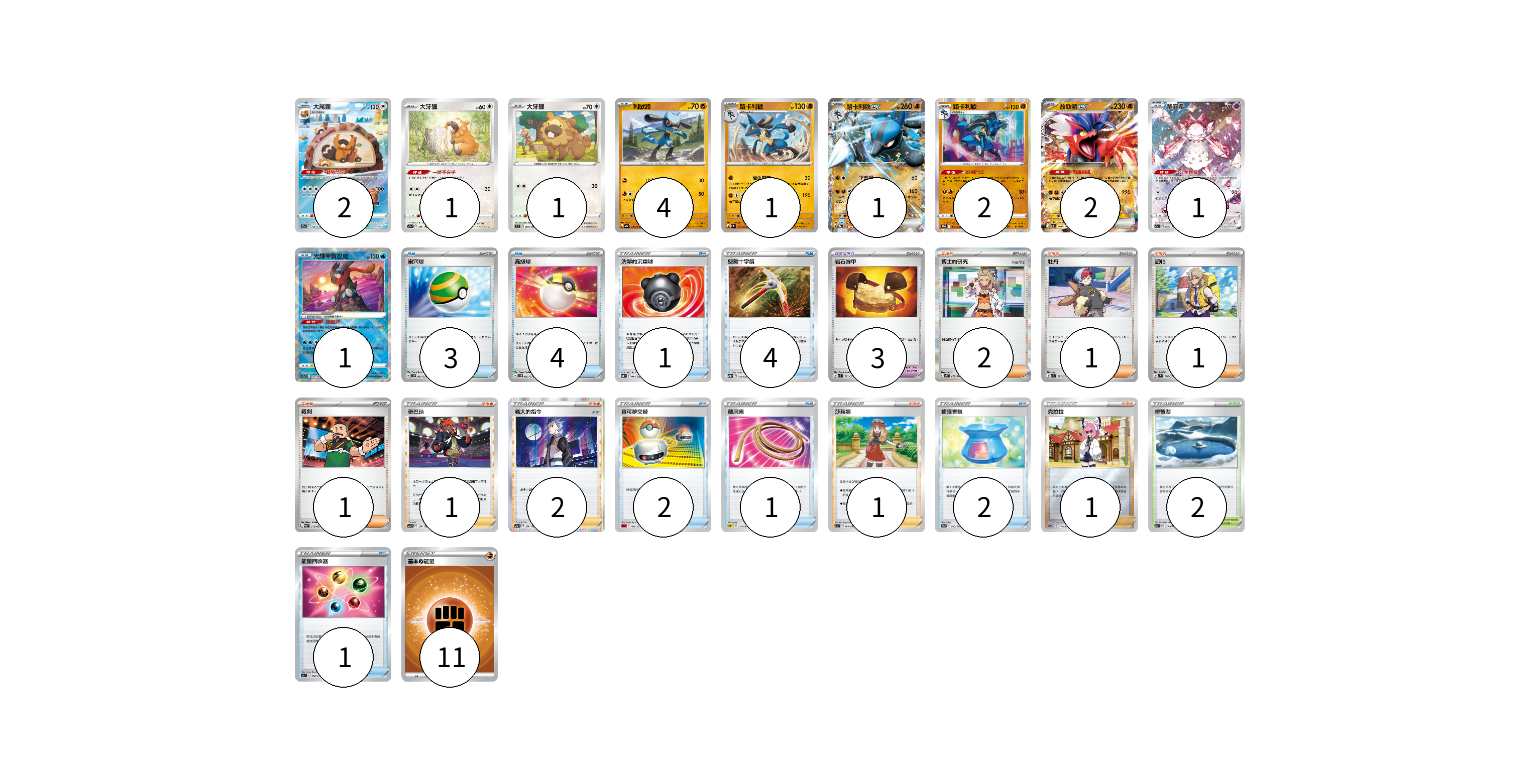 牌組構築方案 以此牌組為基礎新構築牌組 顯示卡面 顯示列表 寶可夢卡(16) 2 1 1 4 1 1 2 2 1 1 寶可夢道具(3) 3 物品卡(18) 3 4 1 4 2 1 2 1 支援者卡(10) 2 1 1 1 1 2 1 1 競技場卡(2) 2 能量卡(11) 11 寶可夢卡(16) 卡牌名稱 張數 卡牌名稱 張數 大尾狸 S12a 200/172 02 大牙狸 S12a 121/172 01 大牙狸 S9 081/100 01 利歐路 SV1S 040/078 04 路卡利歐 SV1S 041/078 01 路卡利歐ex SVAM 009/023 01 路卡利歐 S12a 077/172 02 故勒頓ex SV1S 050/078 02 蒂安希 S12a 186/172 01 光輝甲賀忍蛙 S9a 026/067 01 寶可夢道具(3) 卡牌名稱 張數 卡牌名稱 張數 岩石胸甲 SV1S 071/078 03 物品卡(18) 卡牌名稱 張數 卡牌名稱 張數 巢穴球 SVB 001/028 03 高級球 SVB 002/028 04 洗翠的沉重球 SVB 014/028 01 堅毅十字鎬 SVB 012/028 04 寶可夢交替 SDL 015/021 02 離洞繩 SDP 012/022 01 捕獲香氛 S11a 060/068 02 能量回收器 SI 368/414 01 支援者卡(10) 卡牌名稱 張數 卡牌名稱 張數 博士的研究(奧琳博士) SV1S 076/078 02 牡丹 SV1S 077/078 01 派帕 SV1V 076/078 01 裁判 SVAL 018/021 01 奇巴納 S12a 151/172 01 老大的指令(赤日) S12a 161/172 02 莎莉娜 S11a 064/068 01 克拉拉 SPD 014/020 01 競技場卡(2) 卡牌名稱 張數 卡牌名稱 張數 睿智湖 S10a 071/071 02 能量卡(11) 卡牌名稱 張數 卡牌名稱 張數 基本【鬥】能量 SI FIG 11 以此牌組為基礎新構築牌組 牌組編碼 CjoShd-XlfGQT-ViUKut copy 列印牌組單 牌組編碼已複製 分享至SNS