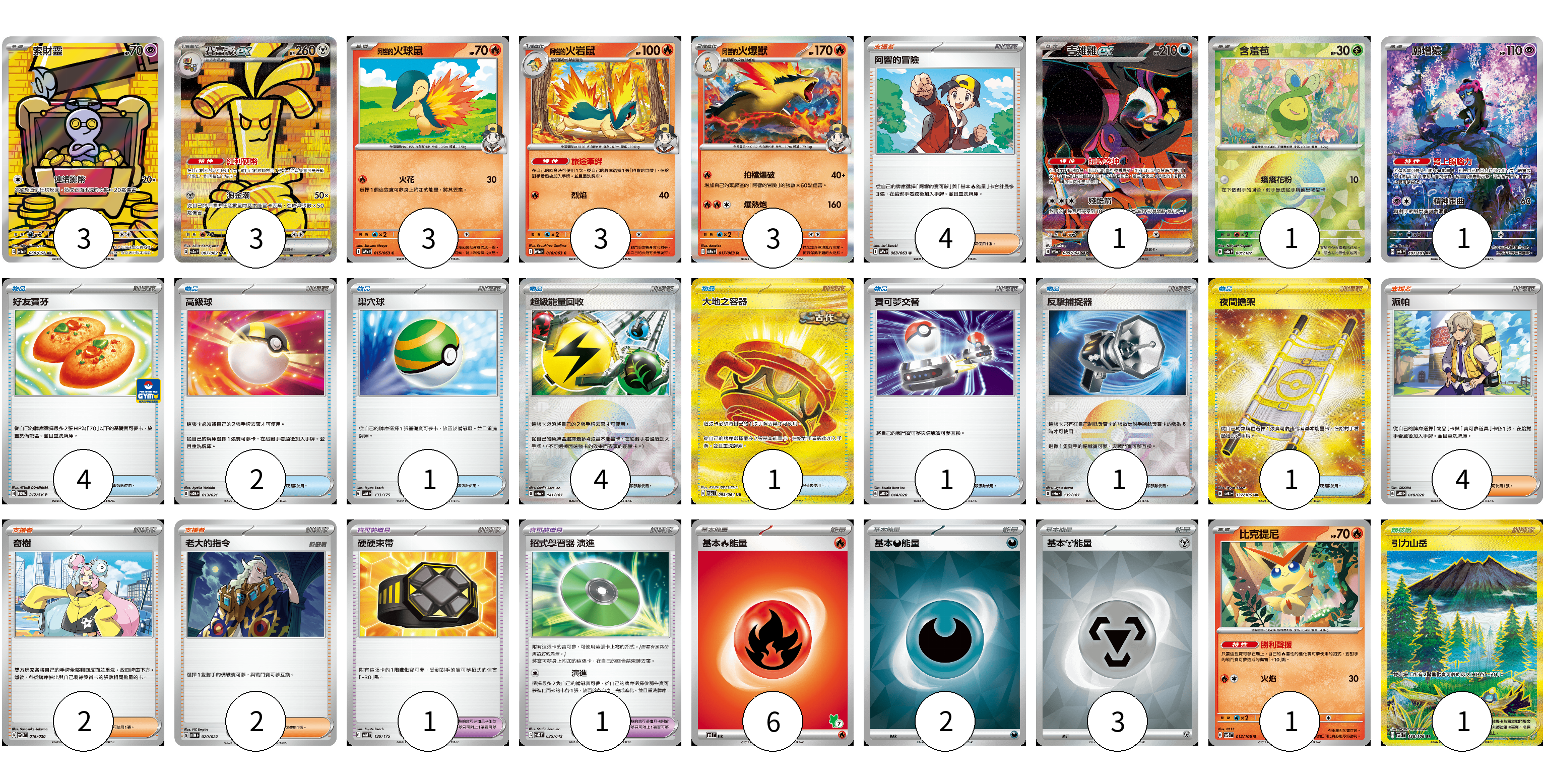 牌組構築方案 以此牌組為基礎新構築牌組 顯示卡面 顯示列表 寶可夢卡(19) 3 3 3 3 3 1 1 1 1 寶可夢道具(2) 1 1 物品卡(15) 4 2 1 4 1 1 1 1 支援者卡(12) 4 4 2 2 競技場卡(1) 1 能量卡(11) 6 2 3 寶可夢卡(19) 卡牌名稱 張數 卡牌名稱 張數 索財靈 SV3a 068/062 03 賽富豪ex SV3a 087/062 03 <阿響的>火球鼠 SV9a 015/063 03 <阿響的>火岩鼠 SV9a 016/063 03 <阿響的>火爆獸 SV9a 017/063 03 吉雉雞ex SV6a 089/064 01 含羞苞 SV8a 001/187 01 願增猿 SV6 107/101 01 比克提尼 SV8 012/106 01 寶可夢道具(2) 卡牌名稱 張數 卡牌名稱 張數 硬硬束帶 SVM 139/175 01 招式學習器 演進 SVK 025/042 01 物品卡(15) 卡牌名稱 張數 卡牌名稱 張數 好友寶芬 SV-P 212/SV-P 04 高級球 SVOM 013/021 02 巢穴球 SVM 133/175 01 超級能量回收 SV8a 141/187 04 大地之容器 SV6a 093/064 01 寶可夢交替 SVOD 014/020 01 反擊捕捉器 SV8a 139/187 01 夜間擔架 SV8 137/106 01 支援者卡(12) 卡牌名稱 張數 卡牌名稱 張數 阿響的冒險 SV9a 063/063 04 派帕 SVOD 018/020 04 奇樹 SVOD 016/020 02 老大的指令 SVTM 020/022 02 競技場卡(1) 卡牌名稱 張數 卡牌名稱 張數 引力山岳 SV8 138/106 01 能量卡(11) 卡牌名稱 張數 卡牌名稱 張數 基本【火】能量 SVI FIR 06 基本【惡】能量 SVOM DAR 02 基本【鋼】能量 SVOD MET 03 以此牌組為基礎新構築牌組 牌組編碼 Clygou-AiUoZU-cPUVTr copy 列印牌組單 牌組編碼已複製 分享至SNS