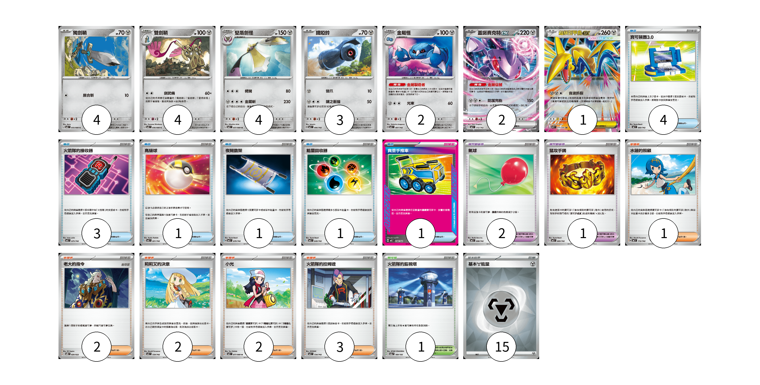 牌組構築方案 以此牌組為基礎新構築牌組 顯示卡面 顯示列表 寶可夢卡(20) 4 4 4 3 2 2 1 寶可夢道具(3) 2 1 物品卡(11) 4 3 1 1 1 1 支援者卡(10) 1 2 2 2 3 競技場卡(1) 1 能量卡(15) 15 寶可夢卡(20) 卡牌名稱 張數 卡牌名稱 張數 獨劍鞘 M3 055/080 04 雙劍鞘 M3 056/080 04 堅盾劍怪 M3 057/080 04 鐵啞鈴 MC 496/742 03 金屬怪 MC 497/742 02 蓋諾賽克特ex MC 512/742 02 超級盔甲鳥ex M3 054/080 01 寶可夢道具(3) 卡牌名稱 張數 卡牌名稱 張數 氣球 MC 688/742 02 猛攻手鐲 MC 689/742 01 物品卡(11) 卡牌名稱 張數 卡牌名稱 張數 寶可裝置3.0 MC 660/742 04 火箭隊的接收器 MC 675/742 03 高級球 MC 651/742 01 夜間擔架 MC 670/742 01 能量回收器 MC 640/742 01 貴重手推車 MC 658/742 01 支援者卡(10) 卡牌名稱 張數 卡牌名稱 張數 水蓮的照顧 MC 712/742 01 老大的指令 MBD 020/022 02 莉莉艾的決意 MC 729/742 02 小光 M2 077/080 02 火箭隊的拉姆達 MC 734/742 03 競技場卡(1) 卡牌名稱 張數 卡牌名稱 張數 火箭隊的監視塔 M2a 189/193 01 能量卡(15) 卡牌名稱 張數 卡牌名稱 張數 基本【鋼】能量 SVOD MET 15 以此牌組為基礎新構築牌組 牌組編碼 CmLhQM-KeJVti-RKsHrS copy 列印牌組單 牌組編碼已複製 分享至SNS