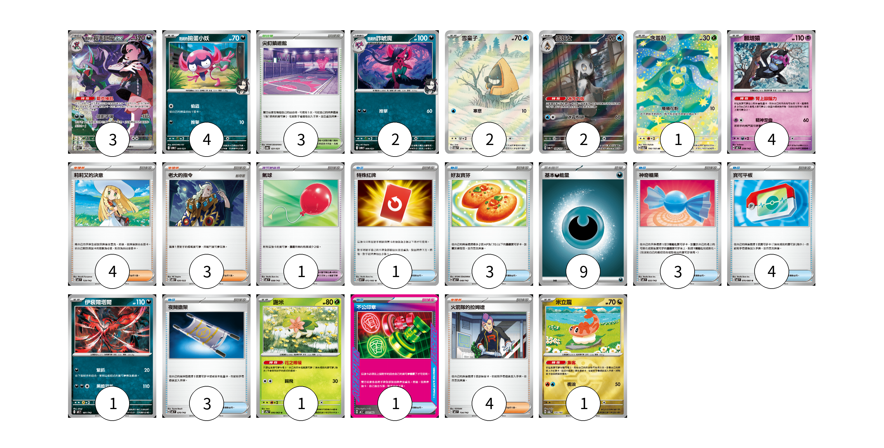 牌組構築方案 以此牌組為基礎新構築牌組 顯示卡面 顯示列表 寶可夢卡(21) 3 4 2 2 2 1 4 1 1 1 寶可夢道具(1) 1 物品卡(15) 1 3 3 4 3 1 支援者卡(11) 4 3 4 競技場卡(3) 3 能量卡(9) 9 寶可夢卡(21) 卡牌名稱 張數 卡牌名稱 張數 <瑪俐的>長毛巨魔ex M2a 243/193 03 <瑪俐的>搗蛋小妖 SVOM 005/021 04 <瑪俐的>詐唬魔 SVOM 006/021 02 雪童子 M2a 200/193 02 雪妖女 SV6 104/101 02 含羞苞 M2a 196/193 01 願增猿 MC 358/742 04 伊裴爾塔爾 MC 481/742 01 謝米 SV9a 006/063 01 米立龍 M2a 135/193 01 寶可夢道具(1) 卡牌名稱 張數 卡牌名稱 張數 氣球 MC 688/742 01 物品卡(15) 卡牌名稱 張數 卡牌名稱 張數 特殊紅牌 M4 072/083 01 好友寶芬 MC 648/742 03 神奇糖果 MC 655/742 03 寶可平板 M3 070/080 04 夜間擔架 MC 670/742 03 不公印章 MC 633/742 01 支援者卡(11) 卡牌名稱 張數 卡牌名稱 張數 莉莉艾的決意 MC 729/742 04 老大的指令 MBD 020/022 03 火箭隊的拉姆達 MC 734/742 04 競技場卡(3) 卡牌名稱 張數 卡牌名稱 張數 尖釘鎮道館 SVOM 021/021 03 能量卡(9) 卡牌名稱 張數 卡牌名稱 張數 基本【惡】能量 MC DAR 09 以此牌組為基礎新構築牌組 牌組編碼 CplnJe-KEaRKQ-eNwJGv copy 列印牌組單 牌組編碼已複製 分享至SNS