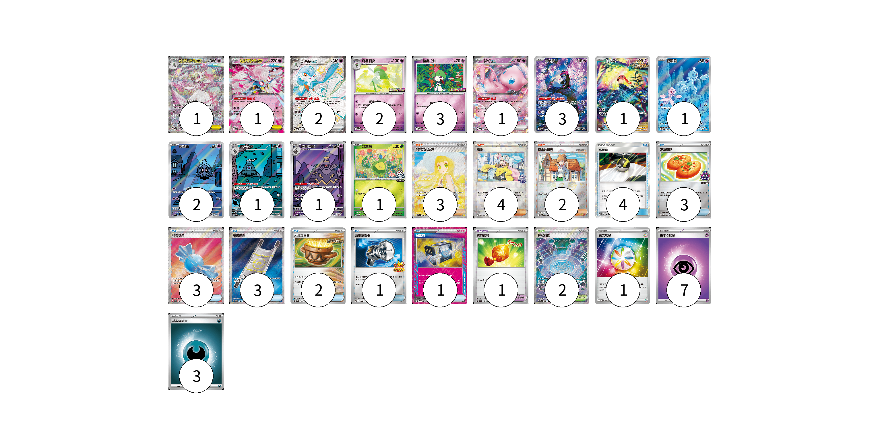 牌組構築方案 以此牌組為基礎新構築牌組 顯示卡面 顯示列表 寶可夢卡(20) 1 1 2 2 3 1 3 1 1 2 1 1 1 寶可夢道具(1) 1 物品卡(17) 4 3 3 3 2 1 1 支援者卡(9) 3 4 2 競技場卡(2) 2 能量卡(11) 1 7 3 寶可夢卡(20) 卡牌名稱 張數 卡牌名稱 張數 超級沙奈朵ex M1S 087/063 01 超級蒂安希ex MBD 006/022 01 沙奈朵ex SV4a 328/190 02 奇魯莉安 M-P 006/M-P 02 拉魯拉絲 M-P 005/M-P 03 夢幻ex SV4a 076/190 01 願增猿 SV6 107/101 03 吼叫尾 SV4K 071/066 01 輕飄飄 SV11W 124/086 01 夜巡靈 SV6a 068/064 02 彷徨夜靈 SV6a 069/064 01 黑夜魔靈 SV6a 070/064 01 含羞苞 M-P 037/M-P 01 寶可夢道具(1) 卡牌名稱 張數 卡牌名稱 張數 勇氣護符 SVM 142/175 01 物品卡(17) 卡牌名稱 張數 卡牌名稱 張數 高級球 AS5b 178/186 04 好友寶芬 SV-P 230/SV-P 03 神奇糖果 M1S 082/063 03 夜間擔架 M1L 083/063 03 大地之容器 SV8a 143/187 02 反擊捕捉器 SV-P 083/SV-P 01 秘密箱 SV6 092/101 01 支援者卡(9) 卡牌名稱 張數 卡牌名稱 張數 莉莉艾的決意 M1L 091/063 03 奇樹 SV-P 247/SV-P 04 博士的研究 SV11B 084/086 02 競技場卡(2) 卡牌名稱 張數 卡牌名稱 張數 神秘花園 M1S 086/063 02 能量卡(11) 卡牌名稱 張數 卡牌名稱 張數 夜光能量 SV4a 190/190 01 基本【超】能量 MBD PSY 07 基本【惡】能量 MBG DAR 03 以此牌組為基礎新構築牌組 牌組編碼 CtFcKe-AGvozz-QRyTuj copy 列印牌組單 牌組編碼已複製 分享至SNS