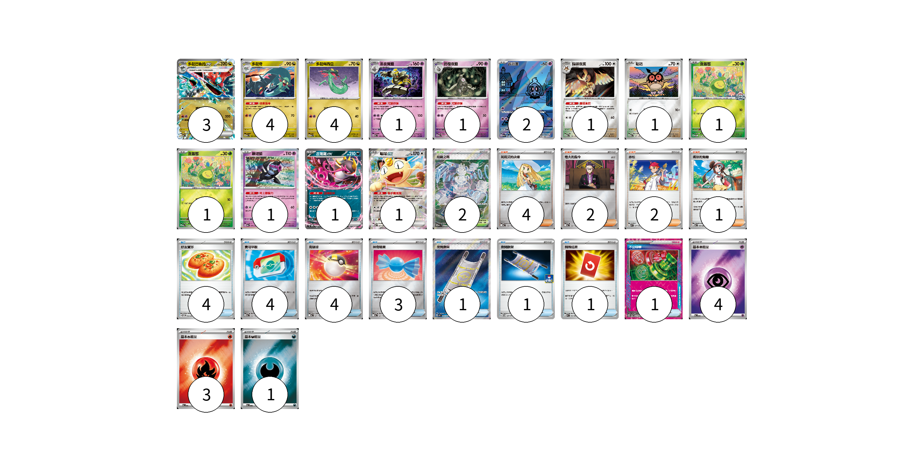 牌組構築方案 以此牌組為基礎新構築牌組 顯示卡面 顯示列表 寶可夢卡(22) 3 4 4 1 1 2 1 1 1 1 1 1 1 物品卡(19) 4 4 4 3 1 1 1 1 支援者卡(9) 4 2 2 1 競技場卡(2) 2 能量卡(8) 4 3 1 寶可夢卡(22) 卡牌名稱 張數 卡牌名稱 張數 多龍巴魯托ex MC 548/742 03 多龍奇 M2a 133/193 04 多龍梅西亞 M2a 132/193 04 黑夜魔靈 MC 310/742 01 彷徨夜靈 M2a 073/193 01 夜巡靈 SV6a 068/064 02 貓頭夜鷹 M2a 138/193 01 咕咕 M2a 137/193 01 含羞苞 M-P 037/M-P 01 含羞苞 M2a 011/193 01 願增猿 SV8a 075/187 01 吉雉雞ex SVOD 004/020 01 喵喵ex M3 061/080 01 物品卡(19) 卡牌名稱 張數 卡牌名稱 張數 好友寶芬 SVOM 012/021 04 寶可平板 MC 662/742 04 高級球 MC 651/742 04 神奇糖果 MC 655/742 03 夜間擔架 M1L 083/063 01 夜間擔架 SV-P 227/SV-P 01 特殊紅牌 M4 072/083 01 不公印章 SV5a 053/066 01 支援者卡(9) 卡牌名稱 張數 卡牌名稱 張數 莉莉艾的決意 MC 729/742 04 老大的指令 MC 724/742 02 赤松 SVK 027/042 02 鳴依的勉勵 M3 075/080 01 競技場卡(2) 卡牌名稱 張數 卡牌名稱 張數 阻礙之塔 M2a 222/193 02 能量卡(8) 卡牌名稱 張數 卡牌名稱 張數 基本【超】能量 MC PSY 04 基本【火】能量 MC FIR 03 基本【惡】能量 MC DAR 01 以此牌組為基礎新構築牌組 牌組編碼 CzwNWU-BTgfLe-XatXcA copy 列印牌組單 牌組編碼已複製 分享至SNS