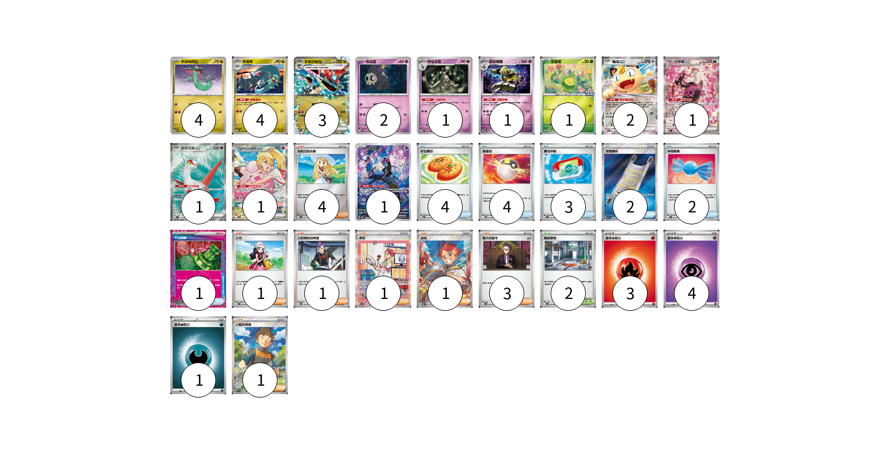 牌組構築方案 以此牌組為基礎新構築牌組 顯示卡面 顯示列表 寶可夢卡(22) 4 4 3 2 1 1 1 2 1 1 1 1 物品卡(16) 4 4 3 2 2 1 支援者卡(12) 4 1 1 1 1 3 1 競技場卡(2) 2 能量卡(8) 3 4 1 寶可夢卡(22) 卡牌名稱 張數 卡牌名稱 張數 多龍梅西亞 SV8a 118/187 04 多龍奇 M2a 133/193 04 多龍巴魯托ex MC 548/742 03 夜巡靈 SV6a 018/064 02 彷徨夜靈 SV6a 019/064 01 黑夜魔靈 M2a 074/193 01 含羞苞 M-P 037/M-P 01 喵喵ex M3 061/080 02 吉雉雞ex M2a 244/193 01 拉帝亞斯ex SV7a 078/064 01 莉莉艾的皮皮ex MC 765/742 01 願增猿 SV6 107/101 01 物品卡(16) 卡牌名稱 張數 卡牌名稱 張數 好友寶芬 M2a 153/193 04 高級球 MBD 014/022 04 寶可平板 MC 662/742 03 夜間擔架 M1L 083/063 02 神奇糖果 MC 655/742 02 不公印章 SV5a 053/066 01 支援者卡(12) 卡牌名稱 張數 卡牌名稱 張數 莉莉艾的決意 MC 729/742 04 小光 M2 077/080 01 火箭隊的拉姆達 M2a 179/193 01 赤松 SV8a 227/187 01 赤松 SV7 123/102 01 老大的指令 MC 724/742 03 小剛的發掘 SV9 123/100 01 競技場卡(2) 卡牌名稱 張數 卡牌名稱 張數 險惡廢墟 M1L 063/063 02 能量卡(8) 卡牌名稱 張數 卡牌名稱 張數 基本【火】能量 MC FIR 03 基本【超】能量 MC PSY 04 基本【惡】能量 MC DAR 01 以此牌組為基礎新構築牌組 牌組編碼 DCFwvy-RrymWL-Blfbza copy 列印牌組單 牌組編碼已複製 分享至SNS