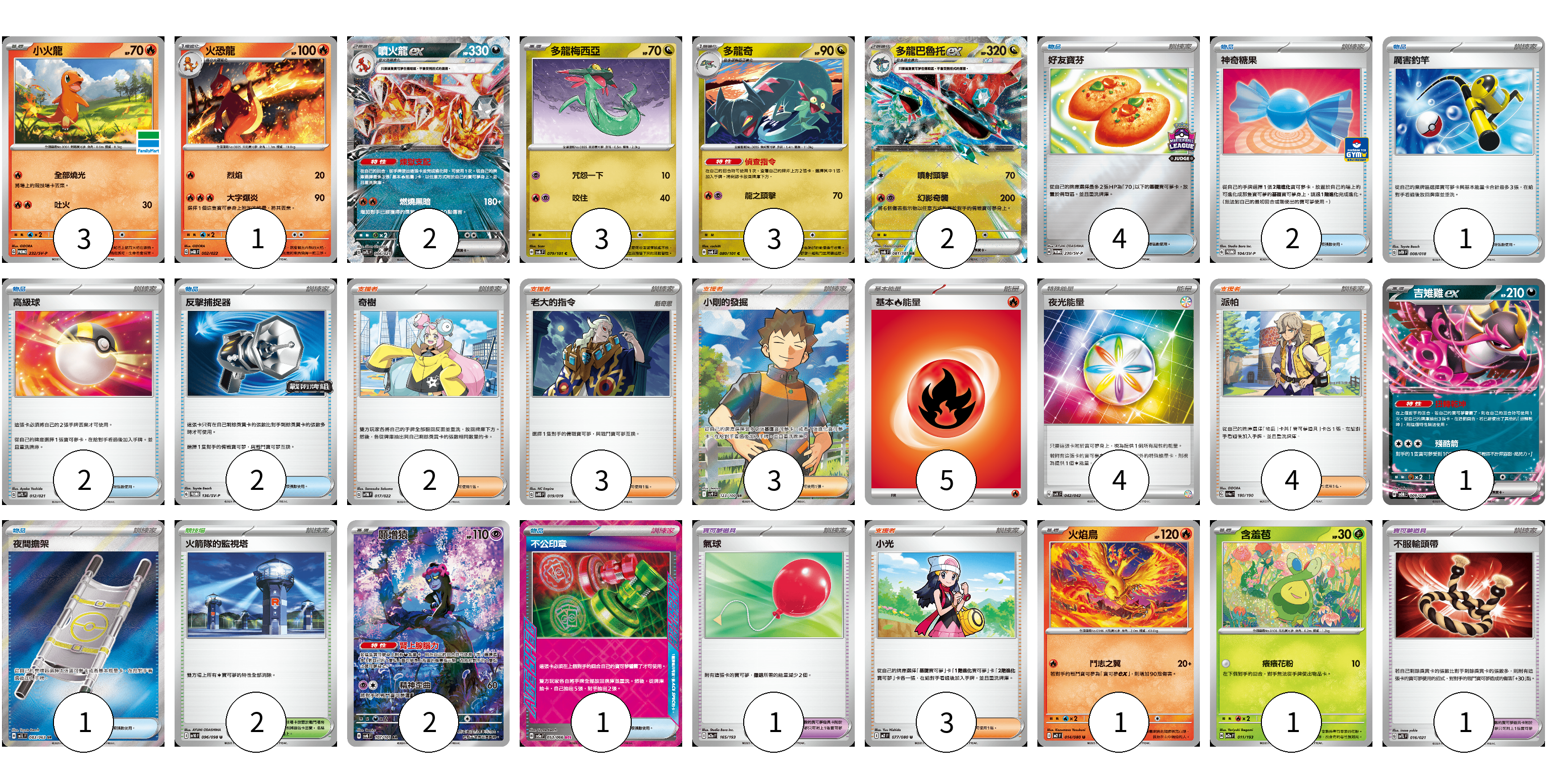 牌組構築方案 以此牌組為基礎新構築牌組 顯示卡面 顯示列表 寶可夢卡(19) 3 1 2 3 3 2 1 2 1 1 寶可夢道具(2) 1 1 物品卡(13) 4 2 1 2 2 1 1 支援者卡(15) 2 3 3 4 3 競技場卡(2) 2 能量卡(9) 5 4 寶可夢卡(19) 卡牌名稱 張數 卡牌名稱 張數 小火龍 SV-P 232/SV-P 03 火恐龍 SVQL 002/022 01 噴火龍ex SVTL 006/021 02 多龍梅西亞 SV6 079/101 03 多龍奇 SV6 080/101 03 多龍巴魯托ex SV6 081/101 02 吉雉雞ex SVOM 009/021 01 願增猿 SV6 107/101 02 火焰鳥 M2 014/080 01 含羞苞 M2a 011/193 01 寶可夢道具(2) 卡牌名稱 張數 卡牌名稱 張數 氣球 M2a 165/193 01 不服輸頭帶 SVTL 016/021 01 物品卡(13) 卡牌名稱 張數 卡牌名稱 張數 好友寶芬 SV-P 230/SV-P 04 神奇糖果 SV-P 104/SV-P 02 厲害釣竿 SVTH 008/018 01 高級球 SVTL 012/021 02 反擊捕捉器 SV-P 136/SV-P 02 夜間擔架 M1L 083/063 01 不公印章 SV5a 053/066 01 支援者卡(15) 卡牌名稱 張數 卡牌名稱 張數 奇樹 SVTM 017/022 02 老大的指令 SVTG 019/019 03 小剛的發掘 SV9 123/100 03 派帕 SV4a 180/190 04 小光 M2 077/080 03 競技場卡(2) 卡牌名稱 張數 卡牌名稱 張數 火箭隊的監視塔 SV10 096/098 02 能量卡(9) 卡牌名稱 張數 卡牌名稱 張數 基本火能量 sv-p FIR 05 夜光能量 SVK 042/042 04 以此牌組為基礎新構築牌組 牌組編碼 DGiTLp-FhSloX-GTFnoO copy 列印牌組單 牌組編碼已複製 分享至SNS