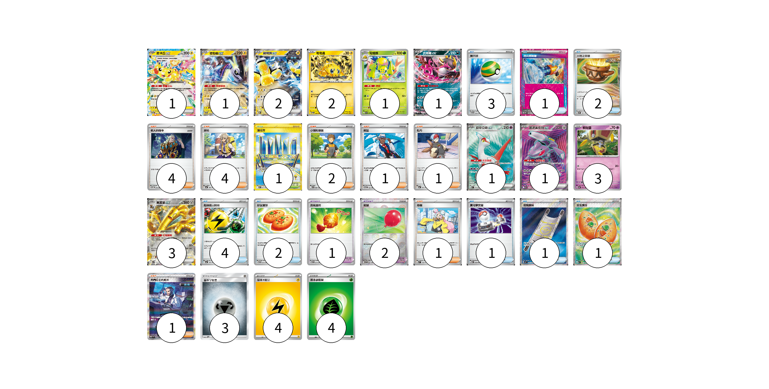 牌組構築方案 以此牌組為基礎新構築牌組 顯示卡面 顯示列表 寶可夢卡(16) 1 1 2 2 1 1 1 1 3 3 寶可夢道具(3) 1 2 物品卡(15) 3 1 2 4 2 1 1 1 支援者卡(14) 4 4 2 1 1 1 1 競技場卡(1) 1 能量卡(11) 3 4 4 寶可夢卡(16) 卡牌名稱 張數 卡牌名稱 張數 皮卡丘ex SV8 033/106 01 密勒頓ex SVTR 008/021 01 鐵臂膀ex SV8a 054/187 02 電電蟲 SV7 032/102 02 電蜘蛛 SV6a 002/064 01 吉雉雞ex SV6a 038/064 01 拉帝亞斯ex SV7a 078/064 01 蓋諾賽克特ex SV11B 164/086 01 索財靈 SV8a 073/187 03 賽富豪ex SV8a 117/187 03 寶可夢道具(3) 卡牌名稱 張數 卡牌名稱 張數 勇氣護符 SVTS 017/022 01 氣球 SV11B 082/086 02 物品卡(15) 卡牌名稱 張數 卡牌名稱 張數 巢穴球 SVTG 012/019 03 頂尖捕捉器 SV8a 148/187 01 大地之容器 SV8a 143/187 02 超級能量回收 SV4a 157/190 04 好友寶芬 SVTG 011/019 02 寶可夢交替 SV9a 058/063 01 夜間擔架 M1L 083/063 01 好友寶芬 M1S 081/063 01 支援者卡(14) 卡牌名稱 張數 卡牌名稱 張數 老大的指令 SVOD 019/020 04 派帕 SV4a 180/190 04 小剛的發掘 SV9 096/100 02 席藍 SV8 102/106 01 牡丹 SV4a 182/190 01 奇樹 SVM 160/175 01 弗圖博士的劇本 SV4M 091/066 01 競技場卡(1) 卡牌名稱 張數 卡牌名稱 張數 釀光市 SV9a 092/063 01 能量卡(11) 卡牌名稱 張數 卡牌名稱 張數 基本鋼能量 AS6D MET 03 基本【雷】能量 SVTR LIG 04 基本【草】能量 SVAM GRA 04 以此牌組為基礎新構築牌組 牌組編碼 DJOqzL-nztUeF-cyTceS copy 列印牌組單 牌組編碼已複製 分享至SNS