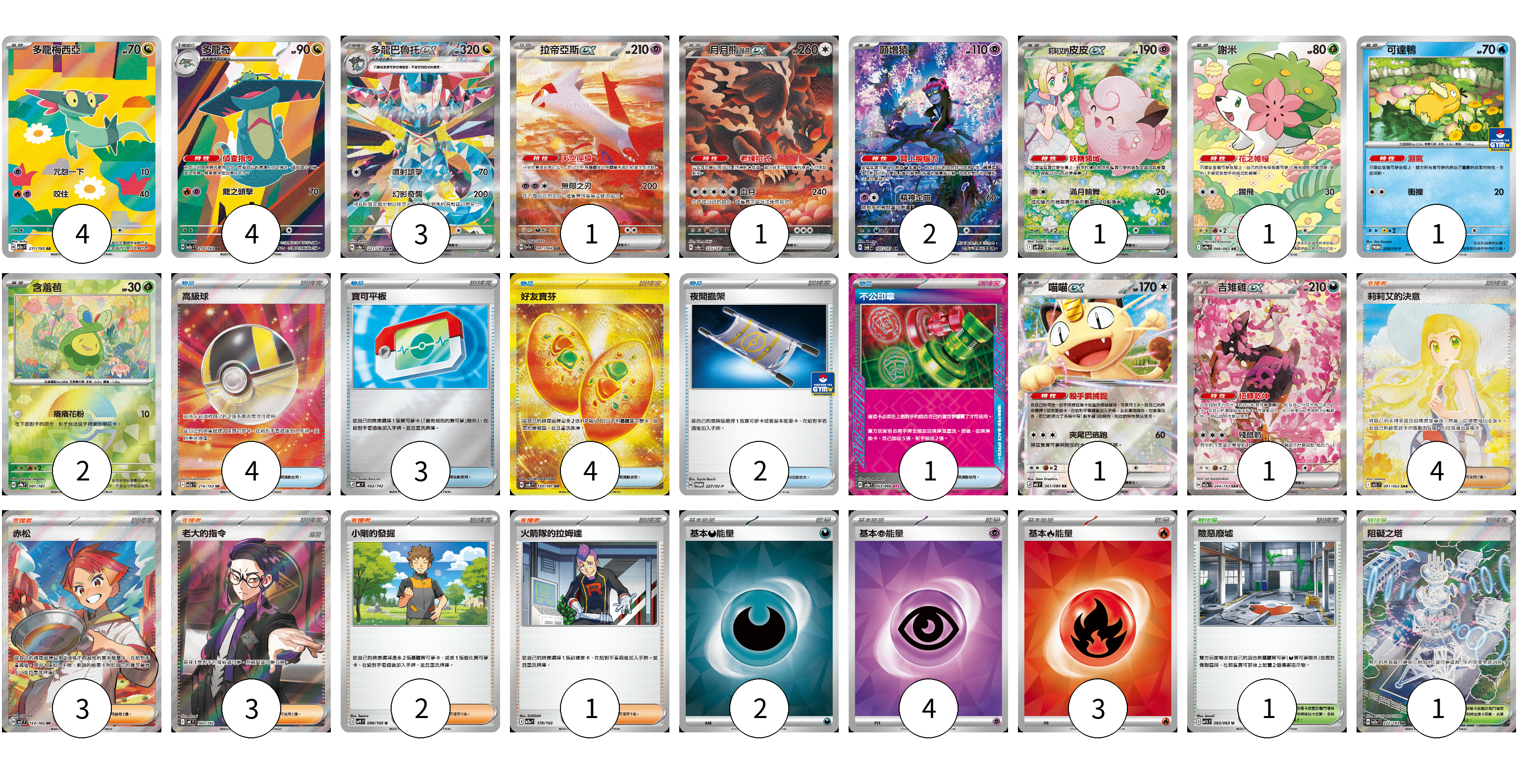 牌組構築方案 以此牌組為基礎新構築牌組 顯示卡面 顯示列表 寶可夢卡(22) 4 4 3 1 1 2 1 1 1 2 1 1 物品卡(14) 4 3 4 2 1 支援者卡(13) 4 3 3 2 1 競技場卡(2) 1 1 能量卡(9) 2 4 3 寶可夢卡(22) 卡牌名稱 張數 卡牌名稱 張數 多龍梅西亞 M2a 211/193 04 多龍奇 M2a 212/193 04 多龍巴魯托ex SV8a 221/187 03 拉帝亞斯ex SV7a 087/064 01 月月熊 赫月ex SV8a 225/187 01 願增猿 SV6 107/101 02 莉莉艾的皮皮ex SV9 126/100 01 謝米 SV9a 066/063 01 可達鴨 SV-P 220/SV-P 01 含羞苞 SV8a 001/187 02 喵喵ex M3 061/080 01 吉雉雞ex M2a 244/193 01 物品卡(14) 卡牌名稱 張數 卡牌名稱 張數 高級球 M2a 216/193 04 寶可平板 MC 662/742 03 好友寶芬 SV6 133/101 04 夜間擔架 SV-P 227/SV-P 02 不公印章 SV5a 053/066 01 支援者卡(13) 卡牌名稱 張數 卡牌名稱 張數 莉莉艾的決意 M1L 091/063 04 赤松 SV7 123/102 03 老大的指令(烏羽) MC 760/742 03 小剛的發掘 SV9 096/100 02 火箭隊的拉姆達 M2a 179/193 01 競技場卡(2) 卡牌名稱 張數 卡牌名稱 張數 險惡廢墟 M1L 063/063 01 阻礙之塔 M2a 222/193 01 能量卡(9) 卡牌名稱 張數 卡牌名稱 張數 基本【惡】能量 SVOM DAR 02 基本【超】能量 SVOD PSY 04 基本【火】能量 SVQL FIR 03 以此牌組為基礎新構築牌組 牌組編碼 DLndyw-lffazJ-MIppFV copy 列印牌組單 牌組編碼已複製 分享至SNS