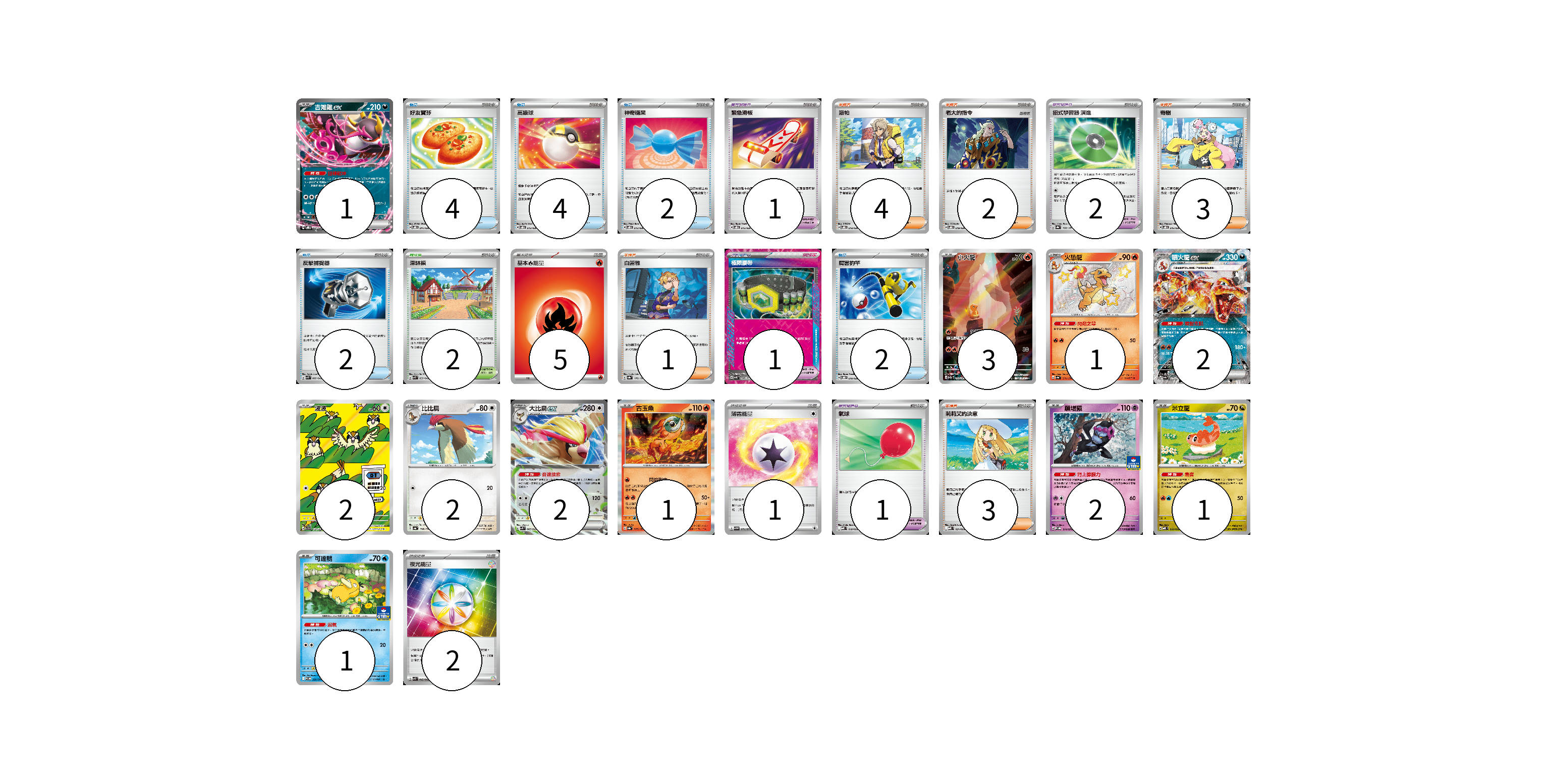 牌組構築方案 以此牌組為基礎新構築牌組 顯示卡面 顯示列表 寶可夢卡(18) 1 3 1 2 2 2 2 1 2 1 1 寶可夢道具(5) 1 2 1 1 物品卡(14) 4 4 2 2 2 支援者卡(13) 4 2 3 1 3 競技場卡(2) 2 能量卡(8) 5 1 2 寶可夢卡(18) 卡牌名稱 張數 卡牌名稱 張數 吉雉雞ex SVOD 004/020 01 小火龍 SV2a 168/165 03 火恐龍 SV4a 211/190 01 噴火龍ex SV4a 115/190 02 波波 SV3 118/108 02 比比鳥 SV4a 138/190 02 大比鳥ex SVK 005/042 02 古玉魚 SV8a 025/187 01 願增猿 M-P 014/M-P 02 米立龍 MBD 010/022 01 可達鴨 SV-P 220/SV-P 01 寶可夢道具(5) 卡牌名稱 張數 卡牌名稱 張數 緊急滑板 SVOD 015/020 01 招式學習器 演進 SV8a 160/187 02 極限腰帶 SV5K 066/071 01 氣球 MBD 018/022 01 物品卡(14) 卡牌名稱 張數 卡牌名稱 張數 好友寶芬 SVOD 011/020 04 高級球 SVOD 012/020 04 神奇糖果 SVOD 013/020 02 反擊捕捉器 SVK 009/042 02 厲害釣竿 SVOD 010/020 02 支援者卡(13) 卡牌名稱 張數 卡牌名稱 張數 派帕 SVOD 018/020 04 老大的指令 SVOD 019/020 02 奇樹 SVOD 016/020 03 白蕾雅 SV8a 176/187 01 莉莉艾的決意 MBD 021/022 03 競技場卡(2) 卡牌名稱 張數 卡牌名稱 張數 深缽鎮 SVK 039/042 02 能量卡(8) 卡牌名稱 張數 卡牌名稱 張數 基本【火】能量 SVTL FIR 05 薄霧能量 SV5M 071/071 01 夜光能量 SVK 042/042 02 以此牌組為基礎新構築牌組 牌組編碼 DLvbqz-NntDAt-XRJGoK copy 列印牌組單 牌組編碼已複製 分享至SNS
