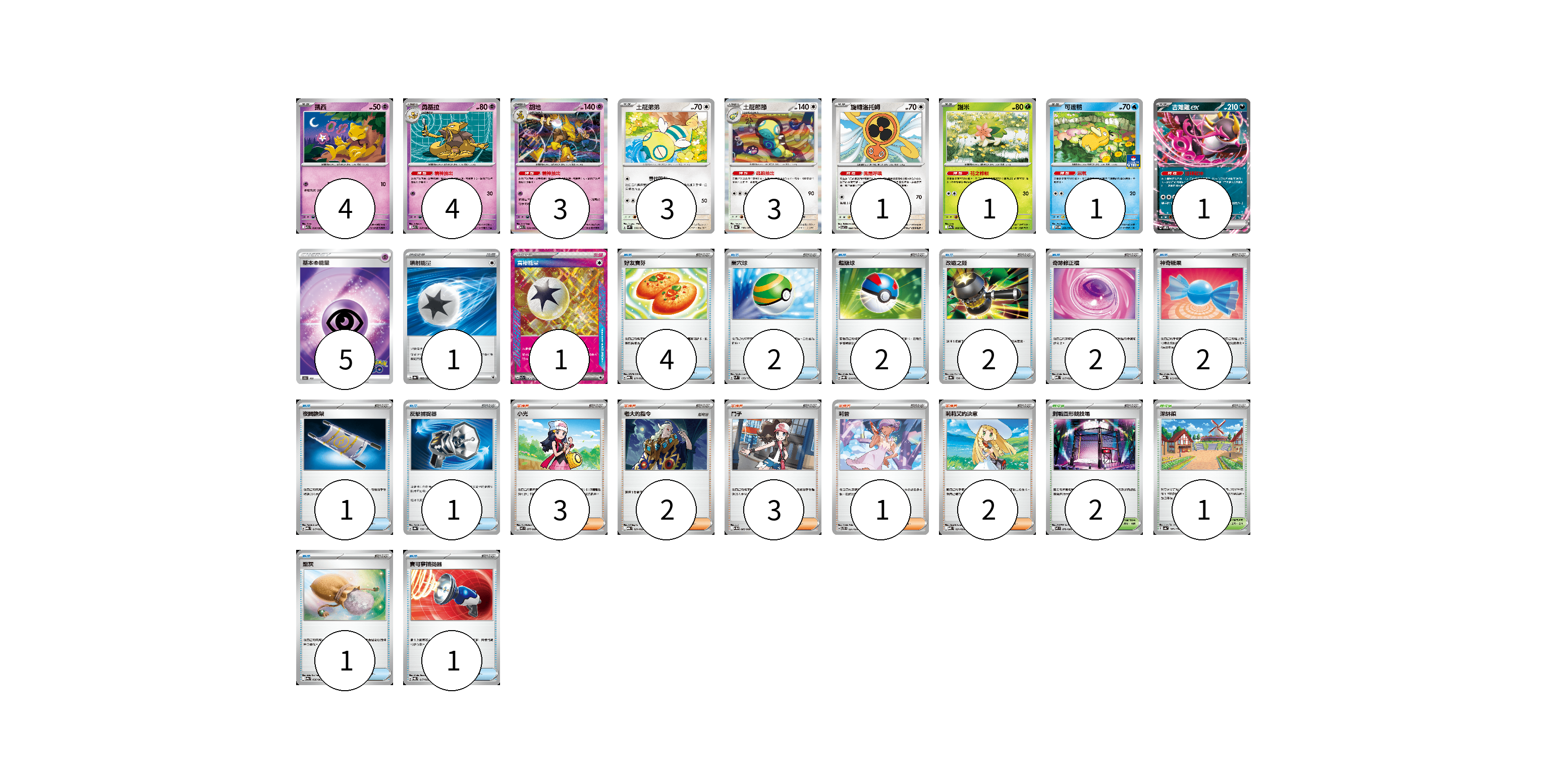 牌組構築方案 以此牌組為基礎新構築牌組 顯示卡面 顯示列表 寶可夢卡(21) 4 4 3 3 3 1 1 1 1 物品卡(18) 4 2 2 2 2 2 1 1 1 1 支援者卡(11) 3 2 3 1 2 競技場卡(3) 2 1 能量卡(7) 5 1 1 寶可夢卡(21) 卡牌名稱 張數 卡牌名稱 張數 凱西 M1S 036/063 04 勇基拉 M1S 037/063 04 胡地 M1S 038/063 03 土龍弟弟 SV2P 056/071 03 土龍節節 SV8a 130/187 03 旋轉洛托姆 SV7 080/102 01 謝米 SV9a 006/063 01 可達鴨 SV-P 220/SV-P 01 吉雉雞ex SVOM 009/021 01 物品卡(18) 卡牌名稱 張數 卡牌名稱 張數 好友寶芬 MBG 011/022 04 巢穴球 SVM 133/175 02 超級球 SVQP 014/023 02 改造之錘 SV8a 138/187 02 奇跡修正檔 MBD 017/022 02 神奇糖果 MBG 013/022 02 夜間擔架 MBG 017/022 01 反擊捕捉器 SV8a 139/187 01 聖灰 SV9a 056/063 01 寶可夢捕捉器 SVQL 017/022 01 支援者卡(11) 卡牌名稱 張數 卡牌名稱 張數 小光 M2 077/080 03 老大的指令 MBG 021/022 02 鬥子 SV11W 085/086 03 莉普 SVTS 021/022 01 莉莉艾的決意 MBD 021/022 02 競技場卡(3) 卡牌名稱 張數 卡牌名稱 張數 對戰圓形競技場 M2 079/080 02 深缽鎮 SV4a 185/190 01 能量卡(7) 卡牌名稱 張數 卡牌名稱 張數 基本超能量 S10b PSY 05 噴射能量 SV8a 185/187 01 富裕能量 SV7a 064/064 01 以此牌組為基礎新構築牌組 牌組編碼 DMQuTR-iGQbNs-DuxEVM copy 列印牌組單 牌組編碼已複製 分享至SNS