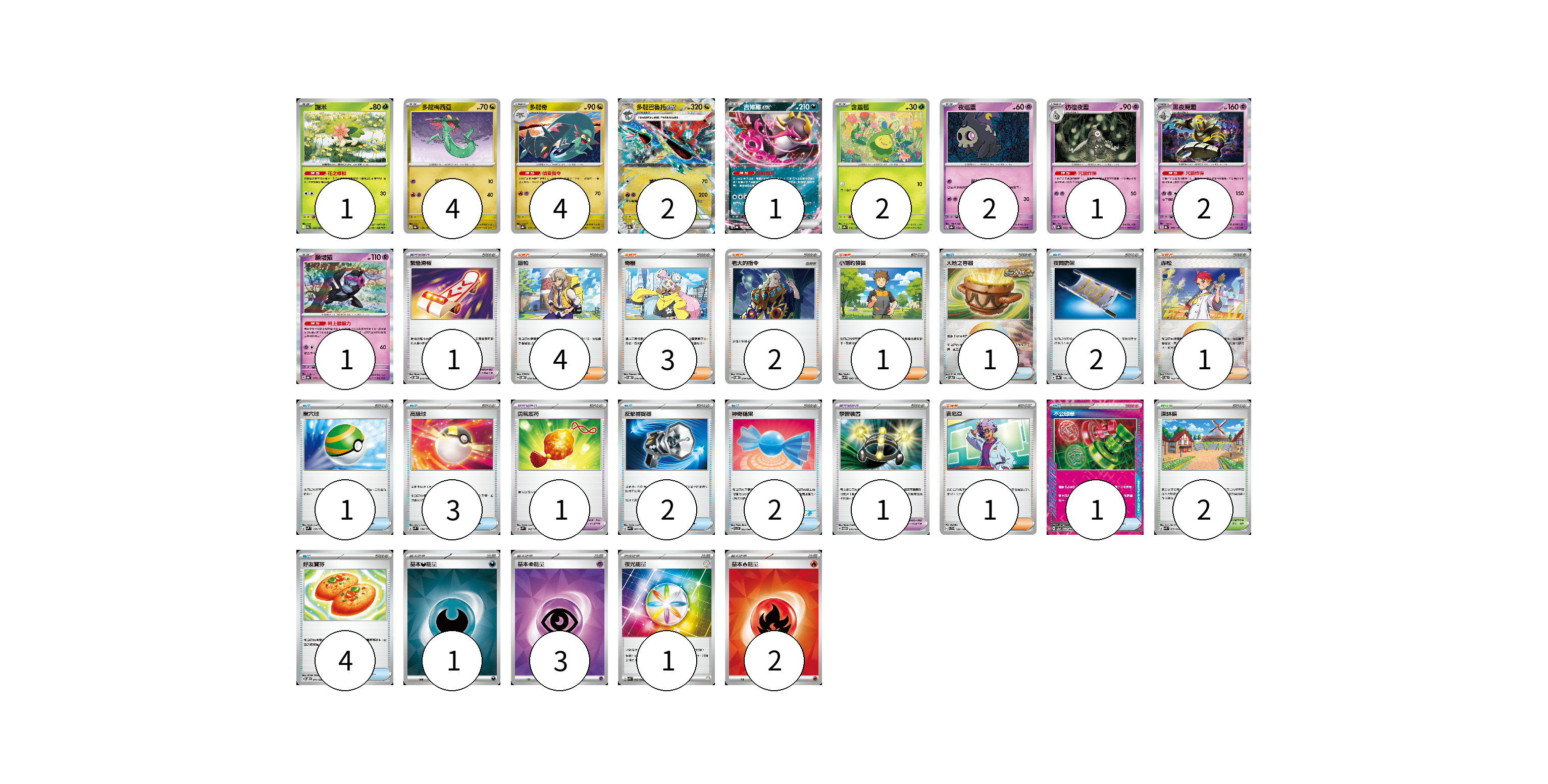 牌組構築方案 以此牌組為基礎新構築牌組 顯示卡面 顯示列表 寶可夢卡(20) 1 4 4 2 1 2 2 1 2 1 寶可夢道具(3) 1 1 1 物品卡(16) 1 2 1 3 2 2 1 4 支援者卡(12) 4 3 2 1 1 1 競技場卡(2) 2 能量卡(7) 1 3 1 2 寶可夢卡(20) 卡牌名稱 張數 卡牌名稱 張數 謝米 SV9a 006/063 01 多龍梅西亞 SV8a 118/187 04 多龍奇 SV8a 119/187 04 多龍巴魯托ex SV8a 120/187 02 吉雉雞ex SV8a 104/187 01 含羞苞 SV8a 001/187 02 夜巡靈 SV8a 064/187 02 彷徨夜靈 SV8a 065/187 01 黑夜魔靈 SV8a 066/187 02 願增猿 SV8a 075/187 01 寶可夢道具(3) 卡牌名稱 張數 卡牌名稱 張數 緊急滑板 SVOD 015/020 01 勇氣護符 SVM 142/175 01 學習裝置 SVTM 016/022 01 物品卡(16) 卡牌名稱 張數 卡牌名稱 張數 大地之容器 SV8a 143/187 01 夜間擔架 SV8a 151/187 02 巢穴球 SVM 133/175 01 高級球 SVM 134/175 03 反擊捕捉器 SVK 009/042 02 神奇糖果 SVI 053/066 02 不公印章 SV5a 053/066 01 好友寶芬 SVOD 011/020 04 支援者卡(12) 卡牌名稱 張數 卡牌名稱 張數 派帕 SVOD 018/020 04 奇樹 SVOD 016/020 03 老大的指令 SVOD 019/020 02 小剛的發掘 SV9 096/100 01 赤松 SV8a 163/187 01 吉尼亞 SVD 129/139 01 競技場卡(2) 卡牌名稱 張數 卡牌名稱 張數 深缽鎮 SVK 039/042 02 能量卡(7) 卡牌名稱 張數 卡牌名稱 張數 基本【惡】能量 SVOM DAR 01 基本【超】能量 SVOD PSY 03 夜光能量 SVK 042/042 01 基本【火】能量 SVK FIR 02 以此牌組為基礎新構築牌組 牌組編碼 DNVvwI-dVzash-ANUPrG copy 列印牌組單 牌組編碼已複製 分享至SNS