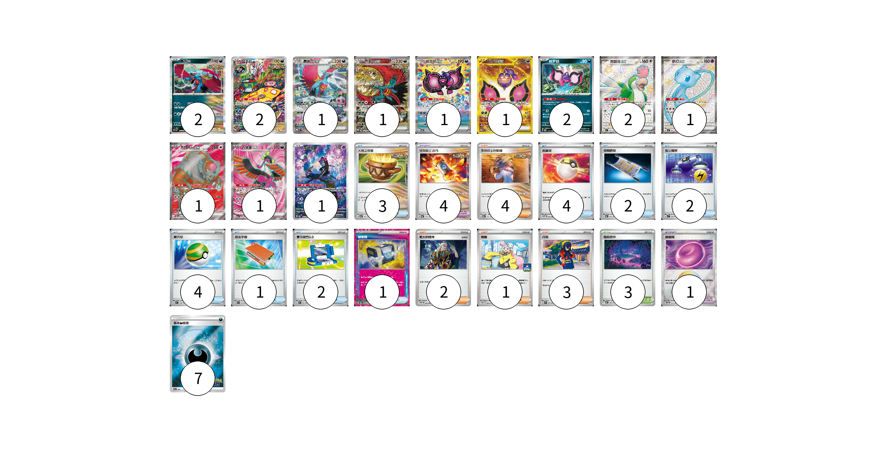牌組構築方案 以此牌組為基礎新構築牌組 顯示卡面 顯示列表 寶可夢卡(16) 2 2 1 1 1 1 2 2 1 1 1 1 寶可夢道具(5) 4 1 物品卡(19) 3 4 2 2 4 1 2 1 支援者卡(10) 4 2 1 3 競技場卡(3) 3 能量卡(7) 7 寶可夢卡(16) 卡牌名稱 張數 卡牌名稱 張數 轟鳴月 SV5K 051/071 02 猛惡菇 SV4K 077/066 02 轟鳴月ex SV4K 090/066 01 轟鳴月ex SV8a 218/187 01 桃歹郎ex SV8a 219/187 01 桃歹郎ex SV6a 092/064 01 桃歹郎 SV8 075/106 02 怒鸚哥ex SV4a 337/190 02 夢幻ex SV4a 327/190 01 月月熊 赫月 ex SV5a 084/066 01 吉雉雞ex SV6a 081/064 01 願增猿 SV6 107/101 01 寶可夢道具(5) 卡牌名稱 張數 卡牌名稱 張數 驅勁能量 古代 SV8a 157/187 04 鎖鏈糬 SV8a 154/187 01 物品卡(19) 卡牌名稱 張數 卡牌名稱 張數 大地之容器 SV8a 143/187 03 高級球 SVOD 012/020 04 夜間擔架 SV8a 151/187 02 能量轉移 SVM 127/175 02 巢穴球 SVM 133/175 04 朋友手冊 SVK 014/042 01 寶可裝置3.0 SVK 021/042 02 秘密箱 SV6 092/101 01 支援者卡(10) 卡牌名稱 張數 卡牌名稱 張數 奧琳博士的氣魄 SV8a 167/187 04 老大的指令 SVOD 019/020 02 奇樹 SV-P 106/SV-P 01 丹瑜 SVK 030/042 03 競技場卡(3) 卡牌名稱 張數 卡牌名稱 張數 危險密林 SV5K 070/071 03 能量卡(7) 卡牌名稱 張數 卡牌名稱 張數 基本惡能量 S10b DAR 07 以此牌組為基礎新構築牌組 牌組編碼 DNhXaa-vZbAdC-Pgznlf copy 列印牌組單 牌組編碼已複製 分享至SNS