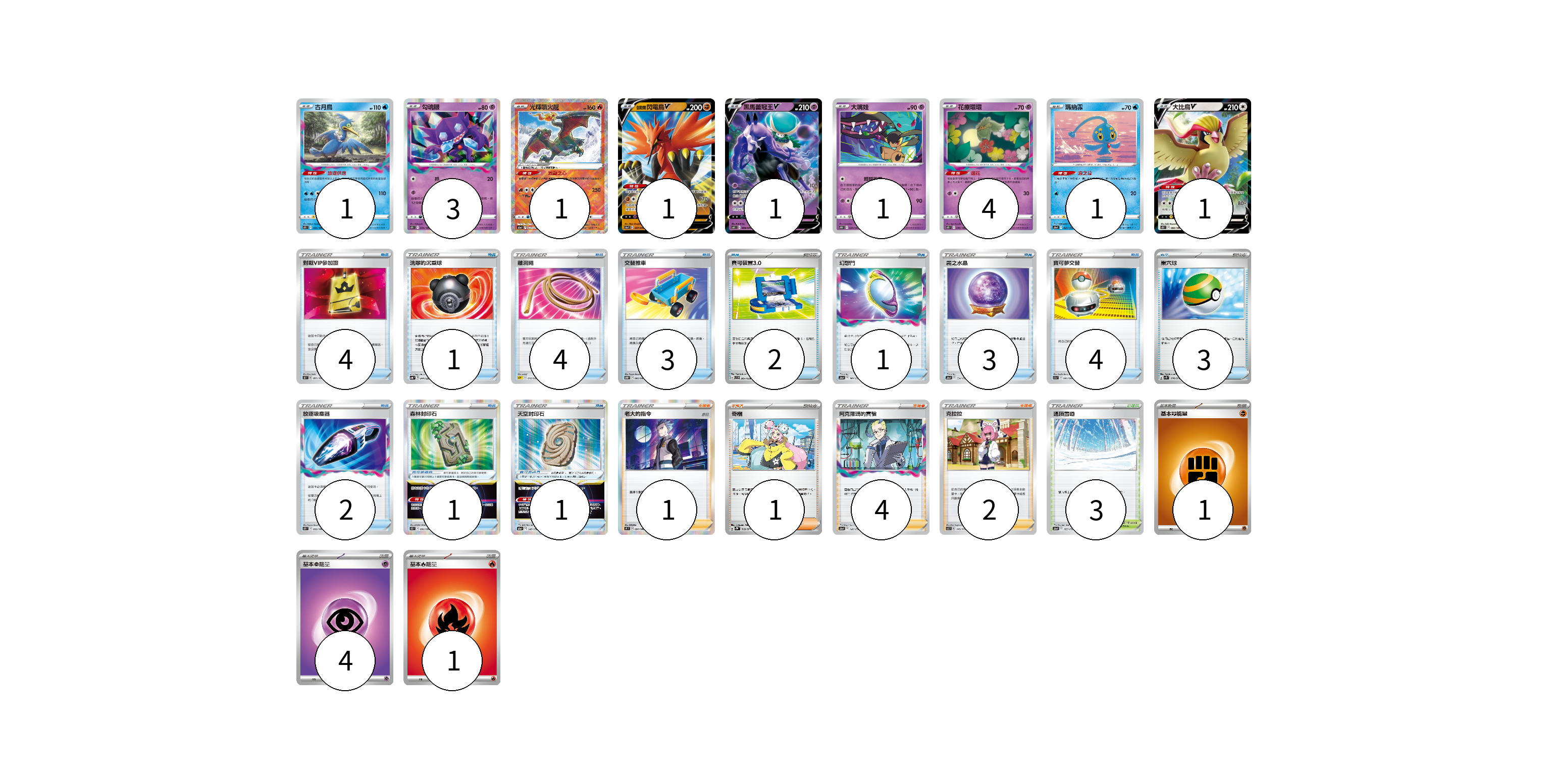 牌組構築方案 以此牌組為基礎新構築牌組 顯示卡面 顯示列表 寶可夢卡(14) 1 3 1 1 1 1 4 1 1 寶可夢道具(2) 1 1 物品卡(27) 4 1 4 3 2 1 3 4 3 2 支援者卡(8) 1 1 4 2 競技場卡(3) 3 能量卡(6) 1 4 1 寶可夢卡(14) 卡牌名稱 張數 卡牌名稱 張數 古月鳥 S11 033/100 01 勾魂眼 S11 044/100 03 光輝噴火龍 S12a 015/172 01 伽勒爾 閃電鳥V S5a 037/070 01 黑馬蕾冠王V S6K 036/070 01 大嘴娃 S10D 024/067 01 花療環環 S11 049/100 04 瑪納霏 S12a 029/172 01 大比鳥V S11 082/100 01 寶可夢道具(2) 卡牌名稱 張數 卡牌名稱 張數 森林封印石 S12 092/098 01 天空封印石 S12a 146/172 01 物品卡(27) 卡牌名稱 張數 卡牌名稱 張數 對戰VIP參加證 S8 091/100 04 洗翠的沉重球 SVB 014/028 01 離洞繩 SDP 012/022 04 交替推車 S10D 060/067 03 寶可裝置3.0 SVB 004/028 02 幻想門 S12a 141/172 01 霧之水晶 S12a 134/172 03 寶可夢交替 S11a 061/068 04 巢穴球 SV1S 070/078 03 放逐吸塵器 S11 093/100 02 支援者卡(8) 卡牌名稱 張數 卡牌名稱 張數 老大的指令(赤日) S9 097/100 01 奇樹 SV2D 069/071 01 阿克羅瑪的實驗 S12a 148/172 04 克拉拉 SCC 145/172 02 競技場卡(3) 卡牌名稱 張數 卡牌名稱 張數 通頂雪道 S12a 165/172 03 能量卡(6) 卡牌名稱 張數 卡牌名稱 張數 基本【鬥】能量 SVAM FIG 01 基本超能量 sv-p PSY 04 基本火能量 sv-p FIR 01 以此牌組為基礎新構築牌組 牌組編碼 DOvpQe-hyiSRP-idlmfv copy 列印牌組單 牌組編碼已複製 分享至SNS