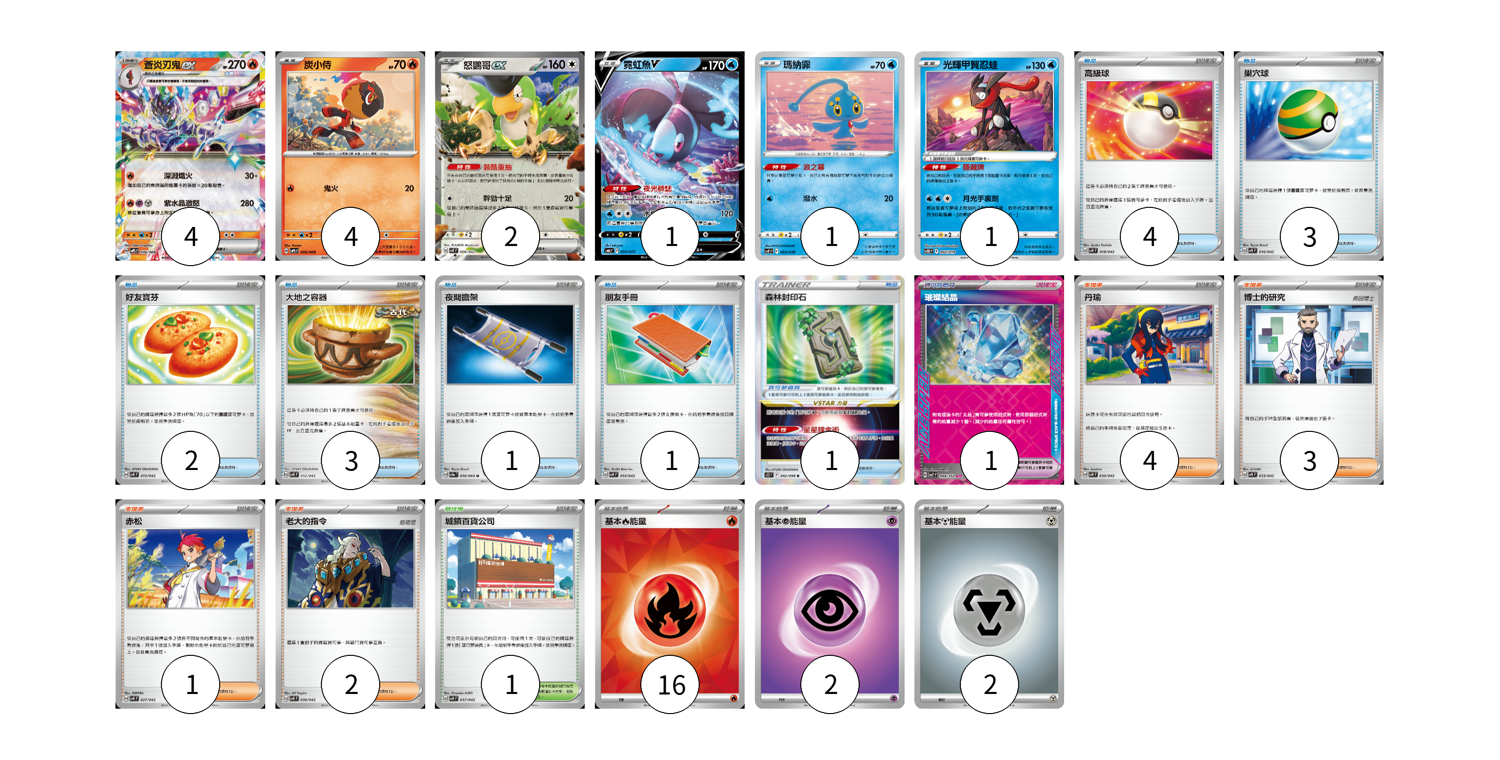 牌組構築方案 以此牌組為基礎新構築牌組 顯示卡面 顯示列表 寶可夢卡(13) 4 4 2 1 1 1 寶可夢道具(2) 1 1 物品卡(14) 4 3 2 3 1 1 支援者卡(10) 4 3 1 2 競技場卡(1) 1 能量卡(20) 16 2 2 寶可夢卡(13) 卡牌名稱 張數 卡牌名稱 張數 蒼炎刃鬼ex SVPS 006/008 04 炭小侍 SVPS 005/008 04 怒鸚哥ex SVK 006/042 02 霓虹魚V SVHK 004/022 01 瑪納霏 SVF 003/038 01 光輝甲賀忍蛙 SVTG 002/019 01 寶可夢道具(2) 卡牌名稱 張數 卡牌名稱 張數 森林封印石 S12 092/098 01 璀璨結晶 SV7 094/102 01 物品卡(14) 卡牌名稱 張數 卡牌名稱 張數 高級球 SVK 018/042 04 巢穴球 SVK 016/042 03 好友寶芬 SVK 015/042 02 大地之容器 SVK 012/042 03 夜間擔架 SV6a 056/064 01 朋友手冊 SVK 014/042 01 支援者卡(10) 卡牌名稱 張數 卡牌名稱 張數 丹瑜 SVK 030/042 04 博士的研究 SVK 033/042 03 赤松 SVK 027/042 01 老大的指令 SVK 036/042 02 競技場卡(1) 卡牌名稱 張數 卡牌名稱 張數 城鎮百貨公司 SVK 037/042 01 能量卡(20) 卡牌名稱 張數 卡牌名稱 張數 基本【火】能量 SVK FIR 16 基本超能量 sv-p PSY 02 基本鋼能量 sv-p MET 02 以此牌組為基礎新構築牌組 牌組編碼 DPEBXn-vTWOoo-YquVuq copy 列印牌組單 牌組編碼已複製 分享至SNS