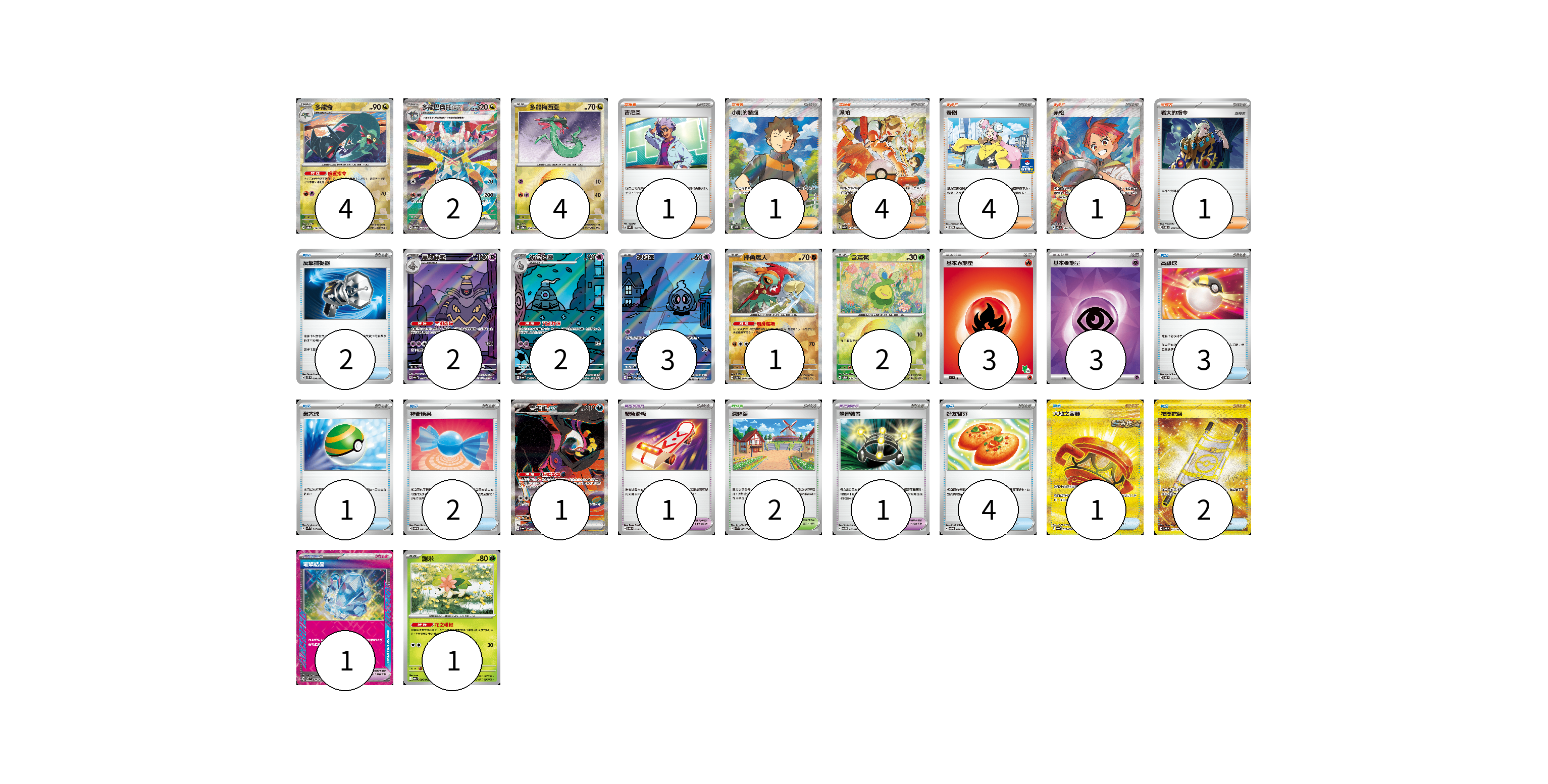 牌組構築方案 以此牌組為基礎新構築牌組 顯示卡面 顯示列表 寶可夢卡(22) 4 2 4 2 2 3 1 2 1 1 寶可夢道具(3) 1 1 1 物品卡(15) 2 3 1 2 4 1 2 支援者卡(12) 1 1 4 4 1 1 競技場卡(2) 2 能量卡(6) 3 3 寶可夢卡(22) 卡牌名稱 張數 卡牌名稱 張數 多龍奇 SV8a 119/187 04 多龍巴魯托ex SV8a 221/187 02 多龍梅西亞 SV8a 118/187 04 黑夜魔靈 SV6a 070/064 02 彷徨夜靈 SV6a 069/064 02 夜巡靈 SV6a 068/064 03 摔角鷹人 SV8a 084/187 01 含羞苞 SV8a 001/187 02 吉雉雞ex SV6a 089/064 01 謝米 SV9a 006/063 01 寶可夢道具(3) 卡牌名稱 張數 卡牌名稱 張數 緊急滑板 SVOD 015/020 01 學習裝置 SVTM 016/022 01 璀璨結晶 SV7 094/102 01 物品卡(15) 卡牌名稱 張數 卡牌名稱 張數 反擊捕捉器 SVTS 009/022 02 高級球 SVOD 012/020 03 巢穴球 SVK 016/042 01 神奇糖果 SVOM 014/021 02 好友寶芬 SVOD 011/020 04 大地之容器 SV6a 093/064 01 夜間擔架 SV8 137/106 02 支援者卡(12) 卡牌名稱 張數 卡牌名稱 張數 吉尼亞 SVAL 017/021 01 小剛的發掘 SV9 123/100 01 派帕 SV4a 353/190 04 奇樹 SV-P 106/SV-P 04 赤松 SV7 123/102 01 老大的指令 SVOD 019/020 01 競技場卡(2) 卡牌名稱 張數 卡牌名稱 張數 深缽鎮 SVK 039/042 02 能量卡(6) 卡牌名稱 張數 卡牌名稱 張數 基本【火】能量 SVI FIR 03 基本【超】能量 SVOD PSY 03 以此牌組為基礎新構築牌組 牌組編碼 DRSFhG-BDGqNA-QYrfny copy 列印牌組單 牌組編碼已複製 分享至SNS