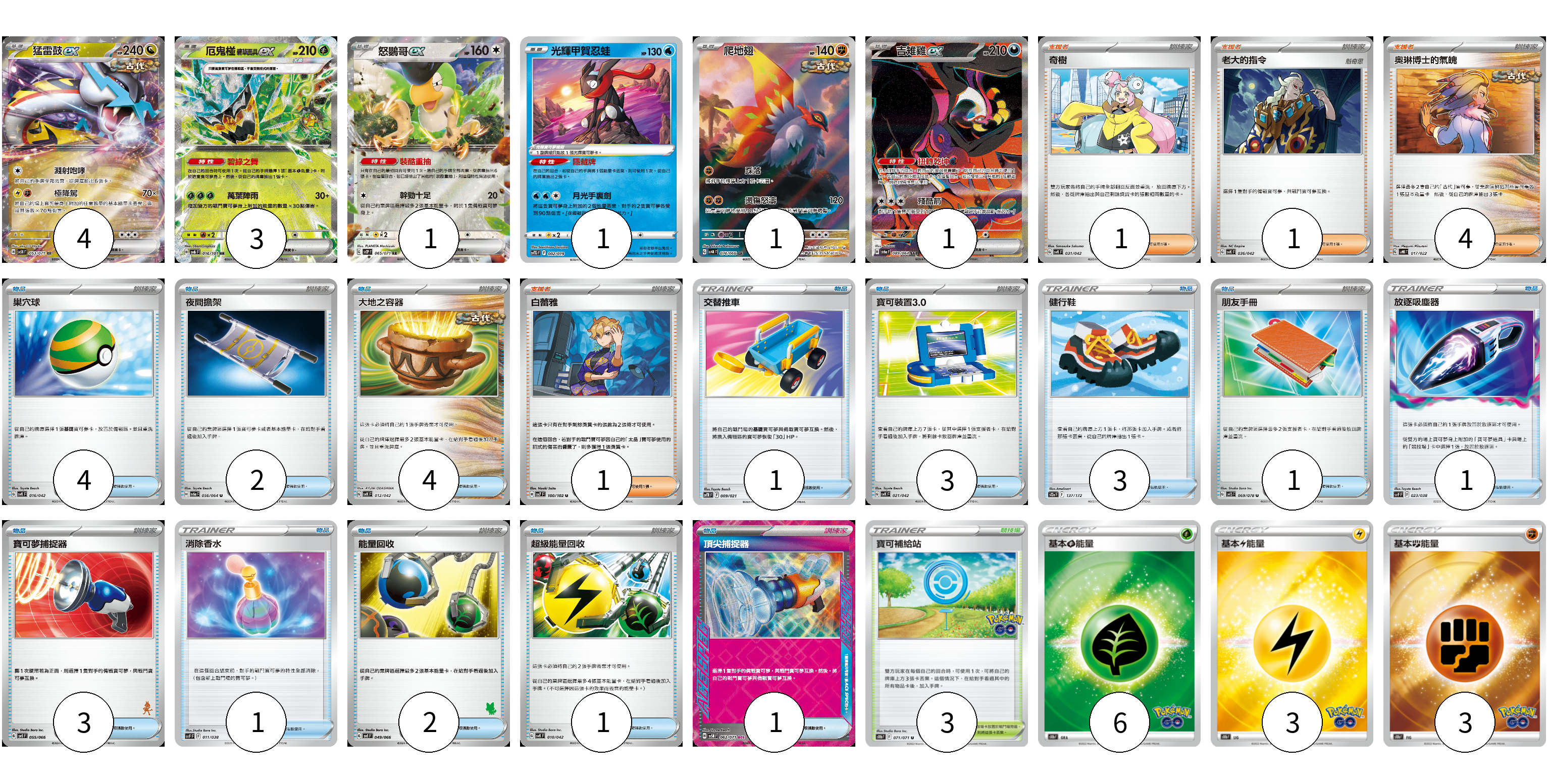 牌組構築方案 以此牌組為基礎新構築牌組 顯示卡面 顯示列表 寶可夢卡(11) 4 3 1 1 1 1 物品卡(27) 4 2 4 1 3 3 1 1 3 1 2 1 1 支援者卡(7) 1 1 4 1 競技場卡(3) 3 能量卡(12) 6 3 3 寶可夢卡(11) 卡牌名稱 張數 卡牌名稱 張數 猛雷鼓ex SV5K 053/071 04 厄鬼椪 碧草面具ex SV6 016/101 03 怒鸚哥ex SV2P 065/071 01 光輝甲賀忍蛙 SVTG 002/019 01 爬地翅 SV4K 074/066 01 吉雉雞ex SV6a 089/064 01 物品卡(27) 卡牌名稱 張數 卡牌名稱 張數 巢穴球 SVK 016/042 04 夜間擔架 SV6a 056/064 02 大地之容器 SVK 012/042 04 交替推車 SVTR 009/021 01 寶可裝置3.0 SVK 021/042 03 健行鞋 S12a 137/172 03 朋友手冊 SV1S 069/078 01 放逐吸塵器 SVF 023/038 01 寶可夢捕捉器 SVI 055/066 03 消除香水 SVF 011/038 01 能量回收 SVI 049/066 02 超級能量回收 SVK 010/042 01 頂尖捕捉器 SV5M 062/071 01 支援者卡(7) 卡牌名稱 張數 卡牌名稱 張數 奇樹 SVK 031/042 01 老大的指令 SVK 036/042 01 奧琳博士的氣魄 SVHK 017/022 04 白蕾雅 SV7 100/102 01 競技場卡(3) 卡牌名稱 張數 卡牌名稱 張數 寶可補給站 S10b 071/071 03 能量卡(12) 卡牌名稱 張數 卡牌名稱 張數 基本草能量 S10b GRA 06 基本雷能量 S10b LIG 03 基本鬥能量 S10b FIG 03 以此牌組為基礎新構築牌組 牌組編碼 DRfcaB-hJWbhQ-YjiVGk copy 列印牌組單 牌組編碼已複製 分享至SNS