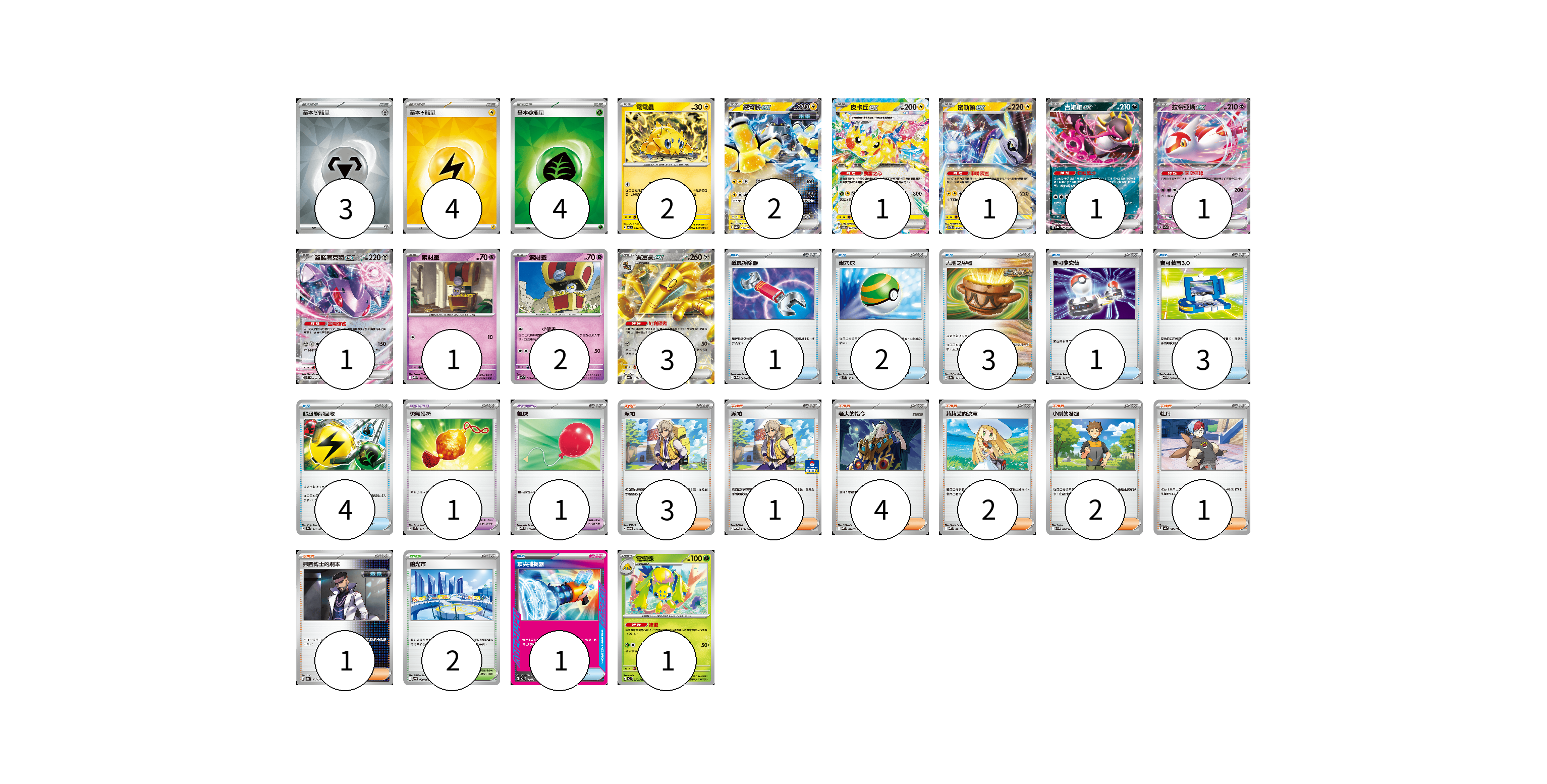 牌組構築方案 以此牌組為基礎新構築牌組 顯示卡面 顯示列表 寶可夢卡(16) 2 2 1 1 1 1 1 1 2 3 1 寶可夢道具(2) 1 1 物品卡(15) 1 2 3 1 3 4 1 支援者卡(14) 3 1 4 2 2 1 1 競技場卡(2) 2 能量卡(11) 3 4 4 寶可夢卡(16) 卡牌名稱 張數 卡牌名稱 張數 電電蟲 SV7 032/102 02 鐵臂膀ex SV8a 054/187 02 皮卡丘ex SV8 033/106 01 密勒頓ex SVTR 008/021 01 吉雉雞ex SV8a 104/187 01 拉帝亞斯ex SV7a 019/064 01 蓋諾賽克特ex SV11B 069/086 01 索財靈 M1L 019/063 01 索財靈 SV7a 024/064 02 賽富豪ex SV8a 117/187 03 電蜘蛛 MC 050/742 01 寶可夢道具(2) 卡牌名稱 張數 卡牌名稱 張數 勇氣護符 SVM 142/175 01 氣球 MBD 018/022 01 物品卡(15) 卡牌名稱 張數 卡牌名稱 張數 道具拆除器 SV11W 080/086 01 巢穴球 SVM 133/175 02 大地之容器 SV8a 143/187 03 寶可夢交替 MBG 015/022 01 寶可裝置3.0 SV11B 081/086 03 超級能量回收 SV8a 141/187 04 頂尖捕捉器 MC 656/742 01 支援者卡(14) 卡牌名稱 張數 卡牌名稱 張數 派帕 SVOD 018/020 03 派帕 SV-P 213/SV-P 01 老大的指令 MBD 020/022 04 莉莉艾的決意 MBD 021/022 02 小剛的發掘 SV9 096/100 02 牡丹 SV4a 182/190 01 弗圖博士的劇本 SV8a 175/187 01 競技場卡(2) 卡牌名稱 張數 卡牌名稱 張數 釀光市 SV9 098/100 02 能量卡(11) 卡牌名稱 張數 卡牌名稱 張數 基本【鋼】能量 SVOD MET 03 基本【雷】能量 SVM LIG 04 基本【草】能量 SVM GRA 04 以此牌組為基礎新構築牌組 牌組編碼 DStVSM-ZQRnOR-vCxgco copy 列印牌組單 牌組編碼已複製 分享至SNS