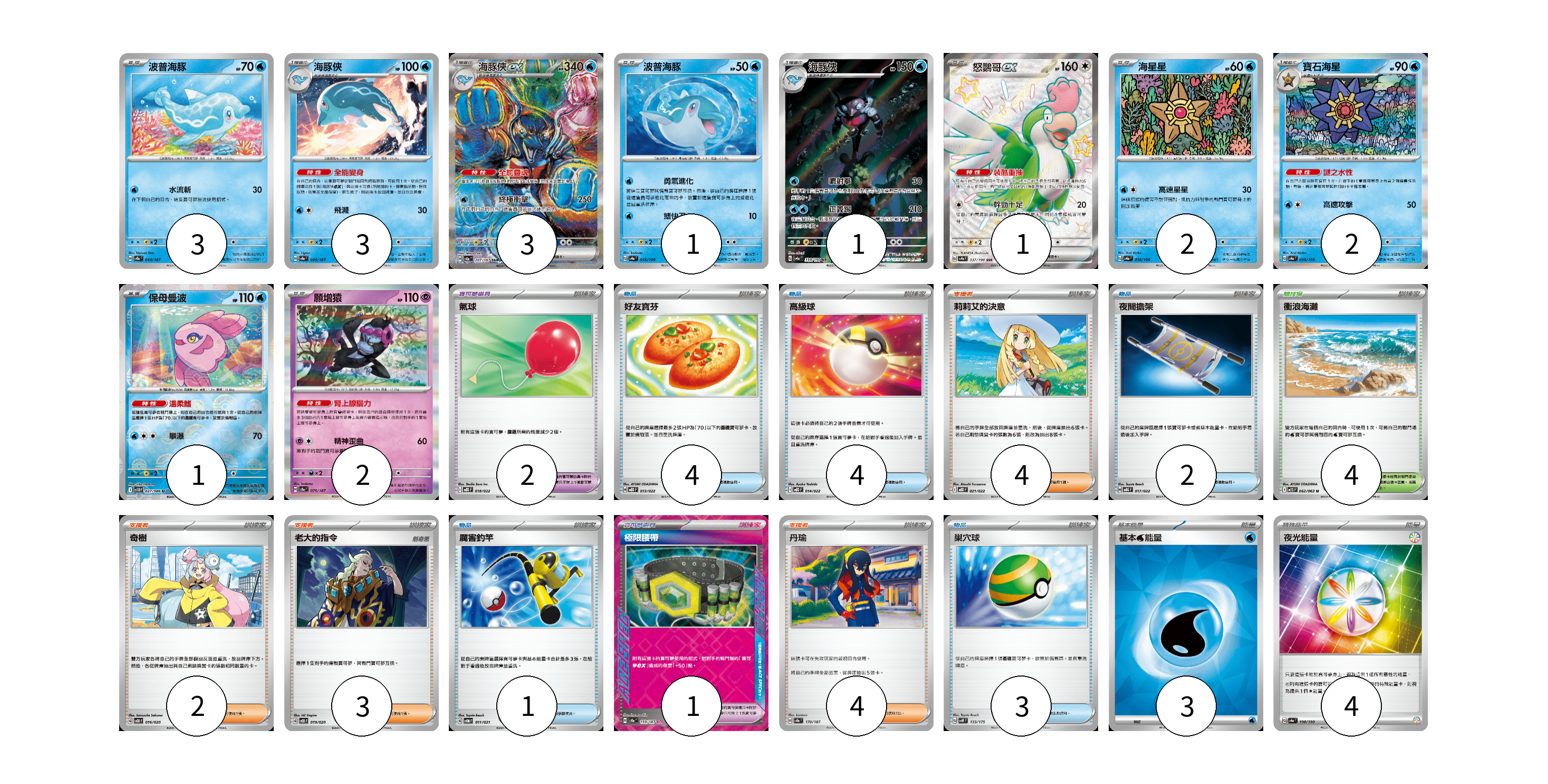 牌組構築方案 以此牌組為基礎新構築牌組 顯示卡面 顯示列表 寶可夢卡(19) 3 3 3 1 1 1 2 2 1 2 寶可夢道具(3) 2 1 物品卡(14) 4 4 2 1 3 支援者卡(13) 4 2 3 4 競技場卡(4) 4 能量卡(7) 3 4 寶可夢卡(19) 卡牌名稱 張數 卡牌名稱 張數 波普海豚 SV8a 044/187 03 海豚俠 SV8a 045/187 03 海豚俠ex SV8a 207/187 03 波普海豚 SV4a 046/190 01 海豚俠 SV4a 339/190 01 怒鸚哥ex SV4a 337/190 01 海星星 SV4a 038/190 02 寶石海星 SV4a 039/190 02 保母曼波 SV11B 027/086 01 願增猿 SV8a 075/187 02 寶可夢道具(3) 卡牌名稱 張數 卡牌名稱 張數 氣球 MBD 018/022 02 極限腰帶 SV8a 159/187 01 物品卡(14) 卡牌名稱 張數 卡牌名稱 張數 好友寶芬 MBD 013/022 04 高級球 MBD 014/022 04 夜間擔架 MBG 017/022 02 厲害釣竿 SVOM 011/021 01 巢穴球 SVM 133/175 03 支援者卡(13) 卡牌名稱 張數 卡牌名稱 張數 莉莉艾的決意 MBD 021/022 04 奇樹 SVOD 016/020 02 老大的指令 SVOD 019/020 03 丹瑜 SV8a 170/187 04 競技場卡(4) 卡牌名稱 張數 卡牌名稱 張數 衝浪海灘 M1S 062/063 04 能量卡(7) 卡牌名稱 張數 卡牌名稱 張數 基本【水】能量 SVK WAT 03 夜光能量 SV4a 190/190 04 以此牌組為基礎新構築牌組 牌組編碼 DUKkMN-cxzsxg-jkDOpc copy 列印牌組單 牌組編碼已複製 分享至SNS