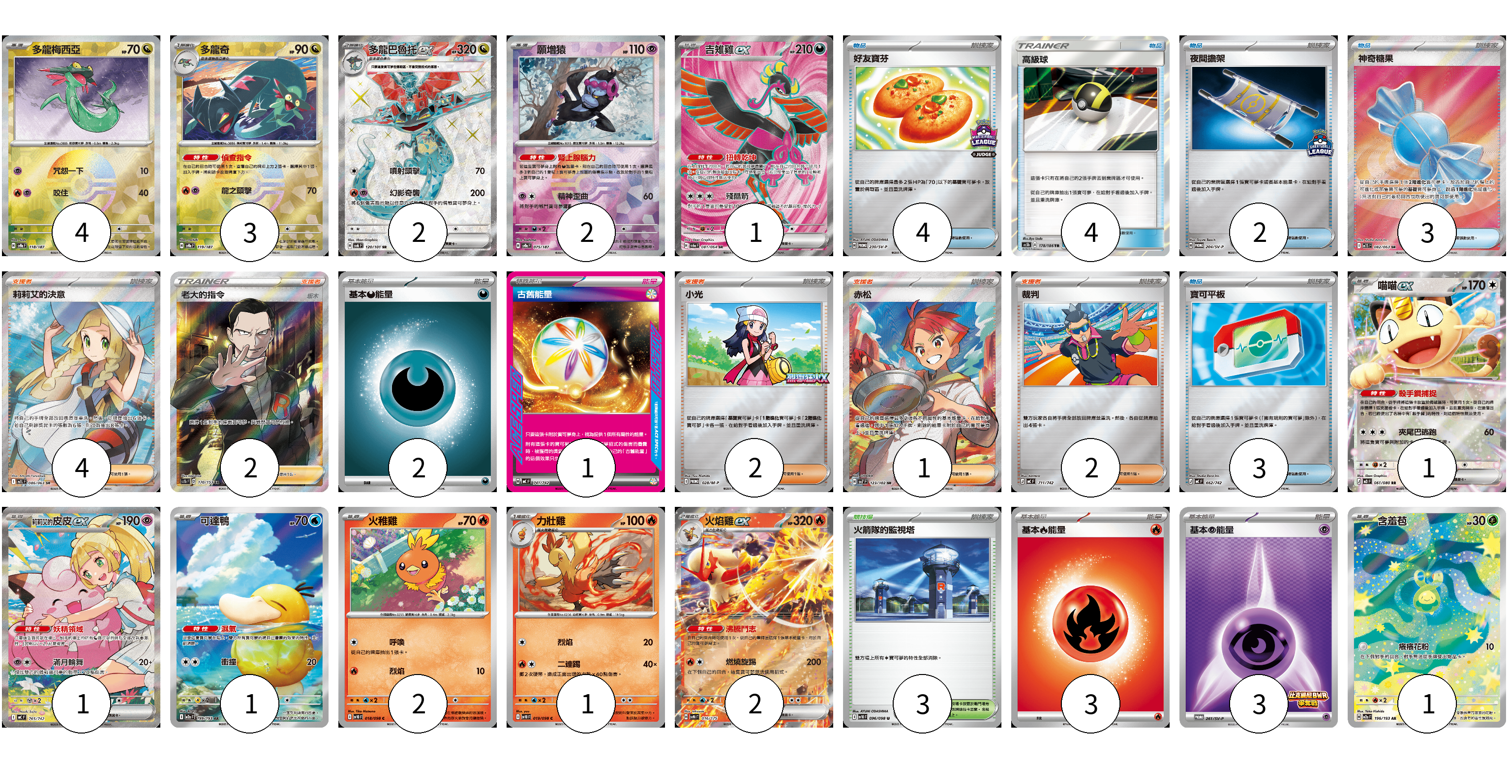 牌組構築方案 以此牌組為基礎新構築牌組 顯示卡面 顯示列表 寶可夢卡(21) 4 3 2 2 1 1 1 1 2 1 2 1 物品卡(16) 4 4 2 3 3 支援者卡(11) 4 2 2 1 2 競技場卡(3) 3 能量卡(9) 2 1 3 3 寶可夢卡(21) 卡牌名稱 張數 卡牌名稱 張數 多龍梅西亞 SV8a 118/187 04 多龍奇 SV8a 119/187 03 多龍巴魯托ex SV6 120/101 02 願增猿 SV8a 075/187 02 吉雉雞ex SV6a 081/064 01 喵喵ex M3 061/080 01 莉莉艾的皮皮ex MC 765/742 01 可達鴨 M2a 199/193 01 火稚雞 SV10 018/098 02 力壯雞 SV10 019/098 01 火焰雞ex SVM 016/175 02 含羞苞 M2a 196/193 01 物品卡(16) 卡牌名稱 張數 卡牌名稱 張數 好友寶芬 SV-P 230/SV-P 04 高級球 AS5b 178/186 04 夜間擔架 SV-P 204/SV-P 02 神奇糖果 M1S 082/063 03 寶可平板 MC 662/742 03 支援者卡(11) 卡牌名稱 張數 卡牌名稱 張數 莉莉艾的決意 M1L 086/063 04 老大的指令(坂木) SC1b 170/153 02 小光 M-P 028/M-P 02 赤松 SV7 123/102 01 裁判 MC 711/742 02 競技場卡(3) 卡牌名稱 張數 卡牌名稱 張數 火箭隊的監視塔 SV10 096/098 03 能量卡(9) 卡牌名稱 張數 卡牌名稱 張數 基本【惡】能量 MC DAR 02 古舊能量 MC 741/742 01 基本【火】能量 MC FIR 03 基本【超】能量 SV-P 261/SV-P 03 以此牌組為基礎新構築牌組 牌組編碼 DVbuwU-ncvyhY-oeksRV copy 列印牌組單 牌組編碼已複製 分享至SNS