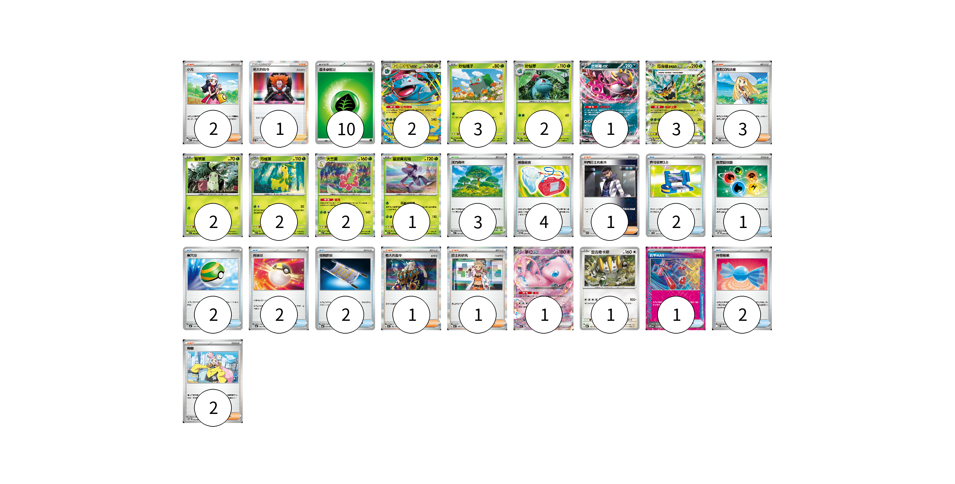 牌組構築方案 以此牌組為基礎新構築牌組 顯示卡面 顯示列表 寶可夢卡(20) 2 3 2 1 3 2 2 2 1 1 1 物品卡(16) 4 2 1 2 2 2 1 2 支援者卡(11) 2 1 3 1 1 1 2 競技場卡(3) 3 能量卡(10) 10 寶可夢卡(20) 卡牌名稱 張數 卡牌名稱 張數 超級妙蛙花ex M1L 003/063 02 妙蛙種子 M1L 001/063 03 妙蛙草 M1L 002/063 02 吉雉雞ex SV6a 038/064 01 厄鬼椪 碧草面具ex SV6 016/101 03 菊草葉 M1S 003/063 02 月桂葉 M1S 004/063 02 大竺葵 M1S 005/063 02 蓋諾賽克特 M2 008/080 01 夢幻ex SV4a 076/190 01 雷吉奇卡斯 SV8a 132/187 01 物品卡(16) 卡牌名稱 張數 卡牌名稱 張數 捕蟲組合 SV6 094/101 04 寶可裝置3.0 SVD 121/139 02 能量回收器 SVOD 009/020 01 巢穴球 SV4a 159/190 02 高級球 SV4a 161/190 02 夜間擔架 SV6a 056/064 02 釣竿MAX SV8a 142/187 01 神奇糖果 MBG 013/022 02 支援者卡(11) 卡牌名稱 張數 卡牌名稱 張數 小光 M2 077/080 02 老大的指令(弗拉達利) S8b 158/184 01 莉莉艾的決意 M1L 062/063 03 弗圖博士的劇本 SVHM 021/022 01 老大的指令 SV4a 181/190 01 博士的研究 SV4a 176/190 01 奇樹 SVOD 016/020 02 競技場卡(3) 卡牌名稱 張數 卡牌名稱 張數 活力森林 M1S 061/063 03 能量卡(10) 卡牌名稱 張數 卡牌名稱 張數 基本【草】能量 M-P GRA 10 以此牌組為基礎新構築牌組 牌組編碼 DVpLlz-ALheHJ-KCulUc copy 列印牌組單 牌組編碼已複製 分享至SNS