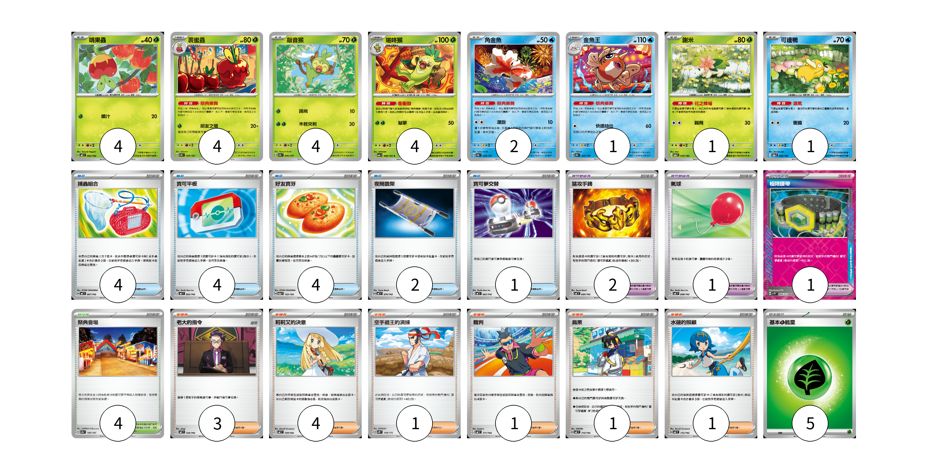 牌組構築方案 以此牌組為基礎新構築牌組 顯示卡面 顯示列表 寶可夢卡(21) 4 4 4 4 2 1 1 1 寶可夢道具(4) 2 1 1 物品卡(15) 4 4 4 2 1 支援者卡(11) 3 4 1 1 1 1 競技場卡(4) 4 能量卡(5) 5 寶可夢卡(21) 卡牌名稱 張數 卡牌名稱 張數 啃果蟲 MC 062/742 04 裹蜜蟲 SV8a 009/187 04 敲音猴 SV8a 006/187 04 啪咚猴 SV6 009/101 04 角金魚 SV8a 028/187 02 金魚王 SV8a 029/187 01 謝米 M2a 012/193 01 可達鴨 M2a 032/193 01 寶可夢道具(4) 卡牌名稱 張數 卡牌名稱 張數 猛攻手鐲 MC 689/742 02 氣球 MC 688/742 01 極限腰帶 SV5K 066/071 01 物品卡(15) 卡牌名稱 張數 卡牌名稱 張數 捕蟲組合 MC 667/742 04 寶可平板 MC 662/742 04 好友寶芬 M2a 153/193 04 夜間擔架 MC 670/742 02 寶可夢交替 MC 663/742 01 支援者卡(11) 卡牌名稱 張數 卡牌名稱 張數 老大的指令 MC 724/742 03 莉莉艾的決意 MC 729/742 04 空手道王的演練 SVM 148/175 01 裁判 MC 711/742 01 烏栗 MC 713/742 01 水蓮的照顧 MC 712/742 01 競技場卡(4) 卡牌名稱 張數 卡牌名稱 張數 祭典會場 SV8a 180/187 04 能量卡(5) 卡牌名稱 張數 卡牌名稱 張數 基本【草】能量 MC GRA 05 以此牌組為基礎新構築牌組 牌組編碼 DXhSNz-LEjlQF-cEyFTJ copy 列印牌組單 牌組編碼已複製 分享至SNS