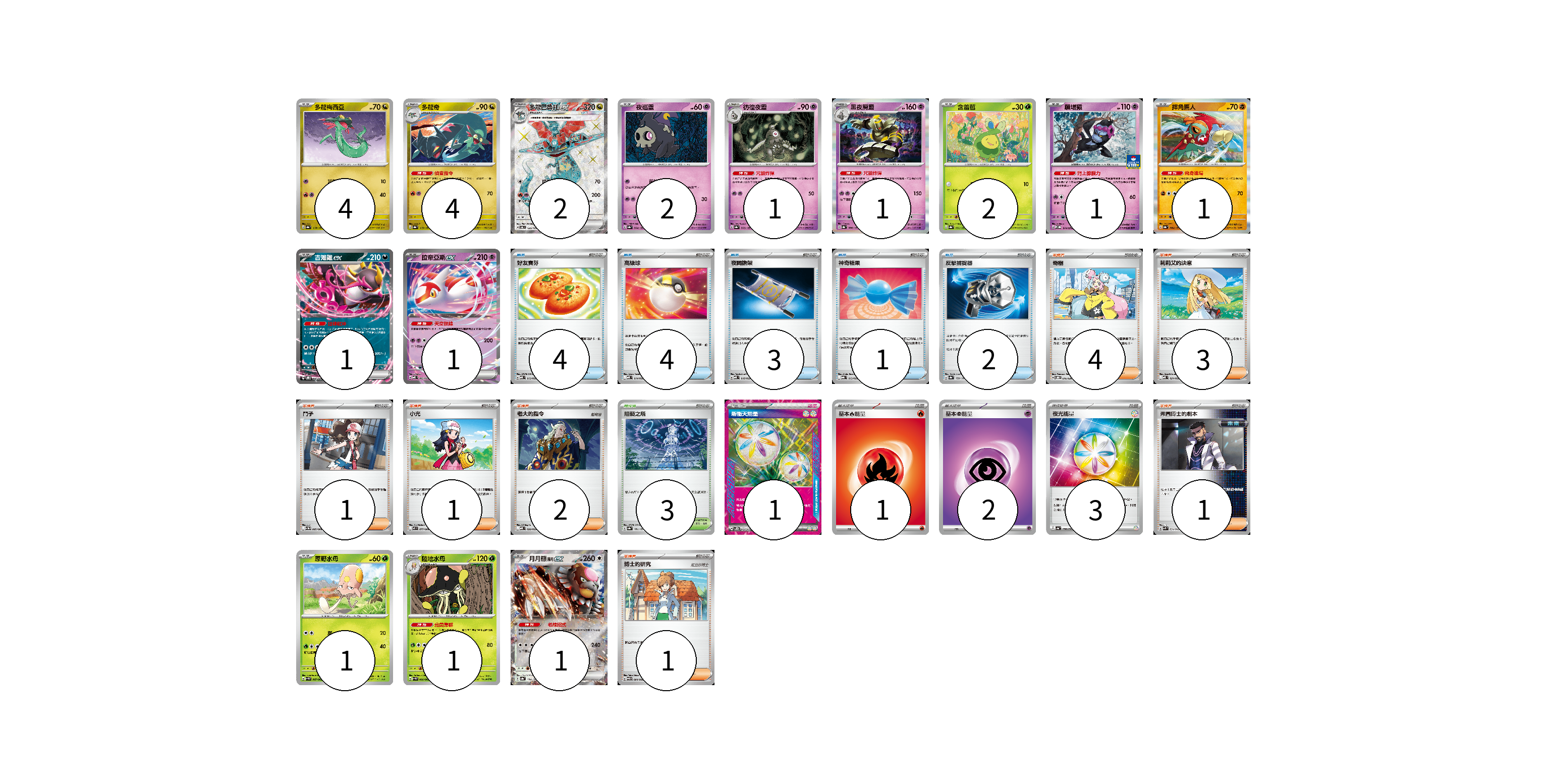 牌組構築方案 以此牌組為基礎新構築牌組 顯示卡面 顯示列表 寶可夢卡(23) 4 4 2 2 1 1 2 1 1 1 1 1 1 1 物品卡(14) 4 4 3 1 2 支援者卡(13) 4 3 1 1 2 1 1 競技場卡(3) 3 能量卡(7) 1 1 2 3 寶可夢卡(23) 卡牌名稱 張數 卡牌名稱 張數 多龍梅西亞 SV8a 118/187 04 多龍奇 SV8a 119/187 04 多龍巴魯托ex SV6 120/101 02 夜巡靈 SV8a 064/187 02 彷徨夜靈 SV8a 065/187 01 黑夜魔靈 SV8a 066/187 01 含羞苞 SV8a 001/187 02 願增猿 M-P 014/M-P 01 摔角鷹人 SV8a 084/187 01 吉雉雞ex SVOD 004/020 01 拉帝亞斯ex MBD 003/022 01 原野水母 SV4M 007/066 01 陸地水母 SV4M 008/066 01 月月熊 赫月ex SV8a 134/187 01 物品卡(14) 卡牌名稱 張數 卡牌名稱 張數 好友寶芬 MBD 013/022 04 高級球 MBD 014/022 04 夜間擔架 MBD 016/022 03 神奇糖果 MBG 013/022 01 反擊捕捉器 SV8a 139/187 02 支援者卡(13) 卡牌名稱 張數 卡牌名稱 張數 奇樹 SVOD 016/020 04 莉莉艾的決意 MBD 021/022 03 鬥子 SV11W 085/086 01 小光 M2 077/080 01 老大的指令 MBD 020/022 02 弗圖博士的劇本 SVK 034/042 01 博士的研究 SV11B 084/086 01 競技場卡(3) 卡牌名稱 張數 卡牌名稱 張數 阻礙之塔 SV8a 181/187 03 能量卡(7) 卡牌名稱 張數 卡牌名稱 張數 新衝天能量 SV5K 071/071 01 基本火能量 sv-p FIR 01 基本超能量 sv-p PSY 02 夜光能量 SV4a 190/190 03 以此牌組為基礎新構築牌組 牌組編碼 DXwOfZ-BsycIp-baBEmc copy 列印牌組單 牌組編碼已複製 分享至SNS