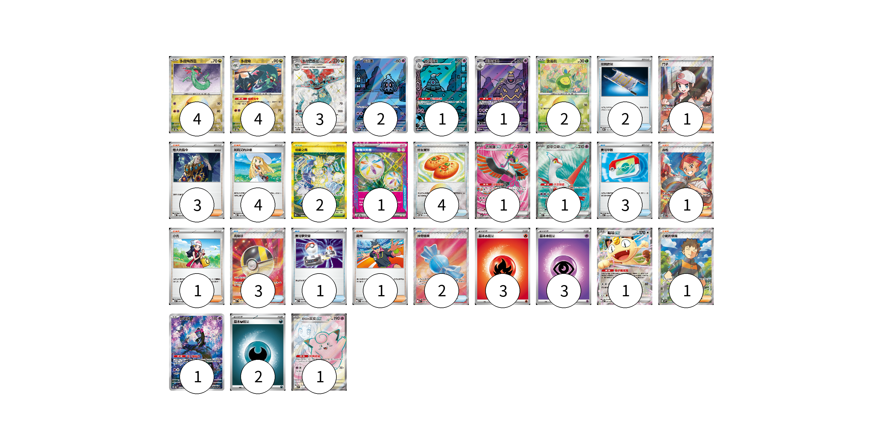 牌組構築方案 以此牌組為基礎新構築牌組 顯示卡面 顯示列表 寶可夢卡(22) 4 4 3 2 1 1 2 1 1 1 1 1 物品卡(15) 2 4 3 3 1 2 支援者卡(12) 1 3 4 1 1 1 1 競技場卡(2) 2 能量卡(9) 1 3 3 2 寶可夢卡(22) 卡牌名稱 張數 卡牌名稱 張數 多龍梅西亞 SV8a 118/187 04 多龍奇 SV8a 119/187 04 多龍巴魯托ex SV6 120/101 03 夜巡靈 SV6a 068/064 02 彷徨夜靈 SV6a 069/064 01 黑夜魔靈 SV6a 070/064 01 含羞苞 SV8a 001/187 02 吉雉雞ex SV6a 081/064 01 拉帝亞斯ex SV7a 078/064 01 喵喵ex M3 061/080 01 願增猿 SV6 107/101 01 莉莉艾的皮皮ex SV9 115/100 01 物品卡(15) 卡牌名稱 張數 卡牌名稱 張數 夜間擔架 SV8a 151/187 02 好友寶芬 SV8a 147/187 04 寶可平板 MC 662/742 03 高級球 M2a 216/193 03 寶可夢交替 MC 663/742 01 神奇糖果 M1S 082/063 02 支援者卡(12) 卡牌名稱 張數 卡牌名稱 張數 鬥子 SV11W 166/086 01 老大的指令 MBD 020/022 03 莉莉艾的決意 MBD 021/022 04 赤松 SV7 123/102 01 小光 M2 077/080 01 裁判 MC 711/742 01 小剛的發掘 SV9 123/100 01 競技場卡(2) 卡牌名稱 張數 卡牌名稱 張數 阻礙之塔 SV10 132/098 02 能量卡(9) 卡牌名稱 張數 卡牌名稱 張數 新衝天能量 SV5K 071/071 01 基本【火】能量 MC FIR 03 基本【超】能量 MC PSY 03 基本【惡】能量 MC DAR 02 以此牌組為基礎新構築牌組 牌組編碼 DZBcGZ-bLITfV-YRNbeM copy 列印牌組單 牌組編碼已複製 分享至SNS