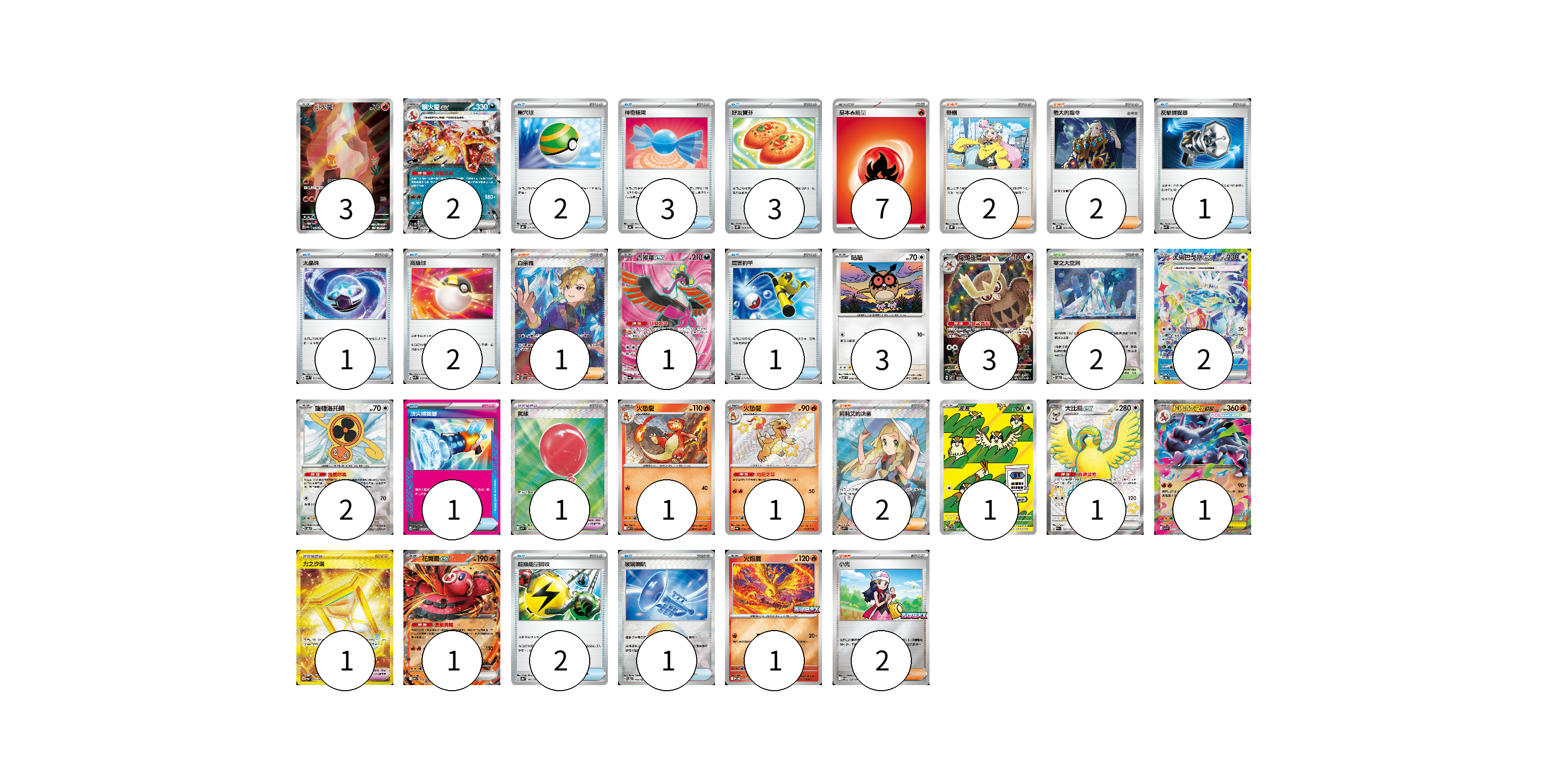 牌組構築方案 以此牌組為基礎新構築牌組 顯示卡面 顯示列表 寶可夢卡(23) 3 2 1 3 3 2 2 1 1 1 1 1 1 1 寶可夢道具(2) 1 1 物品卡(17) 2 3 3 1 1 2 1 1 2 1 支援者卡(9) 2 2 1 2 2 競技場卡(2) 2 能量卡(7) 7 寶可夢卡(23) 卡牌名稱 張數 卡牌名稱 張數 小火龍 SV2a 168/165 03 噴火龍ex SV4a 115/190 02 吉雉雞ex SV6a 081/064 01 咕咕 SV7 076/102 03 貓頭夜鷹 SV7 114/102 03 太樂巴戈斯ex SV8a 226/187 02 旋轉洛托姆 SV8a 131/187 02 火恐龍 M2 012/080 01 火恐龍 SV4a 211/190 01 波波 SV3 118/108 01 大比鳥ex SV4a 335/190 01 超級噴火龍Xex M2 013/080 01 花舞鳥ex M2 018/080 01 火焰鳥 M-P 022/M-P 01 寶可夢道具(2) 卡牌名稱 張數 卡牌名稱 張數 氣球 M1L 084/063 01 力之沙漏 SV6a 094/064 01 物品卡(17) 卡牌名稱 張數 卡牌名稱 張數 巢穴球 SVHK 012/022 02 神奇糖果 SV4a 163/190 03 好友寶芬 SV5K 063/071 03 反擊捕捉器 SVK 009/042 01 太晶珠 SVK 013/042 01 高級球 SVK 018/042 02 厲害釣竿 SVK 011/042 01 頂尖捕捉器 MBG 014/022 01 超級能量回收 SV8a 141/187 02 玻璃喇叭 SV8a 140/187 01 支援者卡(9) 卡牌名稱 張數 卡牌名稱 張數 奇樹 SVHK 019/022 02 老大的指令 SVHK 022/022 02 白蕾雅 SV7 126/102 01 莉莉艾的決意 M1L 086/063 02 小光 M-P 028/M-P 02 競技場卡(2) 卡牌名稱 張數 卡牌名稱 張數 零之大空洞 SV8a 182/187 02 能量卡(7) 卡牌名稱 張數 卡牌名稱 張數 基本火能量 sv-p FIR 07 以此牌組為基礎新構築牌組 牌組編碼 DZUXuD-aDitLo-dbkHKK copy 列印牌組單 牌組編碼已複製 分享至SNS