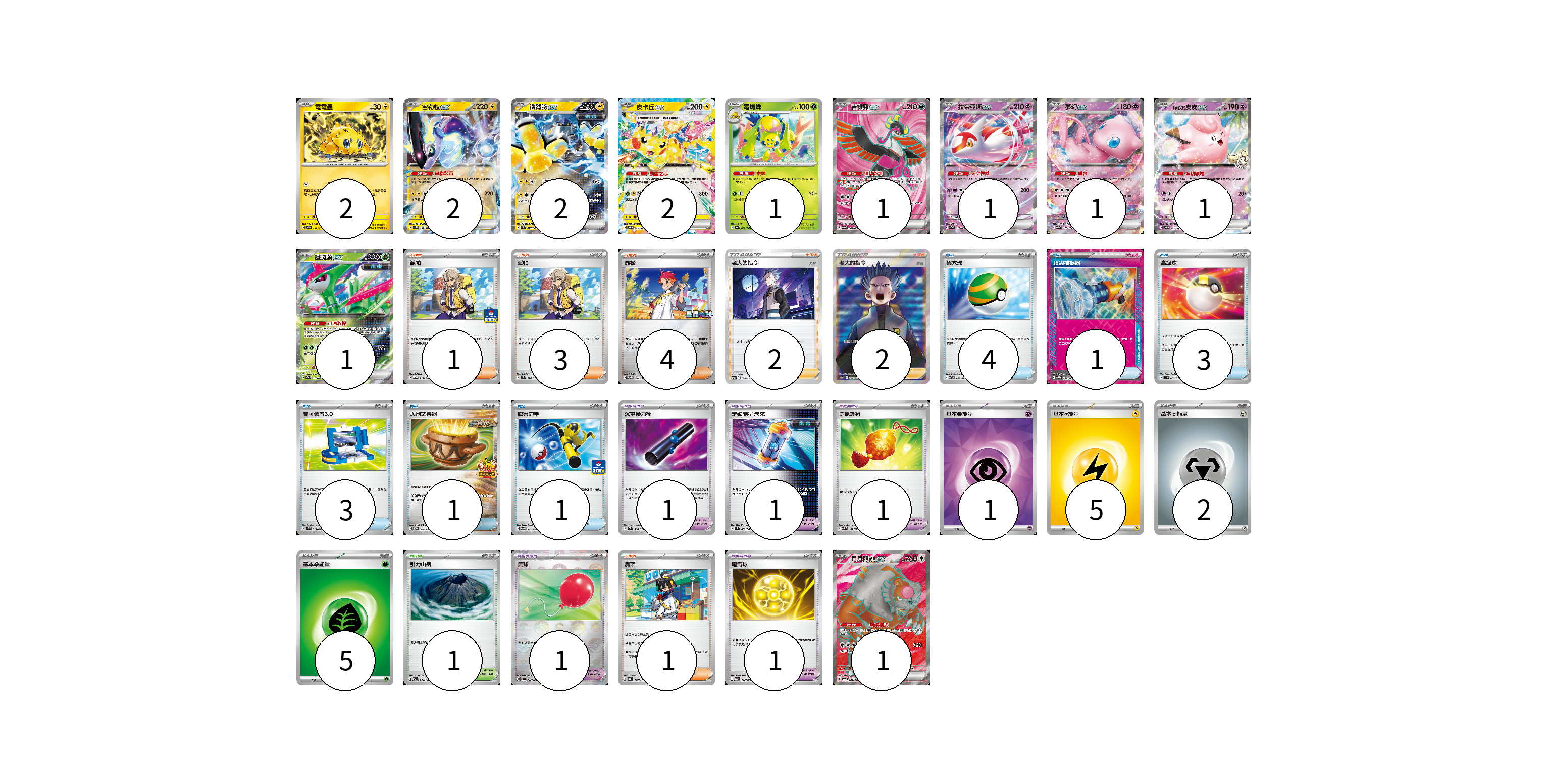 牌組構築方案 以此牌組為基礎新構築牌組 顯示卡面 顯示列表 寶可夢卡(15) 2 2 2 2 1 1 1 1 1 1 1 寶可夢道具(5) 1 1 1 1 1 物品卡(13) 4 1 3 3 1 1 支援者卡(13) 1 3 4 2 2 1 競技場卡(1) 1 能量卡(13) 1 5 2 5 寶可夢卡(15) 卡牌名稱 張數 卡牌名稱 張數 電電蟲 SV7 032/102 02 密勒頓ex SV1V 037/078 02 鐵臂膀ex SV4M 027/066 02 皮卡丘ex SV8 033/106 02 電蜘蛛 SV6a 002/064 01 吉雉雞ex SV6a 081/064 01 拉帝亞斯ex SV7a 019/064 01 夢幻ex SV4a 076/190 01 莉莉艾的皮皮ex SV9 033/100 01 鐵斑葉ex SV5M 016/071 01 月月熊 赫月 ex SV5a 084/066 01 寶可夢道具(5) 卡牌名稱 張數 卡牌名稱 張數 沉重接力棒 SV5M 066/071 01 驅勁能量 未來 SV4M 062/066 01 勇氣護符 SVM 142/175 01 氣球 SV11B 082/086 01 電氣球 M2a 163/193 01 物品卡(13) 卡牌名稱 張數 卡牌名稱 張數 巢穴球 SVTR 013/021 04 頂尖捕捉器 SV5M 062/071 01 高級球 SVB 002/028 03 寶可裝置3.0 SVK 021/042 03 大地之容器 SV-P 084/SV-P 01 厲害釣竿 SV-P 112/SV-P 01 支援者卡(13) 卡牌名稱 張數 卡牌名稱 張數 派帕 SV-P 213/SV-P 01 派帕 SV1V 076/078 03 赤松 SV-P 150/SV-P 04 老大的指令(赤日) SVB 024/028 02 老大的指令(赤日) S12a 250/172 02 烏栗 SV8a 169/187 01 競技場卡(1) 卡牌名稱 張數 卡牌名稱 張數 引力山岳 M2a 183/193 01 能量卡(13) 卡牌名稱 張數 卡牌名稱 張數 基本【超】能量 SVOD PSY 01 基本【雷】能量 SVHM LIG 05 基本【鋼】能量 SVF MET 02 基本【草】能量 SVF GRA 05 以此牌組為基礎新構築牌組 牌組編碼 DZiusq-TjPuuv-iYxBsp copy 列印牌組單 牌組編碼已複製 分享至SNS
