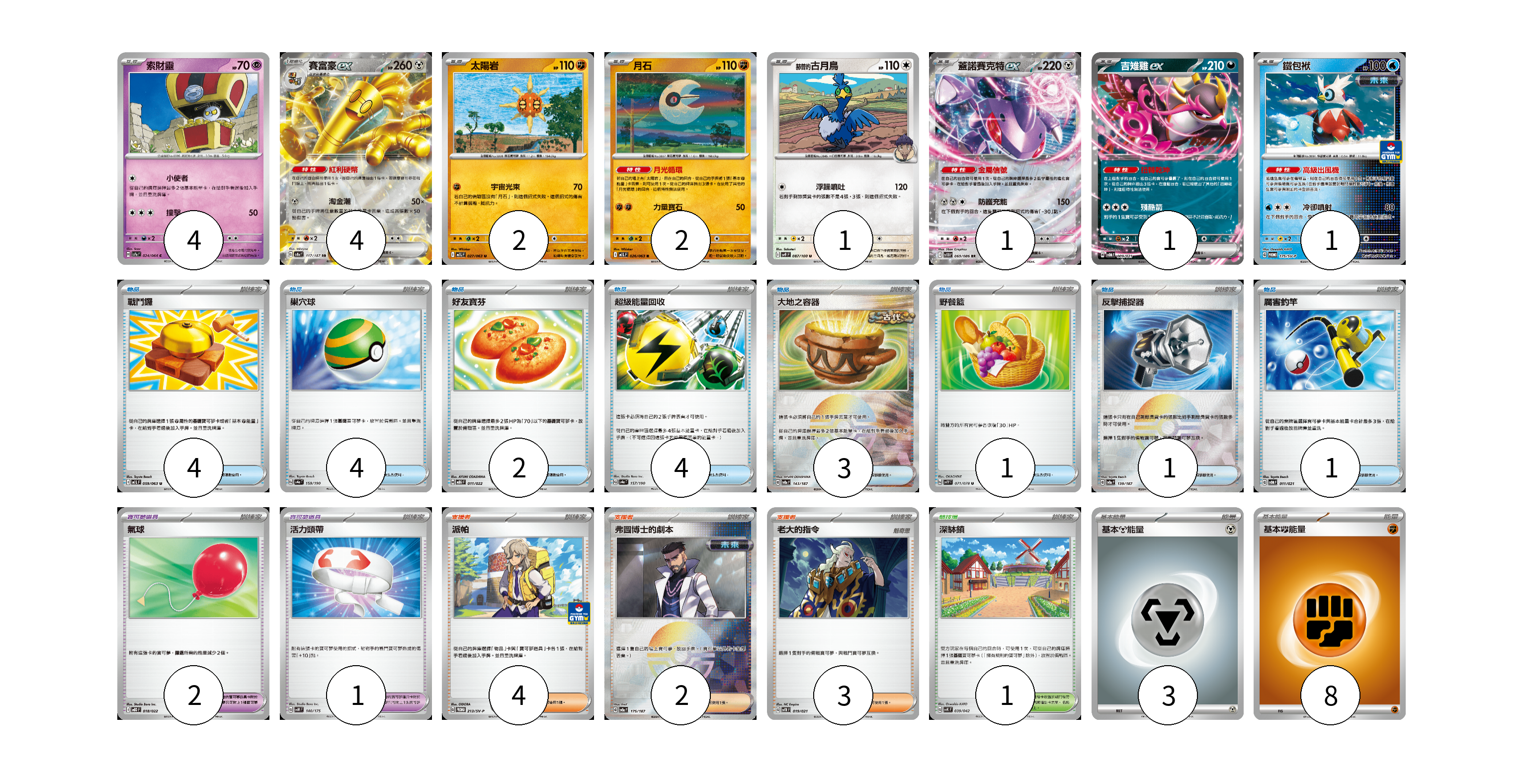 牌組構築方案 以此牌組為基礎新構築牌組 顯示卡面 顯示列表 寶可夢卡(16) 4 4 2 2 1 1 1 1 寶可夢道具(3) 2 1 物品卡(20) 4 4 2 4 3 1 1 1 支援者卡(9) 4 2 3 競技場卡(1) 1 能量卡(11) 3 8 寶可夢卡(16) 卡牌名稱 張數 卡牌名稱 張數 索財靈 SV7a 024/064 04 賽富豪ex SV8a 117/187 04 太陽岩 M1L 027/063 02 月石 M1L 026/063 02 赫普的古月鳥 SV9 087/100 01 蓋諾賽克特ex SV11B 069/086 01 吉雉雞ex SVOM 009/021 01 鐵包袱 SV-P 175/SV-P 01 寶可夢道具(3) 卡牌名稱 張數 卡牌名稱 張數 氣球 MBD 018/022 02 活力頭帶 SVM 140/175 01 物品卡(20) 卡牌名稱 張數 卡牌名稱 張數 戰鬥鑼 M1L 059/063 04 巢穴球 SV4a 159/190 04 好友寶芬 MBG 011/022 02 超級能量回收 SV4a 157/190 04 大地之容器 SV8a 143/187 03 野餐籃 SV1V 071/078 01 反擊捕捉器 SV8a 139/187 01 厲害釣竿 SVOM 011/021 01 支援者卡(9) 卡牌名稱 張數 卡牌名稱 張數 派帕 SV-P 213/SV-P 04 弗圖博士的劇本 SV8a 175/187 02 老大的指令 SVTR 019/021 03 競技場卡(1) 卡牌名稱 張數 卡牌名稱 張數 深缽鎮 SVK 039/042 01 能量卡(11) 卡牌名稱 張數 卡牌名稱 張數 基本鋼能量 sv-p MET 03 基本【鬥】能量 SVAM FIG 08 以此牌組為基礎新構築牌組 牌組編碼 DZzJDL-VCofHi-Yibmsa copy 列印牌組單 牌組編碼已複製 分享至SNS