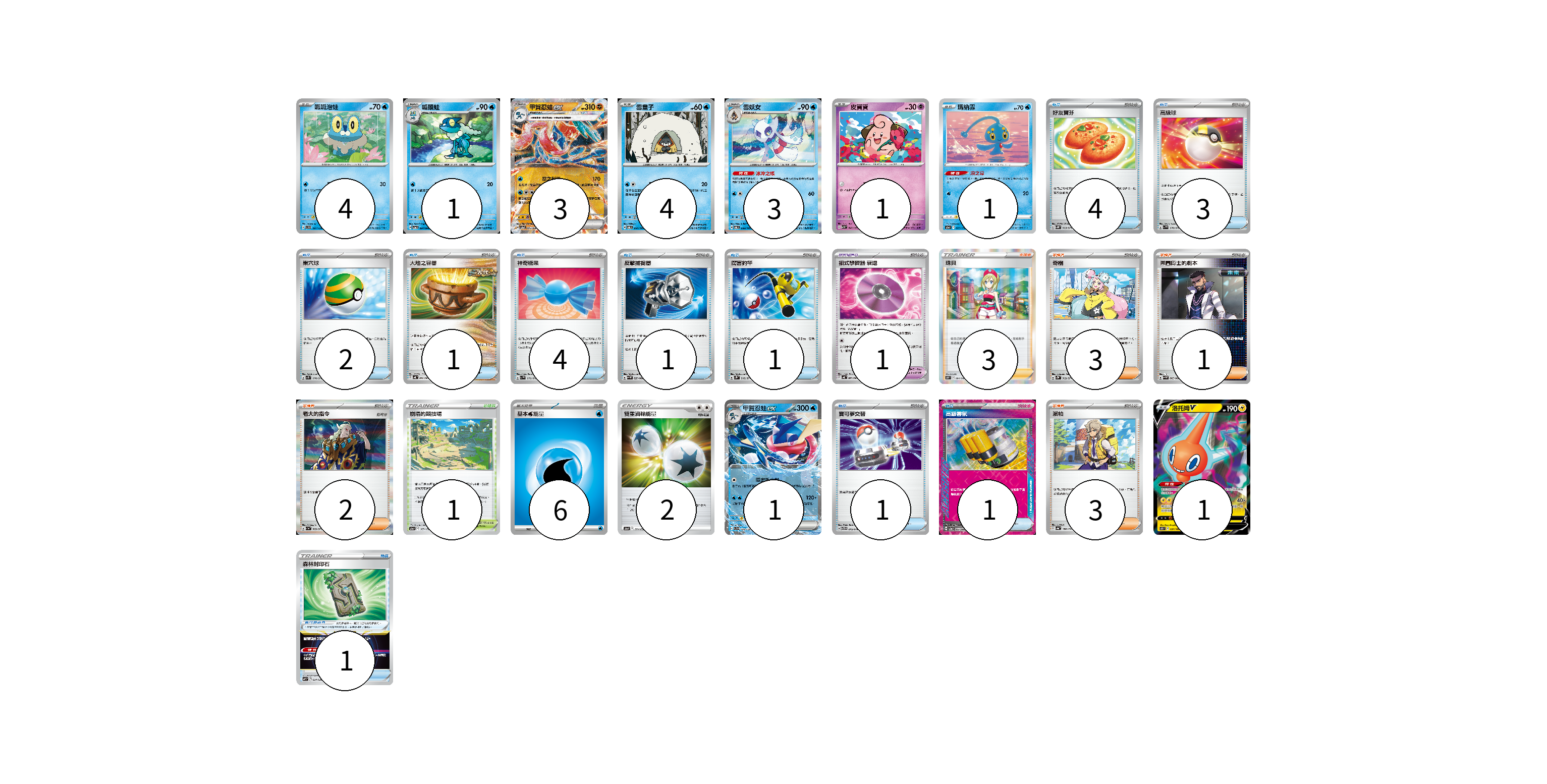 牌組構築方案 以此牌組為基礎新構築牌組 顯示卡面 顯示列表 寶可夢卡(19) 4 1 3 4 3 1 1 1 1 寶可夢道具(1) 1 物品卡(19) 4 3 2 1 4 1 1 1 1 1 支援者卡(12) 3 3 1 2 3 競技場卡(1) 1 能量卡(8) 6 2 寶可夢卡(19) 卡牌名稱 張數 卡牌名稱 張數 呱呱泡蛙 SVD 027/139 04 呱頭蛙 SV5a 024/066 01 甲賀忍蛙ex SV5a 045/066 03 雪童子 SV6 031/101 04 雪妖女 SV6 033/101 03 皮寶寶 SV3 042/108 01 瑪納霏 S12a 029/172 01 甲賀忍蛙ex SVD 029/139 01 洛托姆V S11 037/100 01 寶可夢道具(1) 卡牌名稱 張數 卡牌名稱 張數 招式學習器 衰退 SV4K 063/066 01 物品卡(19) 卡牌名稱 張數 卡牌名稱 張數 好友寶芬 SV5K 063/071 04 高級球 SV1V 070/078 03 巢穴球 SV1S 070/078 02 大地之容器 SV4K 060/066 01 神奇糖果 SV1V 072/078 04 反擊捕捉器 SV4M 059/066 01 厲害釣竿 SV2P 066/071 01 寶可夢交替 SVTG 015/019 01 高級香氛 SV5a 055/066 01 森林封印石 SVF 024/038 01 支援者卡(12) 卡牌名稱 張數 卡牌名稱 張數 珠貝 S10P 064/067 03 奇樹 SV2D 069/071 03 弗圖博士的劇本 SV4M 065/066 01 老大的指令 SV1a 069/073 02 派帕 SV4a 180/190 03 競技場卡(1) 卡牌名稱 張數 卡牌名稱 張數 崩塌的競技場 S12a 167/172 01 能量卡(8) 卡牌名稱 張數 卡牌名稱 張數 基本水能量 sv-p WAT 06 雙重渦輪能量 S12a 171/172 02 以此牌組為基礎新構築牌組 牌組編碼 DcTsjU-muuCpU-CnveAs copy 列印牌組單 牌組編碼已複製 分享至SNS