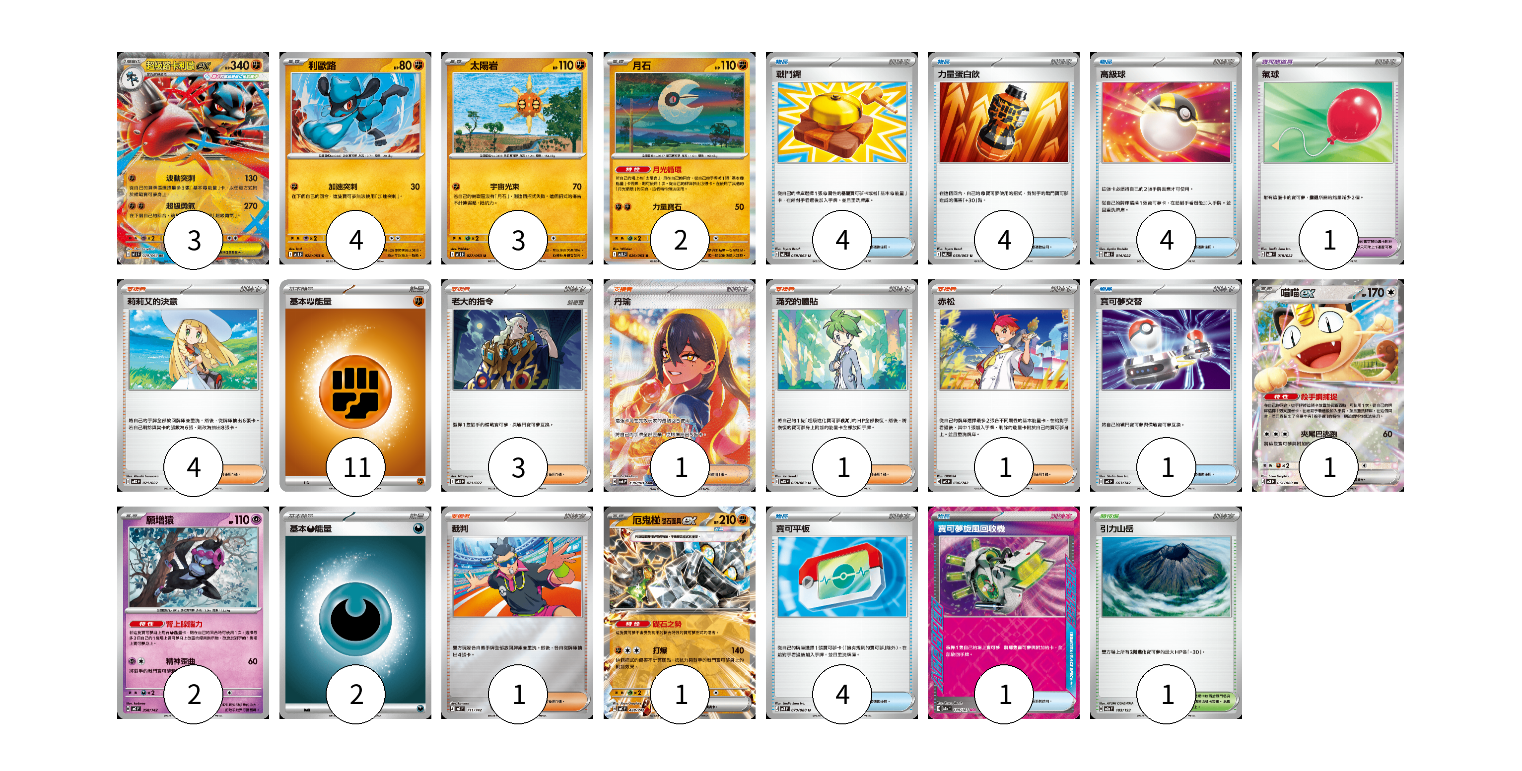 牌組構築方案 以此牌組為基礎新構築牌組 顯示卡面 顯示列表 寶可夢卡(16) 3 4 3 2 1 2 1 寶可夢道具(1) 1 物品卡(18) 4 4 4 1 4 1 支援者卡(11) 4 3 1 1 1 1 競技場卡(1) 1 能量卡(13) 11 2 寶可夢卡(16) 卡牌名稱 張數 卡牌名稱 張數 超級路卡利歐ex M1L 029/063 03 利歐路 M1L 028/063 04 太陽岩 M1L 027/063 03 月石 M1L 026/063 02 喵喵ex M3 061/080 01 願增猿 MC 358/742 02 厄鬼椪 礎石面具ex MC 428/742 01 寶可夢道具(1) 卡牌名稱 張數 卡牌名稱 張數 氣球 MBD 018/022 01 物品卡(18) 卡牌名稱 張數 卡牌名稱 張數 戰鬥鑼 M1L 059/063 04 力量蛋白飲 M1L 058/063 04 高級球 MBD 014/022 04 寶可夢交替 MC 663/742 01 寶可平板 M3 070/080 04 寶可夢旋風回收機 SV8a 149/187 01 支援者卡(11) 卡牌名稱 張數 卡牌名稱 張數 莉莉艾的決意 MBD 021/022 04 老大的指令 MBG 021/022 03 丹瑜 SV6 130/101 01 滿充的體貼 M1S 060/063 01 赤松 MC 696/742 01 裁判 MC 711/742 01 競技場卡(1) 卡牌名稱 張數 卡牌名稱 張數 引力山岳 M2a 183/193 01 能量卡(13) 卡牌名稱 張數 卡牌名稱 張數 基本【鬥】能量 M-P FIG 11 基本【惡】能量 MC DAR 02 以此牌組為基礎新構築牌組 牌組編碼 Dccbpj-HTjRUq-CsmZaw copy 列印牌組單 牌組編碼已複製 分享至SNS