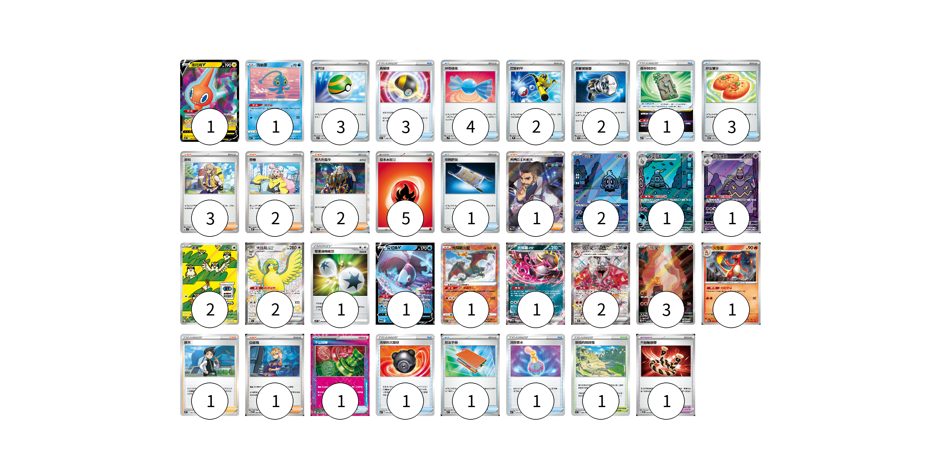 牌組構築方案 以此牌組為基礎新構築牌組 顯示卡面 顯示列表 寶可夢卡(19) 1 1 2 1 1 2 2 1 1 1 2 3 1 寶可夢道具(1) 1 物品卡(23) 3 3 4 2 2 1 3 1 1 1 1 1 支援者卡(10) 3 2 2 1 1 1 競技場卡(1) 1 能量卡(6) 5 1 寶可夢卡(19) 卡牌名稱 張數 卡牌名稱 張數 洛托姆V S11 037/100 01 瑪納霏 SVF 003/038 01 夜巡靈 SV6a 068/064 02 彷徨夜靈 SV6a 069/064 01 黑夜魔靈 SV6a 070/064 01 波波 SV3 118/108 02 大比鳥ex SV4a 335/190 02 霓虹魚V SVHK 004/022 01 光輝噴火龍 SVF 001/038 01 吉雉雞ex SV6a 038/064 01 噴火龍ex SV4a 331/190 02 小火龍 SV2a 168/165 03 火恐龍 SV4a 026/190 01 寶可夢道具(1) 卡牌名稱 張數 卡牌名稱 張數 不服輸頭帶 SVTL 016/021 01 物品卡(23) 卡牌名稱 張數 卡牌名稱 張數 巢穴球 SV1S 070/078 03 高級球 S9 089/100 03 神奇糖果 SV1V 072/078 04 厲害釣竿 SV2P 066/071 02 反擊捕捉器 SV4M 059/066 02 森林封印石 SVF 024/038 01 好友寶芬 SV5K 063/071 03 夜間擔架 SV6a 056/064 01 不公印章 SV5a 053/066 01 洗翠的沉重球 SVF 019/038 01 朋友手冊 SVK 014/042 01 消除香水 SVF 011/038 01 支援者卡(10) 卡牌名稱 張數 卡牌名稱 張數 派帕 SV1V 076/078 03 奇樹 SV2D 069/071 02 老大的指令 SV1a 069/073 02 弗圖博士的劇本 SV4M 086/066 01 捩木 S11 097/100 01 白蕾雅 SV7 100/102 01 競技場卡(1) 卡牌名稱 張數 卡牌名稱 張數 崩塌的競技場 S9 098/100 01 能量卡(6) 卡牌名稱 張數 卡牌名稱 張數 基本火能量 sv-p FIR 05 雙重渦輪能量 SVTM 022/022 01 以此牌組為基礎新構築牌組 牌組編碼 DczLMW-aZIrFW-njAWuJ copy 列印牌組單 牌組編碼已複製 分享至SNS