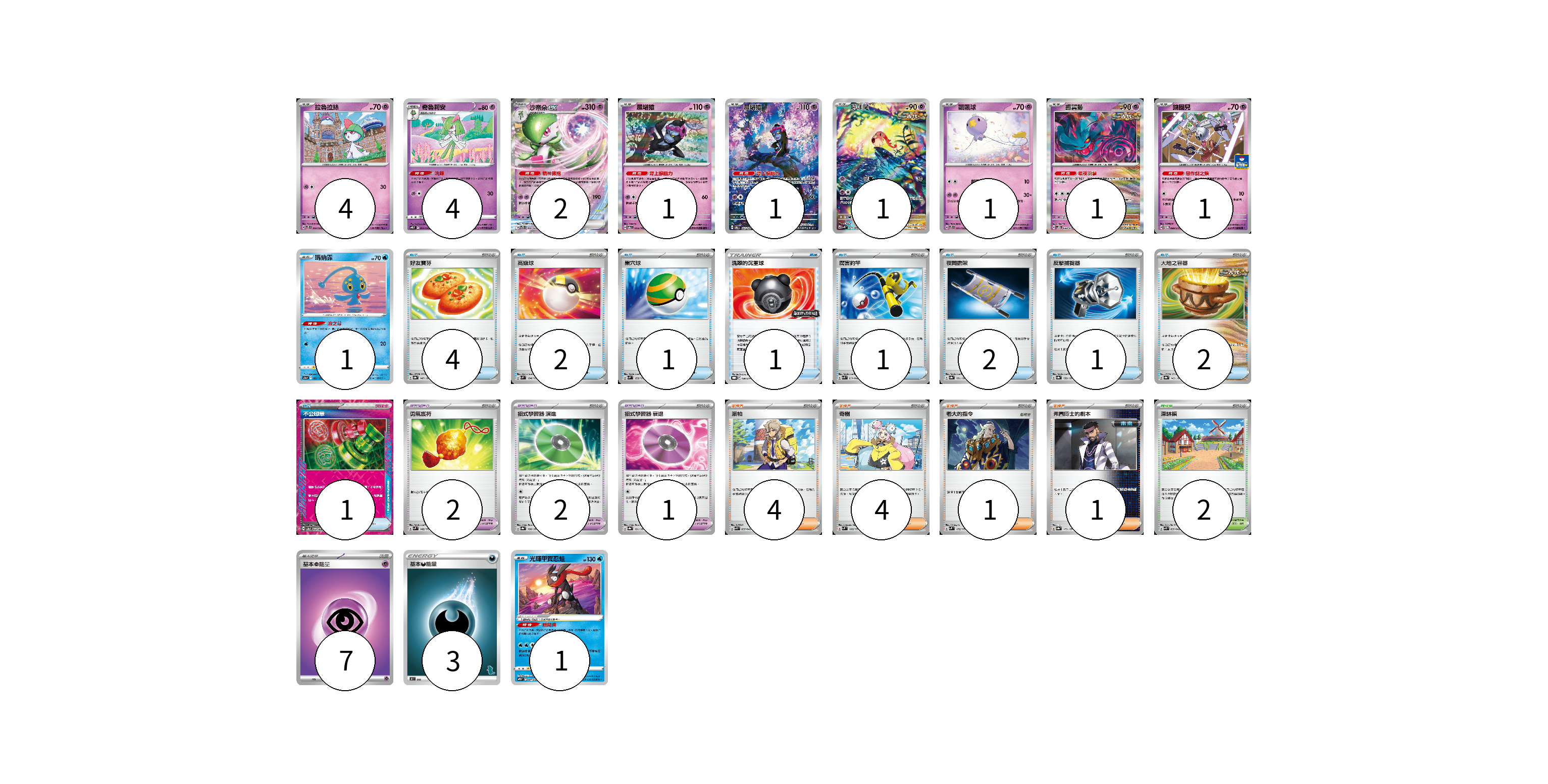 牌組構築方案 以此牌組為基礎新構築牌組 顯示卡面 顯示列表 寶可夢卡(18) 4 4 2 1 1 1 1 1 1 1 1 寶可夢道具(5) 2 2 1 物品卡(15) 4 2 1 1 1 2 1 2 1 支援者卡(10) 4 4 1 1 競技場卡(2) 2 能量卡(10) 7 3 寶可夢卡(18) 卡牌名稱 張數 卡牌名稱 張數 拉魯拉絲 SVTS 002/022 04 奇魯莉安 SVTS 003/022 04 沙奈朵ex SVTS 004/022 02 願增猿 SV6 055/101 01 願增猿 SV6 107/101 01 吼叫尾 SV4K 071/066 01 飄飄球 SVTS 005/022 01 振翼髮 SV5K 033/071 01 鑰圈兒 SV-P 089/SV-P 01 瑪納霏 S12a 029/172 01 光輝甲賀忍蛙 SVTS 001/022 01 寶可夢道具(5) 卡牌名稱 張數 卡牌名稱 張數 勇氣護符 SVM 142/175 02 招式學習器 演進 SV8a 160/187 02 招式學習器 衰退 SV8a 161/187 01 物品卡(15) 卡牌名稱 張數 卡牌名稱 張數 好友寶芬 SV8a 147/187 04 高級球 SVM 134/175 02 巢穴球 SVM 133/175 01 洗翠的沉重球 SV-P 138/SV-P 01 厲害釣竿 SVK 011/042 01 夜間擔架 SV8a 151/187 02 反擊捕捉器 SV8a 139/187 01 大地之容器 SV8a 143/187 02 不公印章 SV5a 053/066 01 支援者卡(10) 卡牌名稱 張數 卡牌名稱 張數 派帕 SVK 035/042 04 奇樹 SVM 160/175 04 老大的指令 SVM 172/175 01 弗圖博士的劇本 SV8a 175/187 01 競技場卡(2) 卡牌名稱 張數 卡牌名稱 張數 深缽鎮 SVK 039/042 02 能量卡(10) 卡牌名稱 張數 卡牌名稱 張數 基本超能量 sv-p PSY 07 基本惡能量 SH DAR 03 以此牌組為基礎新構築牌組 牌組編碼 DeqYhK-XnzFMn-CznlBU copy 列印牌組單 牌組編碼已複製 分享至SNS