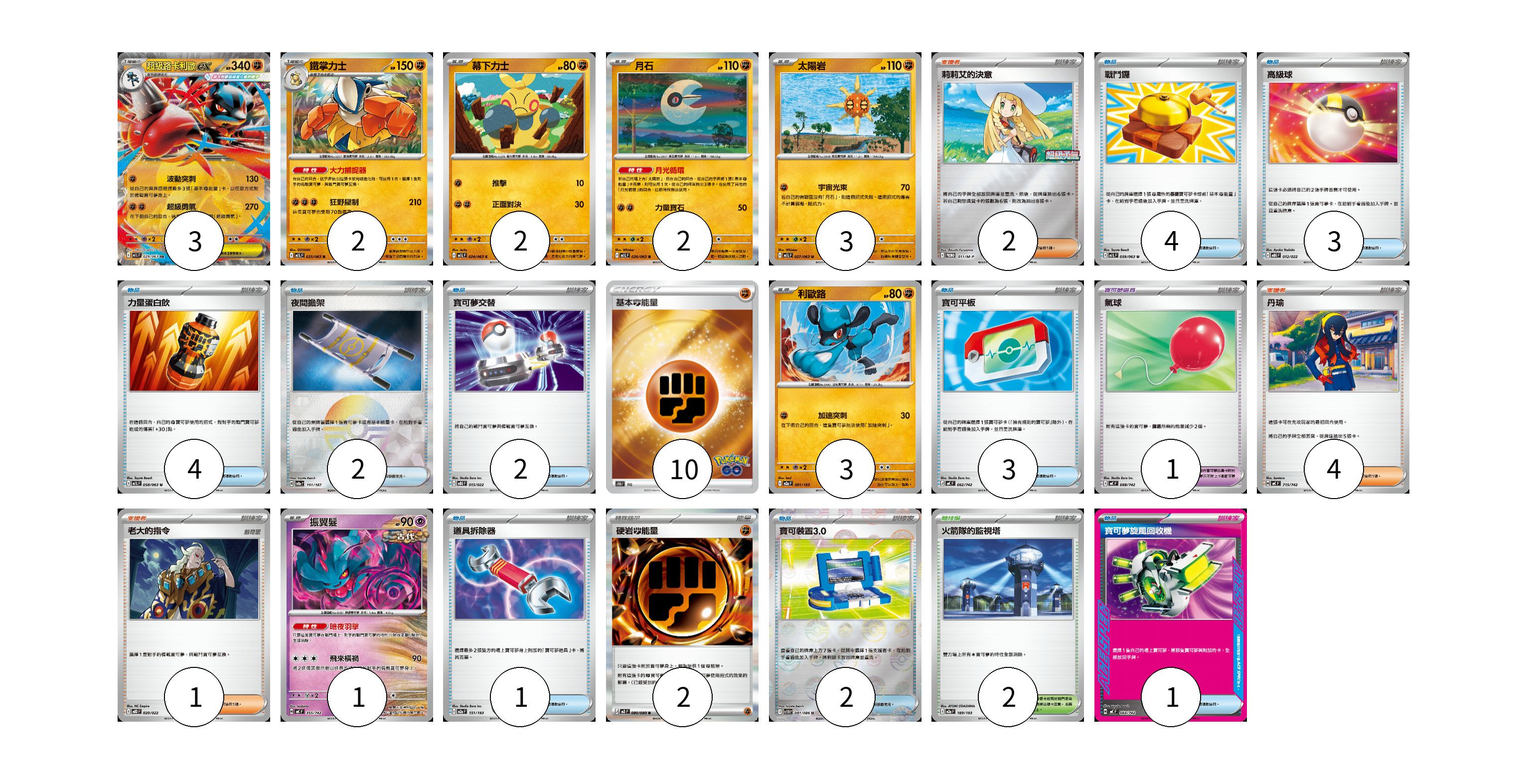 牌組構築方案 以此牌組為基礎新構築牌組 顯示卡面 顯示列表 寶可夢卡(16) 3 2 2 2 3 3 1 寶可夢道具(1) 1 物品卡(22) 4 3 4 2 2 3 1 2 1 支援者卡(7) 2 4 1 競技場卡(2) 2 能量卡(12) 10 2 寶可夢卡(16) 卡牌名稱 張數 卡牌名稱 張數 超級路卡利歐ex M1L 029/063 03 鐵掌力士 M1L 025/063 02 幕下力士 M1L 024/063 02 月石 M1L 026/063 02 太陽岩 M1L 027/063 03 利歐路 M2a 091/193 03 振翼髮 MC 355/742 01 寶可夢道具(1) 卡牌名稱 張數 卡牌名稱 張數 氣球 MC 688/742 01 物品卡(22) 卡牌名稱 張數 卡牌名稱 張數 戰鬥鑼 M1L 059/063 04 高級球 MBG 012/022 03 力量蛋白飲 M1L 058/063 04 夜間擔架 SV8a 151/187 02 寶可夢交替 MBG 015/022 02 寶可平板 MC 662/742 03 道具拆除器 M2a 151/193 01 寶可裝置3.0 SV11B 081/086 02 寶可夢旋風回收機 MC 664/742 01 支援者卡(7) 卡牌名稱 張數 卡牌名稱 張數 莉莉艾的決意 M-P 011/M-P 02 丹瑜 MC 715/742 04 老大的指令 MBD 020/022 01 競技場卡(2) 卡牌名稱 張數 卡牌名稱 張數 火箭隊的監視塔 M2a 189/193 02 能量卡(12) 卡牌名稱 張數 卡牌名稱 張數 基本鬥能量 S10b FIG 10 硬岩【鬥】能量 M3 080/080 02 以此牌組為基礎新構築牌組 牌組編碼 DfKqzL-vDCsmo-ARRkTJ copy 列印牌組單 牌組編碼已複製 分享至SNS