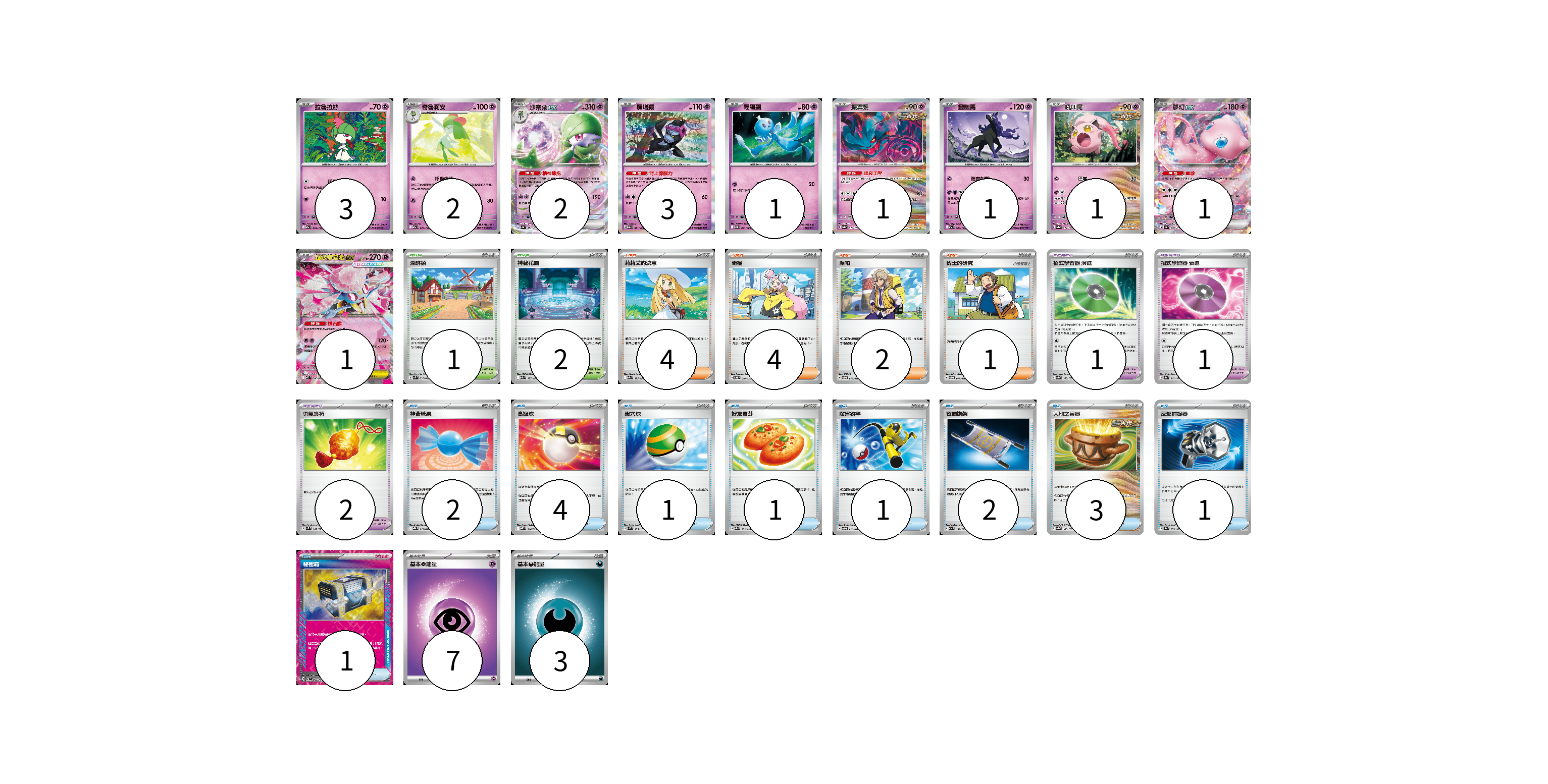 牌組構築方案 以此牌組為基礎新構築牌組 顯示卡面 顯示列表 寶可夢卡(16) 3 2 2 3 1 1 1 1 1 1 寶可夢道具(4) 1 1 2 物品卡(16) 2 4 1 1 1 2 3 1 1 支援者卡(11) 4 4 2 1 競技場卡(3) 1 2 能量卡(10) 7 3 寶可夢卡(16) 卡牌名稱 張數 卡牌名稱 張數 拉魯拉絲 M2a 069/193 03 奇魯莉安 M2a 070/193 02 沙奈朵ex SV4a 082/190 02 願增猿 M2a 081/193 03 輕飄飄 SV11W 041/086 01 振翼髮 SV8a 072/187 01 靈幽馬 M2a 080/193 01 吼叫尾 SV8a 071/187 01 夢幻ex SV4a 076/190 01 超級蒂安希ex MBD 006/022 01 寶可夢道具(4) 卡牌名稱 張數 卡牌名稱 張數 招式學習器 演進 SV8a 160/187 01 招式學習器 衰退 SV8a 161/187 01 勇氣護符 SVM 142/175 02 物品卡(16) 卡牌名稱 張數 卡牌名稱 張數 神奇糖果 MBG 013/022 02 高級球 MBD 014/022 04 巢穴球 SVM 133/175 01 好友寶芬 M2a 153/193 01 厲害釣竿 SVOD 010/020 01 夜間擔架 M2a 159/193 02 大地之容器 SV8a 143/187 03 反擊捕捉器 SV8a 139/187 01 秘密箱 SV6 092/101 01 支援者卡(11) 卡牌名稱 張數 卡牌名稱 張數 莉莉艾的決意 M2a 175/193 04 奇樹 SVOD 016/020 04 派帕 SVOD 018/020 02 博士的研究 SVOD 017/020 01 競技場卡(3) 卡牌名稱 張數 卡牌名稱 張數 深缽鎮 SVK 039/042 01 神秘花園 M2a 187/193 02 能量卡(10) 卡牌名稱 張數 卡牌名稱 張數 基本【超】能量 MBD PSY 07 基本【惡】能量 MBG DAR 03 以此牌組為基礎新構築牌組 牌組編碼 DfZHiX-LcmOTD-strzpi copy 列印牌組單 牌組編碼已複製 分享至SNS