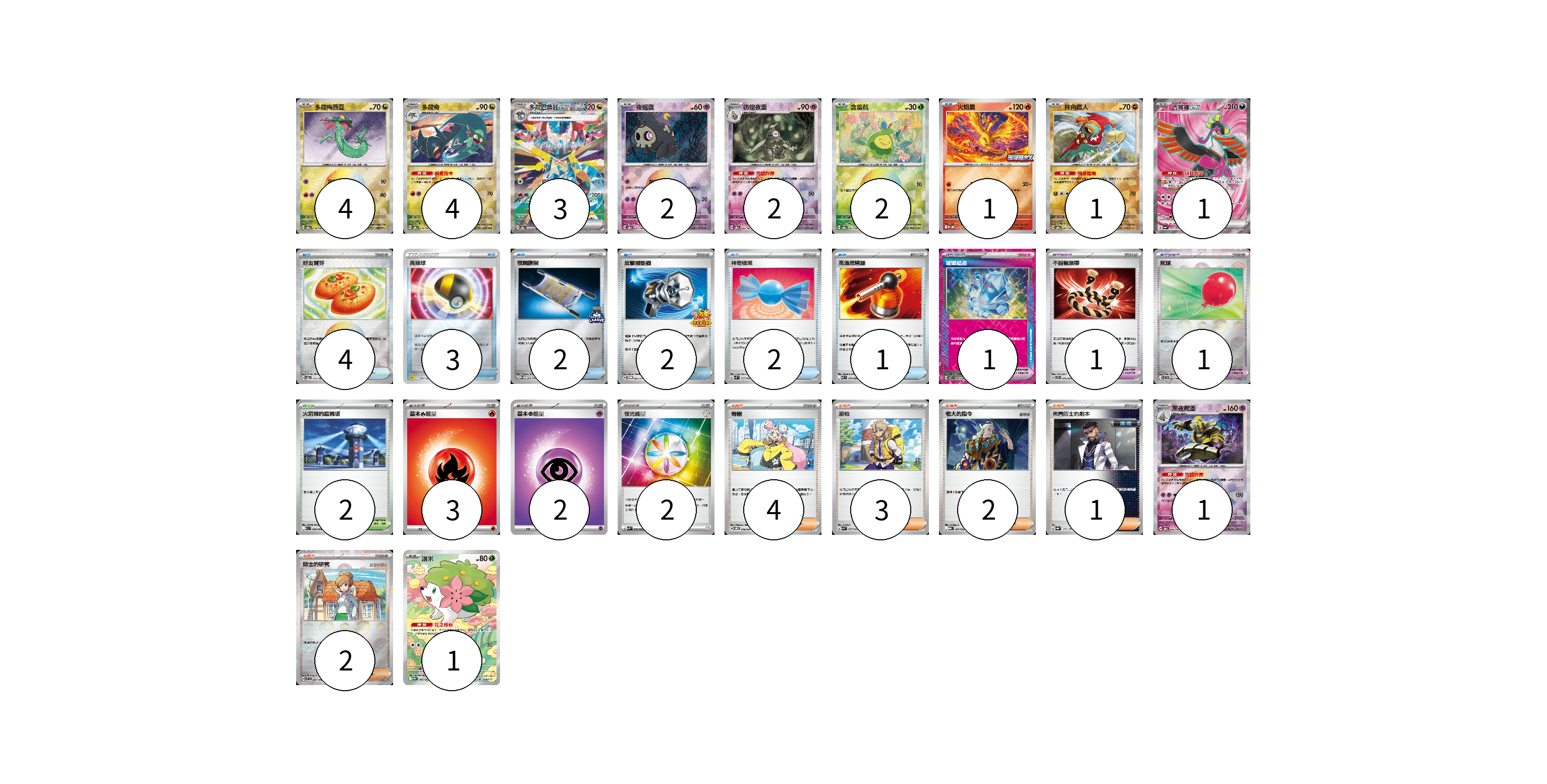 牌組構築方案 以此牌組為基礎新構築牌組 顯示卡面 顯示列表 寶可夢卡(22) 4 4 3 2 2 2 1 1 1 1 1 寶可夢道具(3) 1 1 1 物品卡(14) 4 3 2 2 2 1 支援者卡(12) 4 3 2 1 2 競技場卡(2) 2 能量卡(7) 3 2 2 寶可夢卡(22) 卡牌名稱 張數 卡牌名稱 張數 多龍梅西亞 SV8a 118/187 04 多龍奇 SV8a 119/187 04 多龍巴魯托ex SV8a 221/187 03 夜巡靈 SV8a 064/187 02 彷徨夜靈 SV8a 065/187 02 含羞苞 SV8a 001/187 02 火焰鳥 M-P 022/M-P 01 摔角鷹人 SV8a 084/187 01 吉雉雞ex SV6a 081/064 01 黑夜魔靈 SV8a 066/187 01 謝米 SV9a 066/063 01 寶可夢道具(3) 卡牌名稱 張數 卡牌名稱 張數 璀璨結晶 SV7 094/102 01 不服輸頭帶 SVTL 016/021 01 氣球 SV11B 082/086 01 物品卡(14) 卡牌名稱 張數 卡牌名稱 張數 好友寶芬 SV8a 147/187 04 高級球 SPZ 009/020 03 夜間擔架 SV-P 204/SV-P 02 反擊捕捉器 SV-P 083/SV-P 02 神奇糖果 SVK 019/042 02 高溫燃燒器 M2 074/080 01 支援者卡(12) 卡牌名稱 張數 卡牌名稱 張數 奇樹 SVOM 018/021 04 派帕 SVK 035/042 03 老大的指令 MBG 021/022 02 弗圖博士的劇本 SV8a 175/187 01 博士的研究 SV11B 084/086 02 競技場卡(2) 卡牌名稱 張數 卡牌名稱 張數 火箭隊的監視塔 SV10 096/098 02 能量卡(7) 卡牌名稱 張數 卡牌名稱 張數 基本【火】能量 M-P FIR 03 基本【超】能量 M-P PSY 02 夜光能量 SVK 042/042 02 以此牌組為基礎新構築牌組 牌組編碼 Dgqjok-lfamCY-EsBERq copy 列印牌組單 牌組編碼已複製 分享至SNS