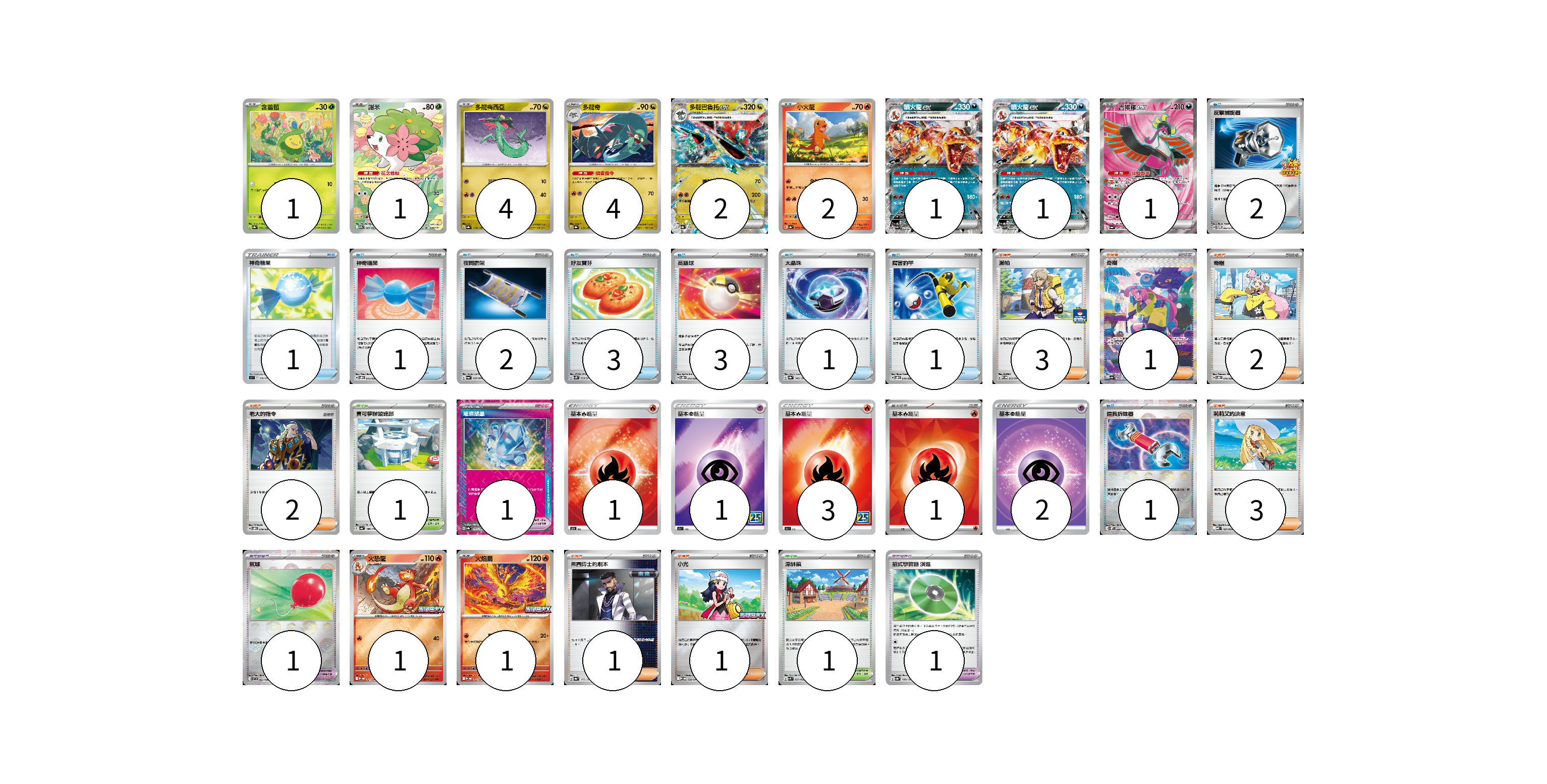 牌組構築方案 以此牌組為基礎新構築牌組 顯示卡面 顯示列表 寶可夢卡(19) 1 1 4 4 2 2 1 1 1 1 1 寶可夢道具(3) 1 1 1 物品卡(15) 2 1 1 2 3 3 1 1 1 支援者卡(13) 3 1 2 2 3 1 1 競技場卡(2) 1 1 能量卡(8) 1 1 3 1 2 寶可夢卡(19) 卡牌名稱 張數 卡牌名稱 張數 含羞苞 SV8a 001/187 01 謝米 SV9a 066/063 01 多龍梅西亞 SV8a 118/187 04 多龍奇 SV8a 119/187 04 多龍巴魯托ex SV8a 120/187 02 小火龍 SV4a 025/190 02 噴火龍ex SV4a 115/190 01 噴火龍ex SV3 066/108 01 吉雉雞ex SV6a 081/064 01 火恐龍 M-P 021/M-P 01 火焰鳥 M-P 022/M-P 01 寶可夢道具(3) 卡牌名稱 張數 卡牌名稱 張數 璀璨結晶 SV8a 152/187 01 氣球 SV11B 082/086 01 招式學習器 演進 SV8a 160/187 01 物品卡(15) 卡牌名稱 張數 卡牌名稱 張數 反擊捕捉器 SV-P 083/SV-P 02 神奇糖果 SI 376/414 01 神奇糖果 SVOD 013/020 01 夜間擔架 SV6a 056/064 02 好友寶芬 SV5K 063/071 03 高級球 SVOD 012/020 03 太晶珠 SV8a 145/187 01 厲害釣竿 SVOD 010/020 01 道具拆除器 SV11W 080/086 01 支援者卡(13) 卡牌名稱 張數 卡牌名稱 張數 派帕 SV-P 213/SV-P 03 奇樹 SV4a 350/190 01 奇樹 SVOD 016/020 02 老大的指令 SVOD 019/020 02 莉莉艾的決意 MBD 021/022 03 弗圖博士的劇本 SV8a 175/187 01 小光 M-P 028/M-P 01 競技場卡(2) 卡牌名稱 張數 卡牌名稱 張數 寶可夢聯盟總部 SV4a 186/190 01 深缽鎮 SVK 039/042 01 能量卡(8) 卡牌名稱 張數 卡牌名稱 張數 基本【火】能量 SO FIR 01 基本超能量 S8a PSY 01 基本火能量 S8a FIR 03 基本【火】能量 SVK FIR 01 基本【超】能量 SI PSY 02 以此牌組為基礎新構築牌組 牌組編碼 DhZnto-jxFVKc-fveZAs copy 列印牌組單 牌組編碼已複製 分享至SNS