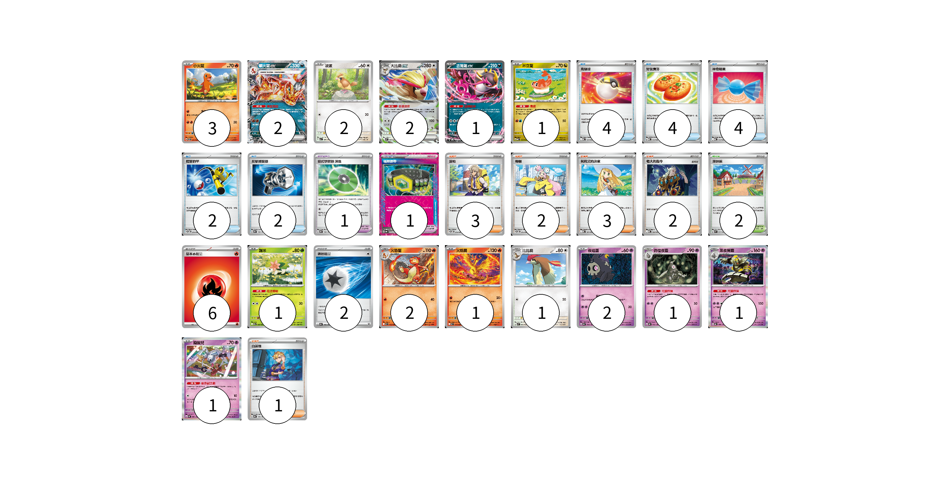 牌組構築方案 以此牌組為基礎新構築牌組 顯示卡面 顯示列表 寶可夢卡(21) 3 2 2 2 1 1 1 2 1 1 2 1 1 1 寶可夢道具(2) 1 1 物品卡(16) 4 4 4 2 2 支援者卡(11) 3 2 3 2 1 競技場卡(2) 2 能量卡(8) 6 2 寶可夢卡(21) 卡牌名稱 張數 卡牌名稱 張數 小火龍 SVTL 001/021 03 噴火龍ex SVTL 006/021 02 波波 SV3 087/108 02 大比鳥ex SVK 005/042 02 吉雉雞ex SVOD 004/020 01 米立龍 MBD 010/022 01 謝米 SV9a 006/063 01 火恐龍 M2 012/080 02 火焰鳥 M2 014/080 01 比比鳥 SVK 004/042 01 夜巡靈 SV8a 064/187 02 彷徨夜靈 SV8a 065/187 01 黑夜魔靈 SV8a 066/187 01 鑰圈兒 SV4a 087/190 01 寶可夢道具(2) 卡牌名稱 張數 卡牌名稱 張數 招式學習器 演進 SV8a 160/187 01 極限腰帶 SV8a 159/187 01 物品卡(16) 卡牌名稱 張數 卡牌名稱 張數 高級球 MBD 014/022 04 好友寶芬 MBD 013/022 04 神奇糖果 MBG 013/022 04 厲害釣竿 SVOD 010/020 02 反擊捕捉器 SV8a 139/187 02 支援者卡(11) 卡牌名稱 張數 卡牌名稱 張數 派帕 SVOD 018/020 03 奇樹 SVOD 016/020 02 莉莉艾的決意 MBD 021/022 03 老大的指令 MBD 020/022 02 白蕾雅 SV8a 176/187 01 競技場卡(2) 卡牌名稱 張數 卡牌名稱 張數 深缽鎮 SVK 039/042 02 能量卡(8) 卡牌名稱 張數 卡牌名稱 張數 基本火能量 sv-p FIR 06 噴射能量 SV8a 185/187 02 以此牌組為基礎新構築牌組 牌組編碼 DjjsSF-GCKXmE-OMuQzo copy 列印牌組單 牌組編碼已複製 分享至SNS