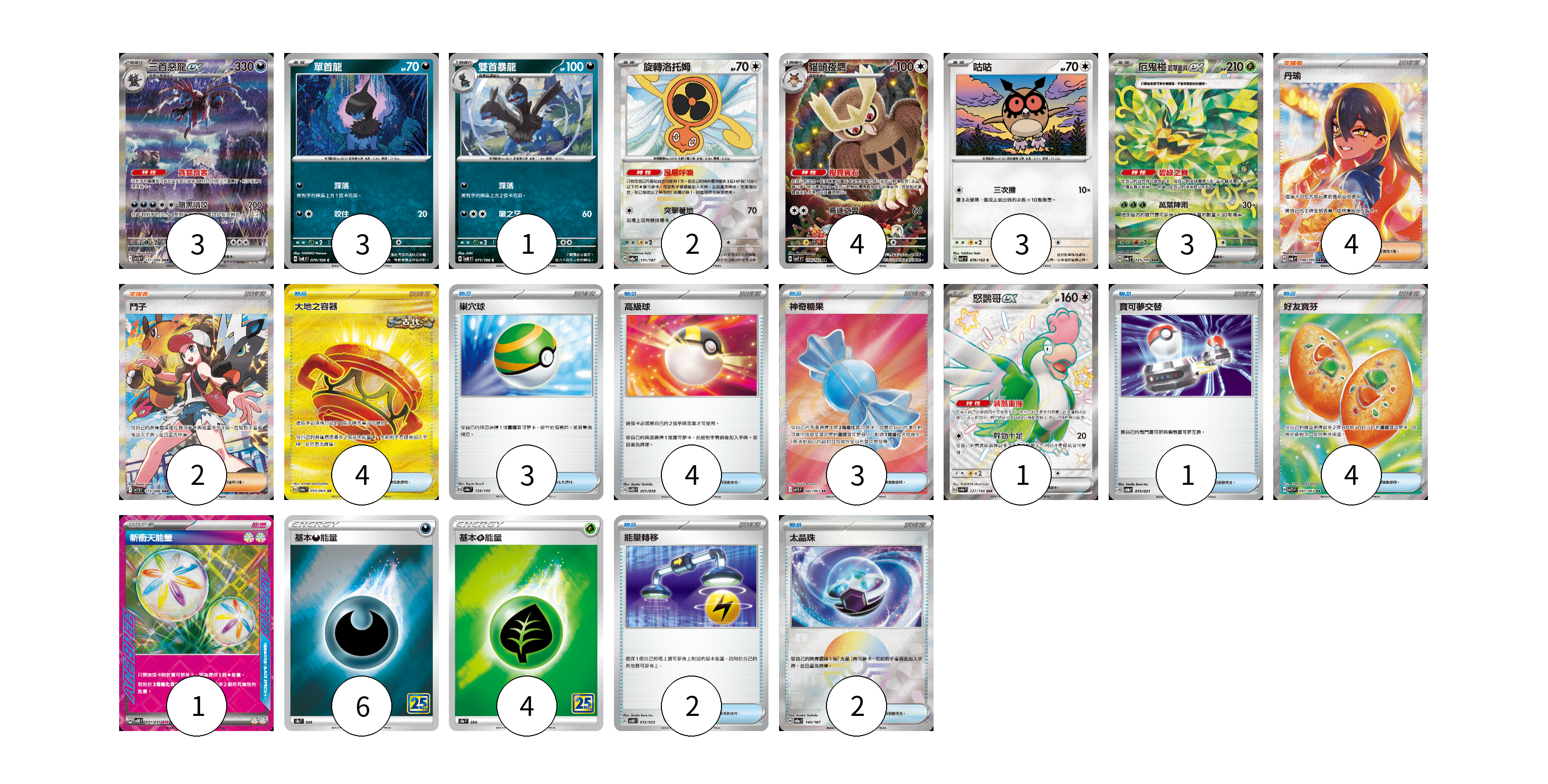 牌組構築方案 以此牌組為基礎新構築牌組 顯示卡面 顯示列表 寶可夢卡(20) 3 3 1 2 4 3 3 1 物品卡(23) 4 3 4 3 1 4 2 2 支援者卡(6) 4 2 能量卡(11) 1 6 4 寶可夢卡(20) 卡牌名稱 張數 卡牌名稱 張數 三首惡龍ex SV11W 171/086 03 單首龍 SV8 070/106 03 雙首暴龍 SV8 071/106 01 旋轉洛托姆 SV8a 131/187 02 貓頭夜鷹 SV7 114/102 04 咕咕 SV7 076/102 03 厄鬼椪 碧草面具ex SV6 125/101 03 怒鸚哥ex SV4a 337/190 01 物品卡(23) 卡牌名稱 張數 卡牌名稱 張數 大地之容器 SV6a 093/064 04 巢穴球 SV4a 159/190 03 高級球 SVTH 011/018 04 神奇糖果 M1S 082/063 03 寶可夢交替 SVOM 015/021 01 好友寶芬 M1S 081/063 04 能量轉移 SVAM 012/023 02 太晶珠 SV8a 145/187 02 支援者卡(6) 卡牌名稱 張數 卡牌名稱 張數 丹瑜 SV6 130/101 04 鬥子 SV11W 173/086 02 能量卡(11) 卡牌名稱 張數 卡牌名稱 張數 新衝天能量 SV5K 071/071 01 基本惡能量 S8a DAR 06 基本草能量 S8a GRA 04 以此牌組為基礎新構築牌組 牌組編碼 DlqSAa-IAowVo-XVWltT copy 列印牌組單 牌組編碼已複製 分享至SNS