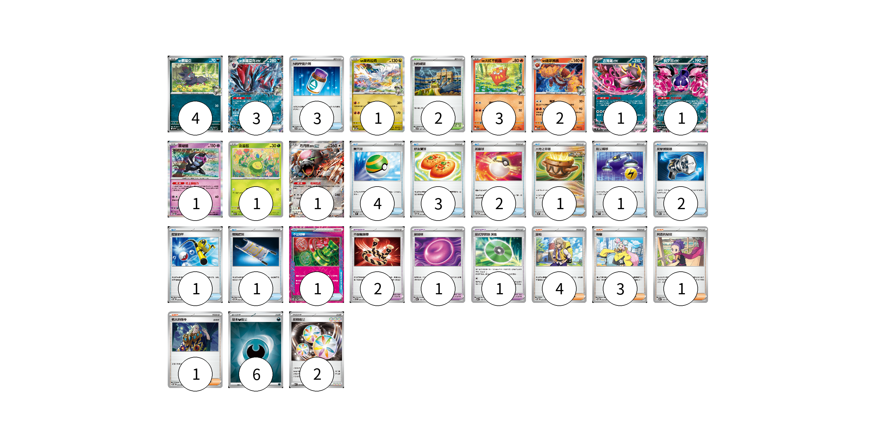 牌組構築方案 以此牌組為基礎新構築牌組 顯示卡面 顯示列表 寶可夢卡(18) 4 3 1 3 2 1 1 1 1 1 寶可夢道具(4) 2 1 1 物品卡(19) 3 4 3 2 1 1 2 1 1 1 支援者卡(9) 4 3 1 1 競技場卡(2) 2 能量卡(8) 6 2 寶可夢卡(18) 卡牌名稱 張數 卡牌名稱 張數 N的索羅亞 SV9 060/100 04 N的索羅亞克ex SV9 061/100 03 N的萊希拉姆 SV9 074/100 01 N的火紅不倒翁 SV9 015/100 03 N的達摩狒狒 SV9 016/100 02 吉雉雞ex SVOD 004/020 01 桃歹郎ex SV6a 039/064 01 願增猿 SV6 055/101 01 含羞苞 SV8a 001/187 01 月月熊 赫月 ex SV5a 052/066 01 寶可夢道具(4) 卡牌名稱 張數 卡牌名稱 張數 不服輸頭帶 SVTL 016/021 02 鎖鏈糬 SV8a 154/187 01 招式學習器 演進 SV8a 160/187 01 物品卡(19) 卡牌名稱 張數 卡牌名稱 張數 N的PP提升劑 SV9 089/100 03 巢穴球 SVM 133/175 04 好友寶芬 SVOD 011/020 03 高級球 SVOD 012/020 02 大地之容器 SV8a 143/187 01 能量轉移 SVM 127/175 01 反擊捕捉器 SV8a 139/187 02 厲害釣竿 SVOD 010/020 01 夜間擔架 SVOM 016/021 01 不公印章 SV5a 053/066 01 支援者卡(9) 卡牌名稱 張數 卡牌名稱 張數 派帕 SVOD 018/020 04 奇樹 SVOD 016/020 03 阿杏的秘招 SV8a 166/187 01 老大的指令 SVOD 019/020 01 競技場卡(2) 卡牌名稱 張數 卡牌名稱 張數 N的城堡 SV9 097/100 02 能量卡(8) 卡牌名稱 張數 卡牌名稱 張數 基本【惡】能量 SVOM DAR 06 反轉能量 SVK 041/042 02 以此牌組為基礎新構築牌組 牌組編碼 Dptmjp-BsBZNK-qysHxG copy 列印牌組單 牌組編碼已複製 分享至SNS