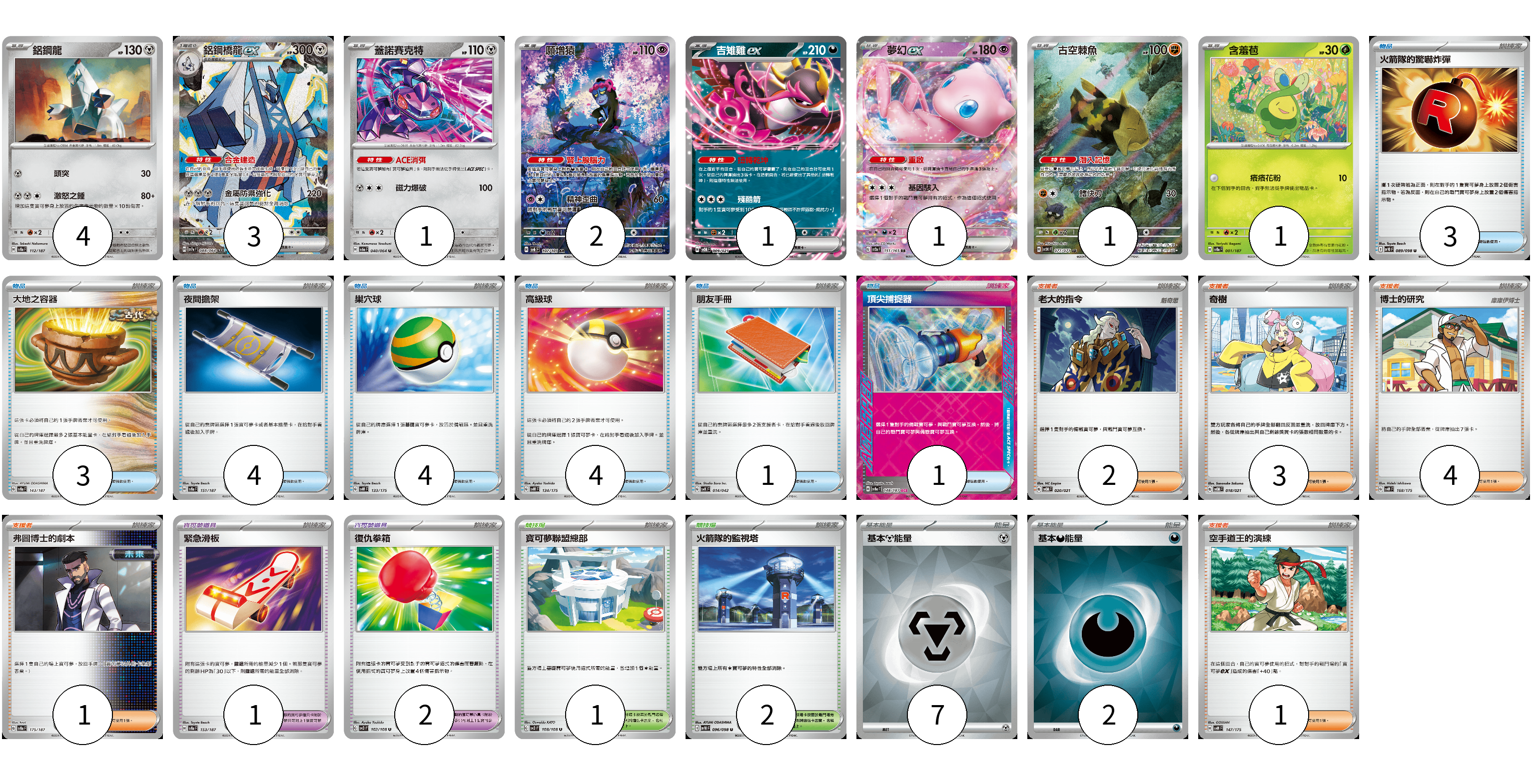牌組構築方案 以此牌組為基礎新構築牌組 顯示卡面 顯示列表 寶可夢卡(14) 4 3 1 2 1 1 1 1 寶可夢道具(3) 1 2 物品卡(20) 3 3 4 4 4 1 1 支援者卡(11) 2 3 4 1 1 競技場卡(3) 1 2 能量卡(9) 7 2 寶可夢卡(14) 卡牌名稱 張數 卡牌名稱 張數 鋁鋼龍 SV8a 112/187 04 鋁鋼橋龍ex SV7a 088/064 03 蓋諾賽克特 SV6a 040/064 01 願增猿 SV6 107/101 02 吉雉雞ex SVOM 009/021 01 夢幻ex SV2a 151/165 01 古空棘魚 SV5K 077/071 01 含羞苞 SV8a 001/187 01 寶可夢道具(3) 卡牌名稱 張數 卡牌名稱 張數 緊急滑板 SV8a 153/187 01 復仇拳箱 SV3 102/108 02 物品卡(20) 卡牌名稱 張數 卡牌名稱 張數 火箭隊的驚嚇炸彈 SV10 089/098 03 大地之容器 SV8a 143/187 03 夜間擔架 SV8a 151/187 04 巢穴球 SVM 133/175 04 高級球 SVM 134/175 04 朋友手冊 SVK 014/042 01 頂尖捕捉器 SV8a 148/187 01 支援者卡(11) 卡牌名稱 張數 卡牌名稱 張數 老大的指令 SVOM 020/021 02 奇樹 SVOM 018/021 03 博士的研究 SVM 168/175 04 弗圖博士的劇本 SV8a 175/187 01 空手道王的演練 SVM 147/175 01 競技場卡(3) 卡牌名稱 張數 卡牌名稱 張數 寶可夢聯盟總部 SV3 108/108 01 火箭隊的監視塔 SV10 096/098 02 能量卡(9) 卡牌名稱 張數 卡牌名稱 張數 基本【鋼】能量 SVOD MET 07 基本【惡】能量 SVOM DAR 02 以此牌組為基礎新構築牌組 牌組編碼 DrTkCW-dGXsUc-oMpPiB copy 列印牌組單 牌組編碼已複製 分享至SNS